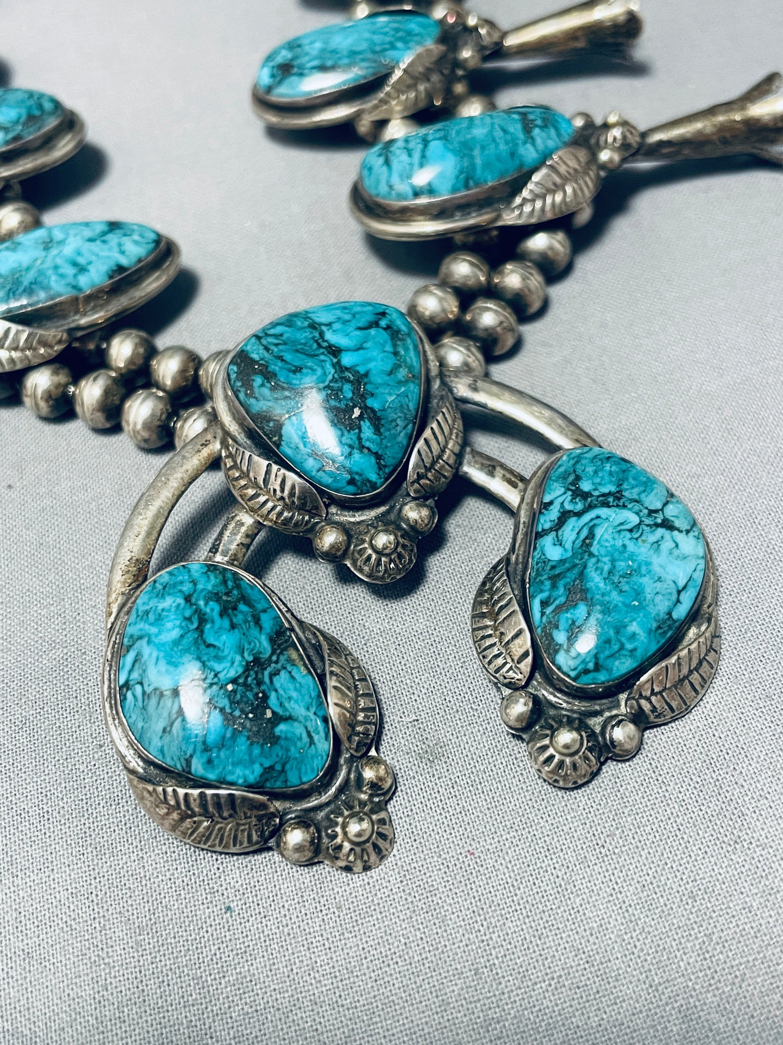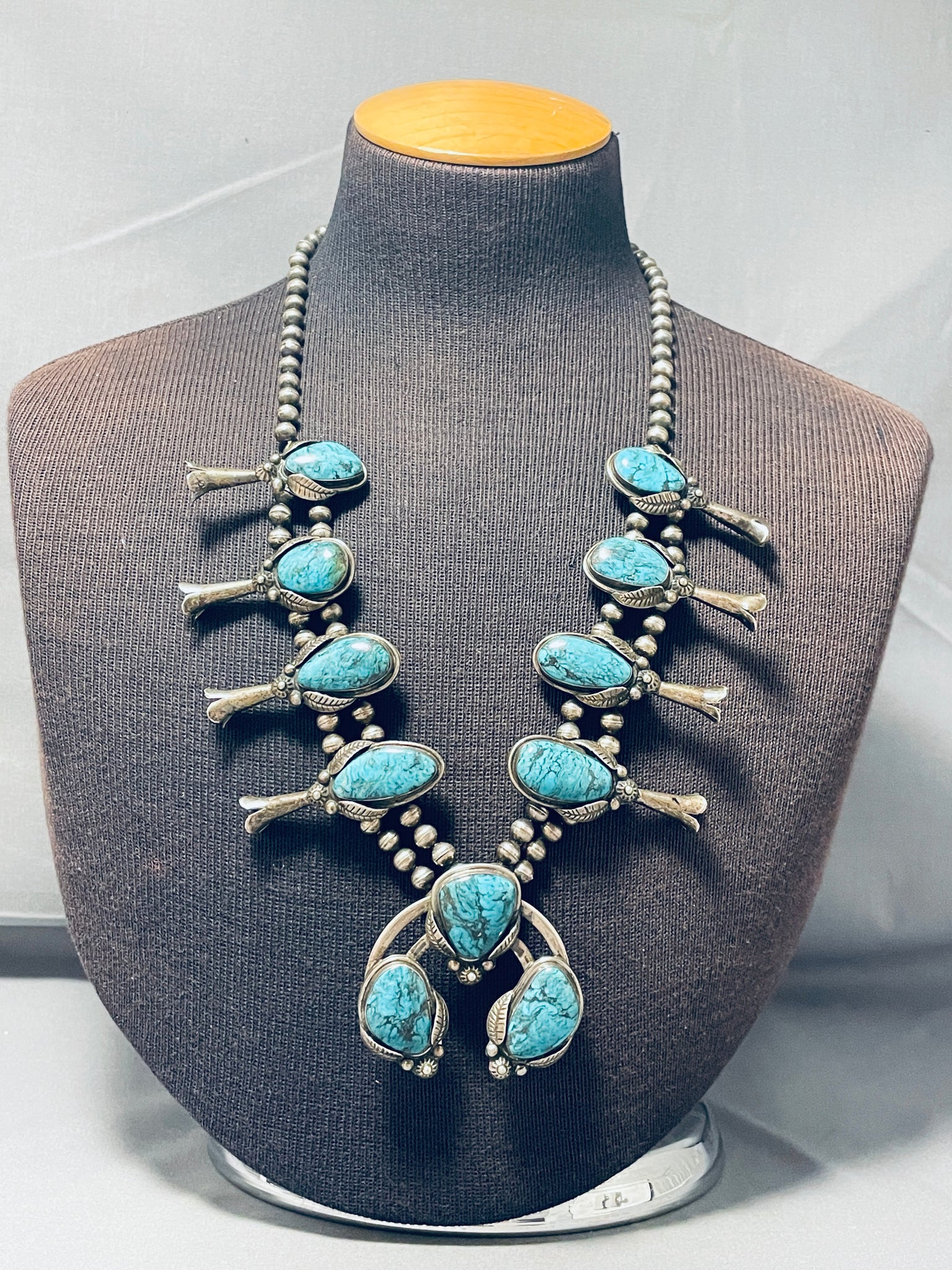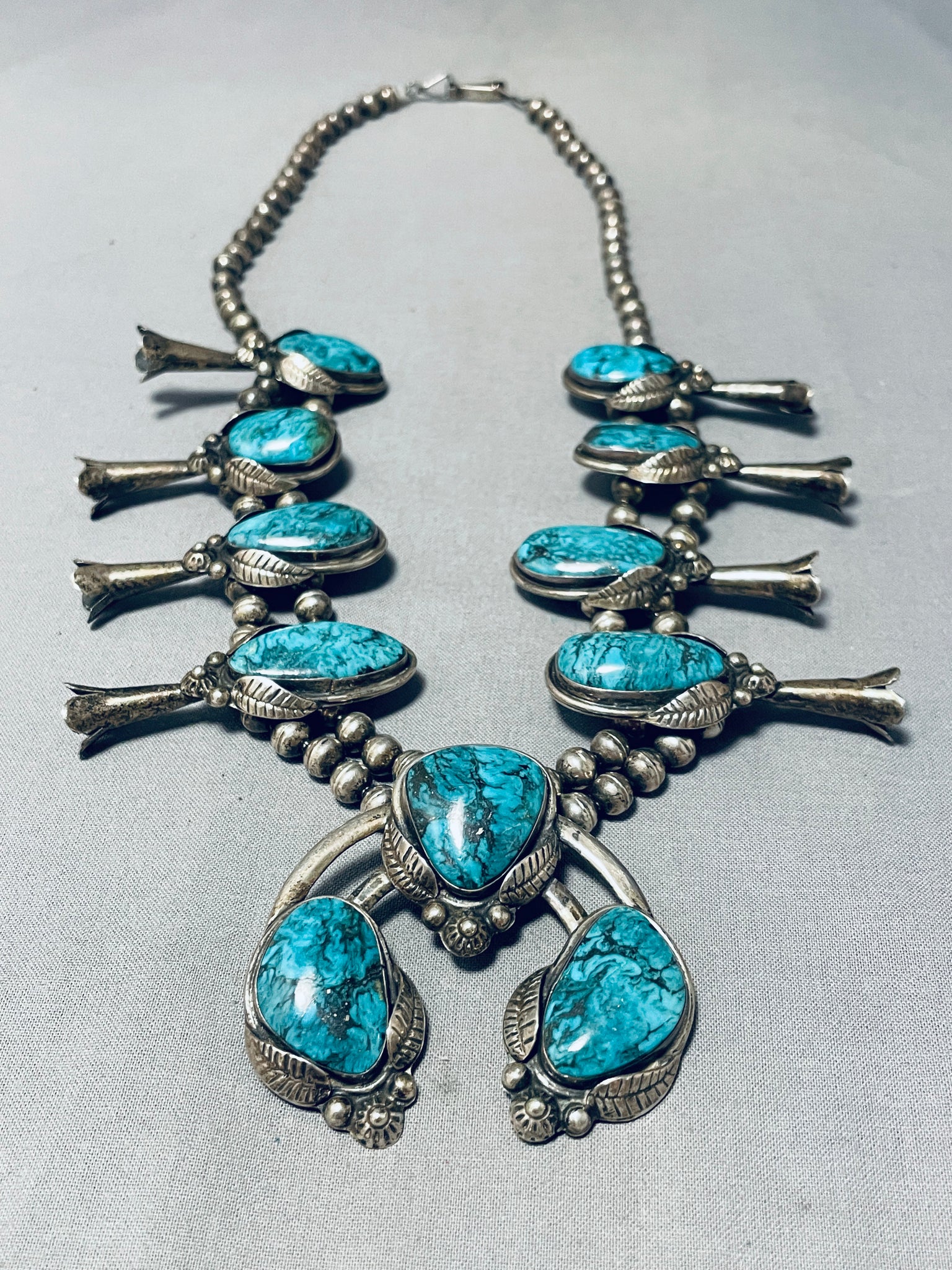 Incredible Vintage Native American Navajo Turquoise Sterling Silver Squash Blossom Necklace
