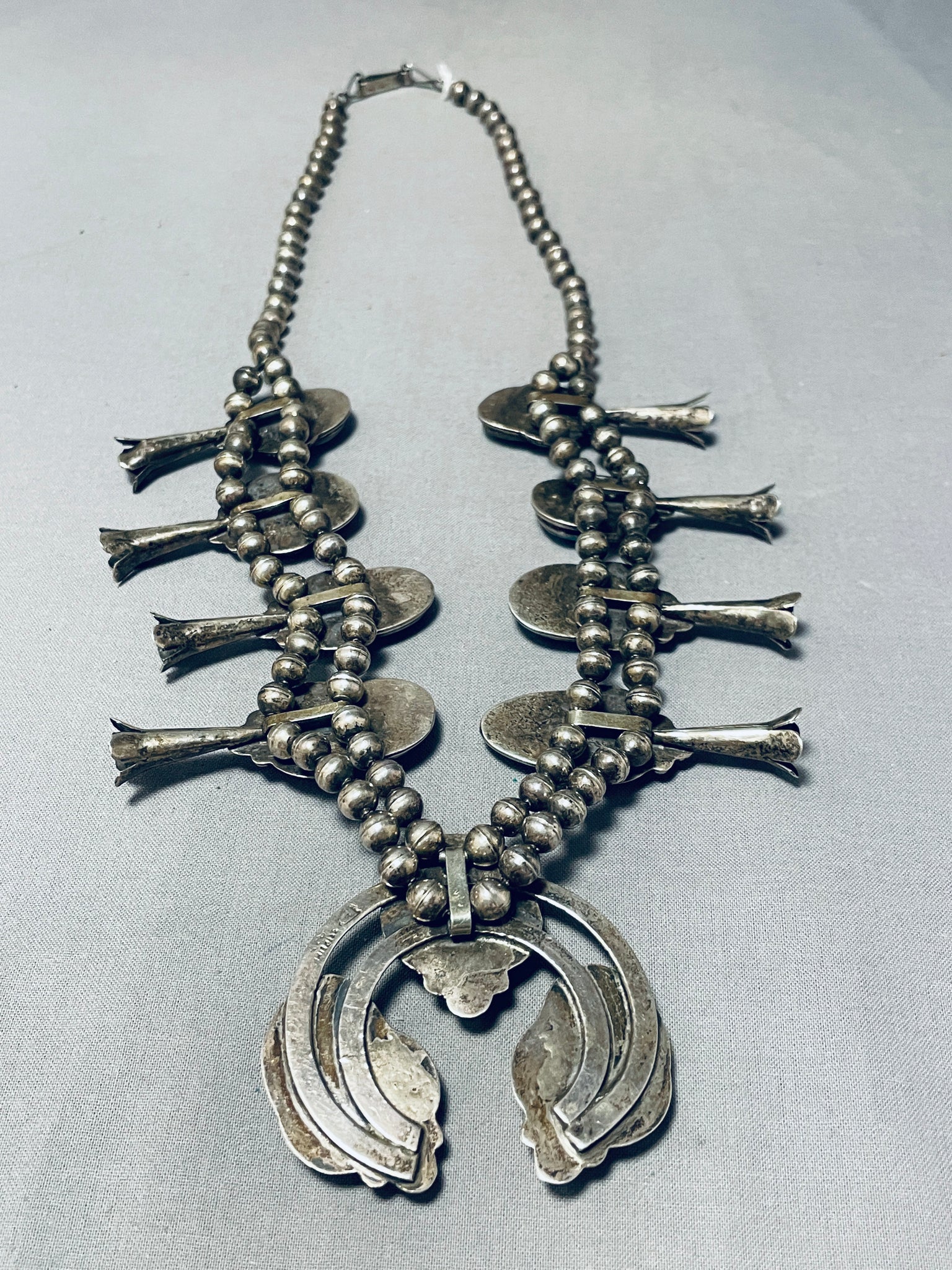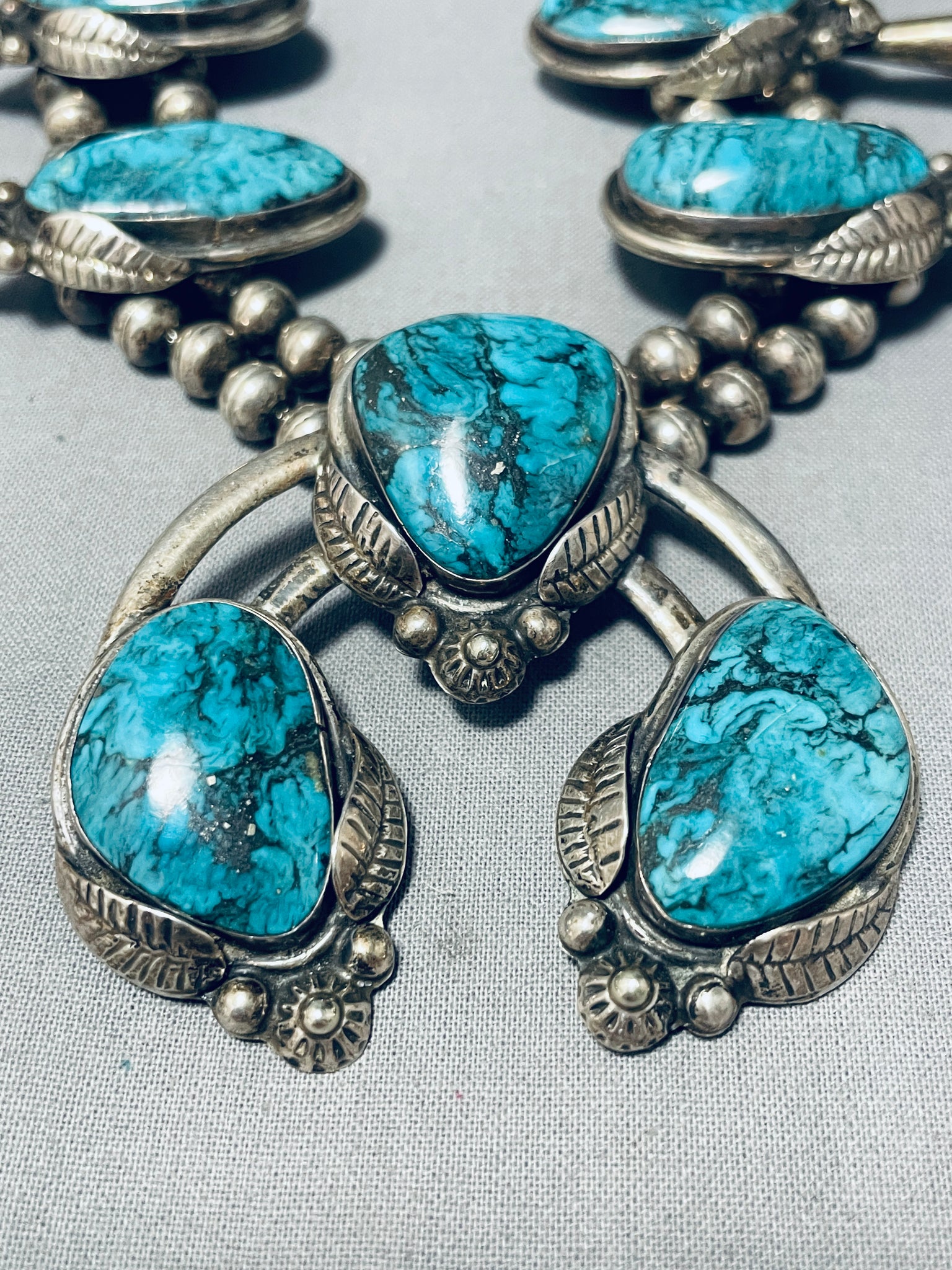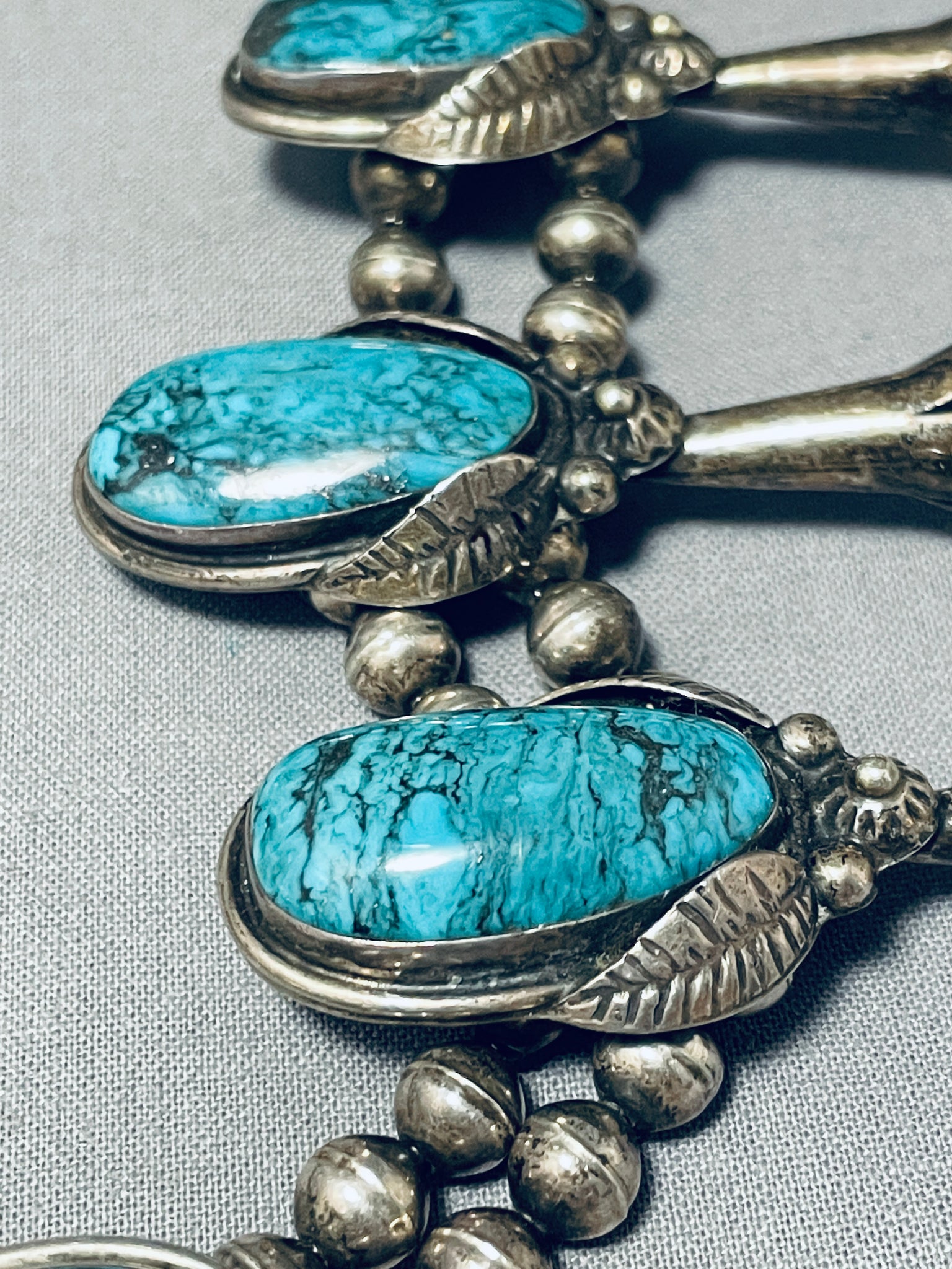 Incredible Vintage Native American Navajo Turquoise Sterling Silver Squash Blossom Necklace