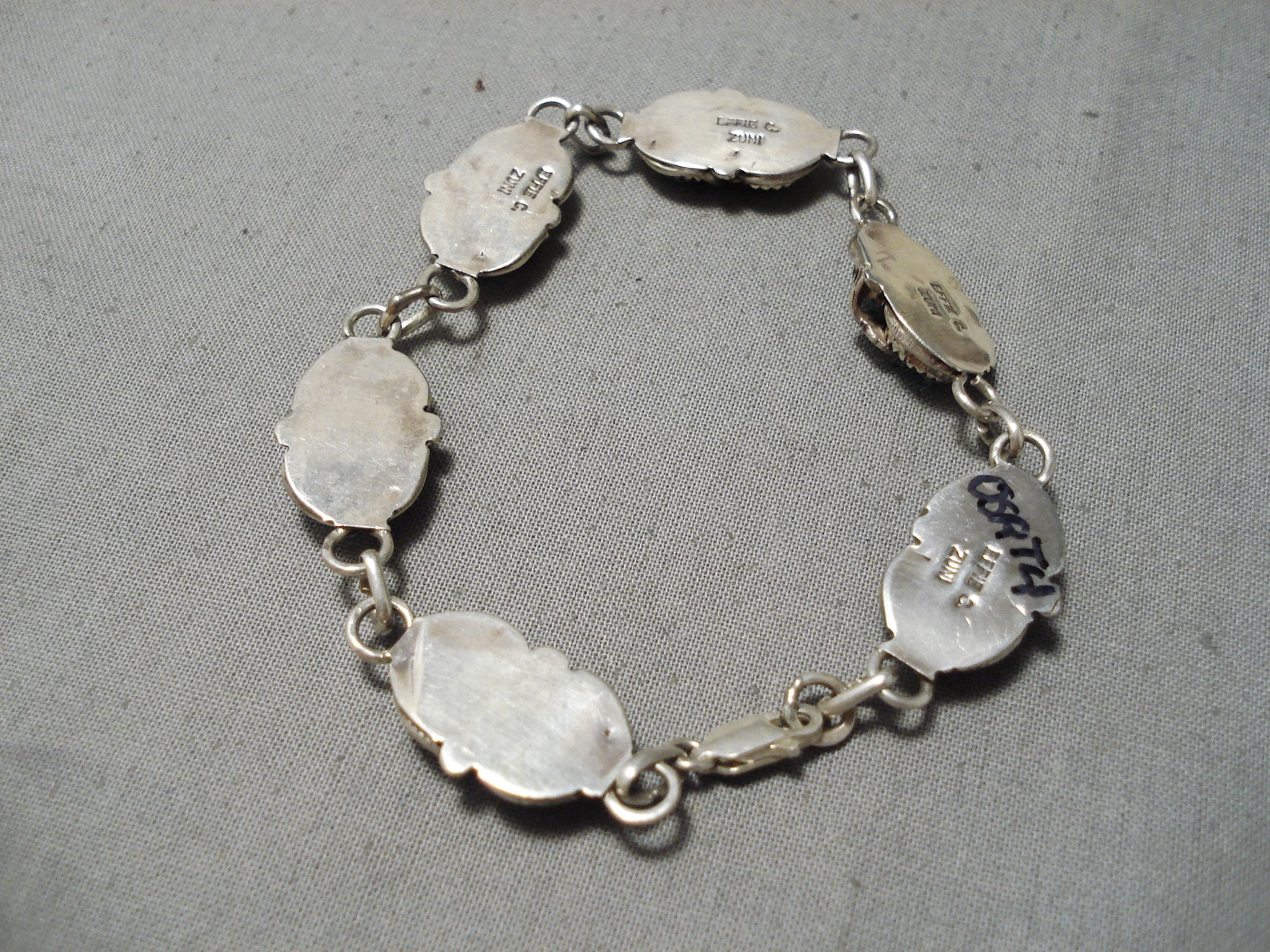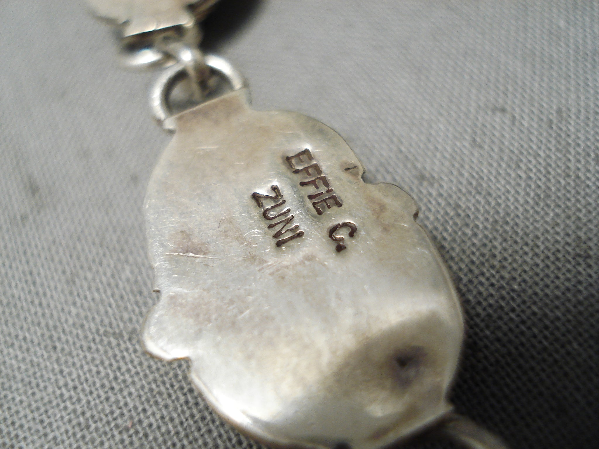 A fascinating vintage Zuni silver bracelet. Creating this unique linked bracelet, we have 6 stations - each of dual Kingman turquoise stones with their own slithering silver snake - with inlay turquoise eyes! Quite a picturesque look! The width of the bracelet measures around 1/2". Signed by Zuni artist, Effie Calavaza. Sterling silver. The inside end to end measures around 8". Sturdy 16 grams.