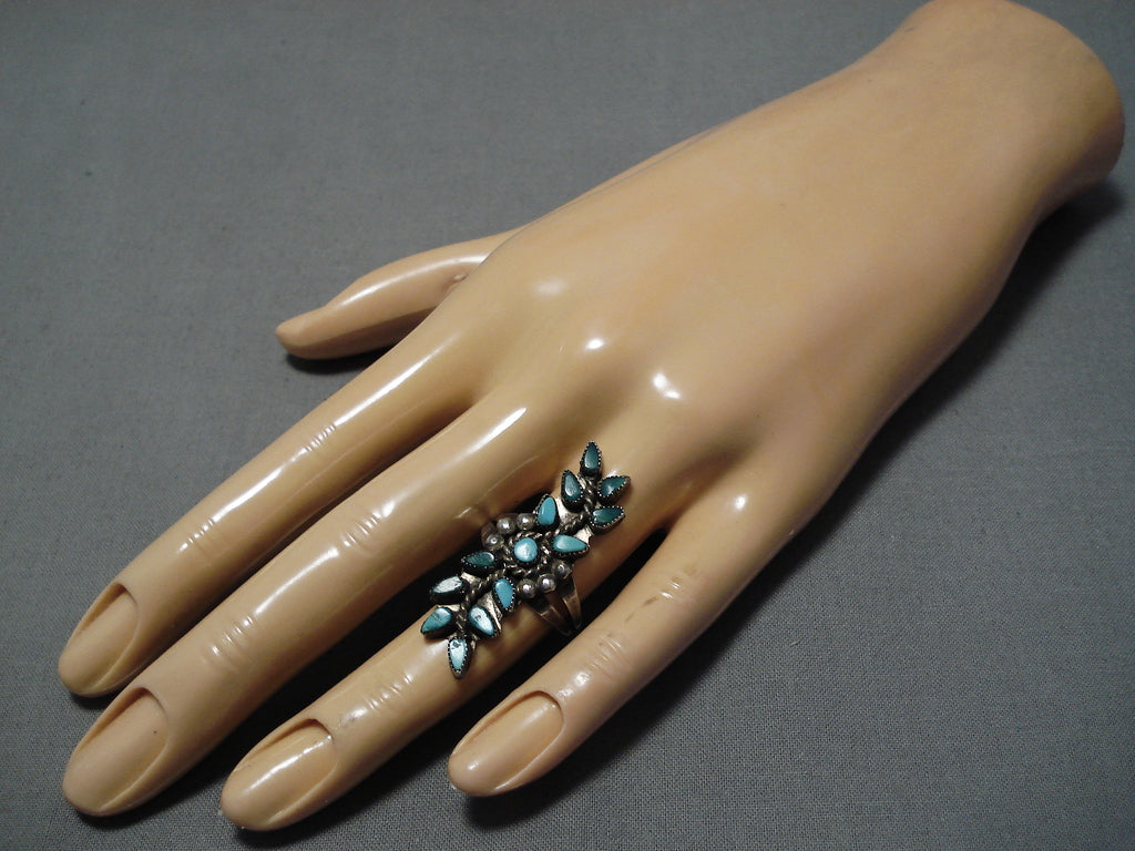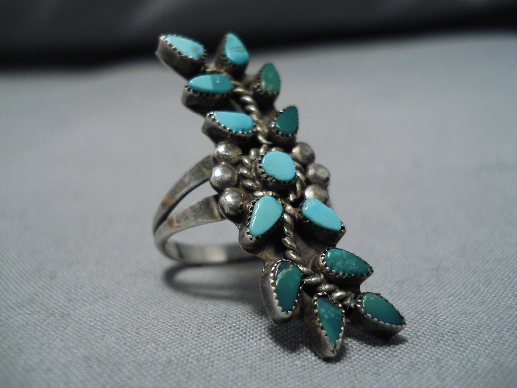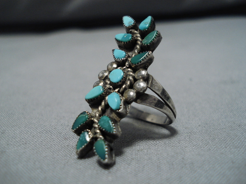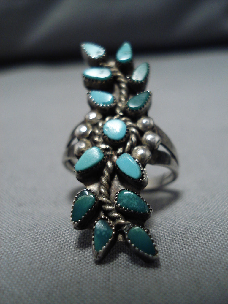 Here we have an incredible vintage Navajo silver ring. How about these 12 teardrop shape green and blue turquoise stones? With silver rope and beads, the artist has arranged them in a beautiful branch design that even mother nature would love! The ring face measures around 1-1/2" x 3/4". The ring size is around 8. Sterling silver. Sturdy 6 grams.