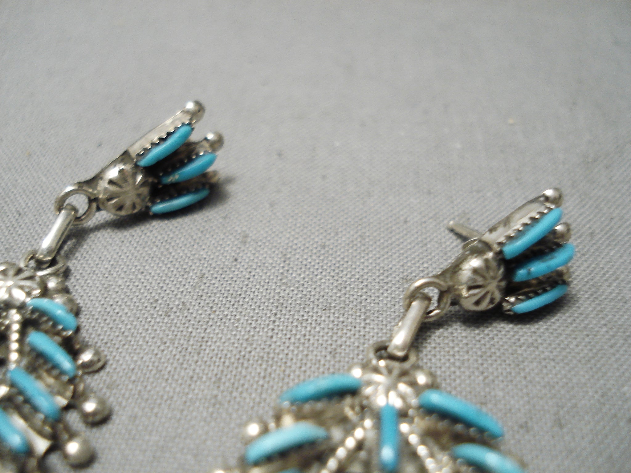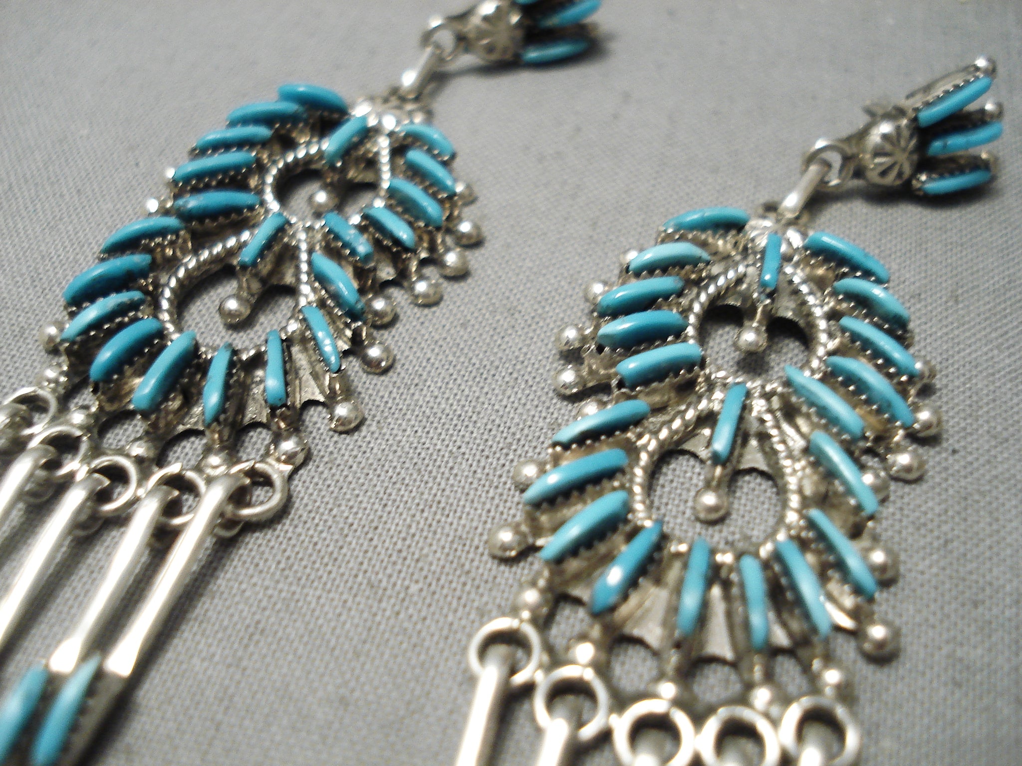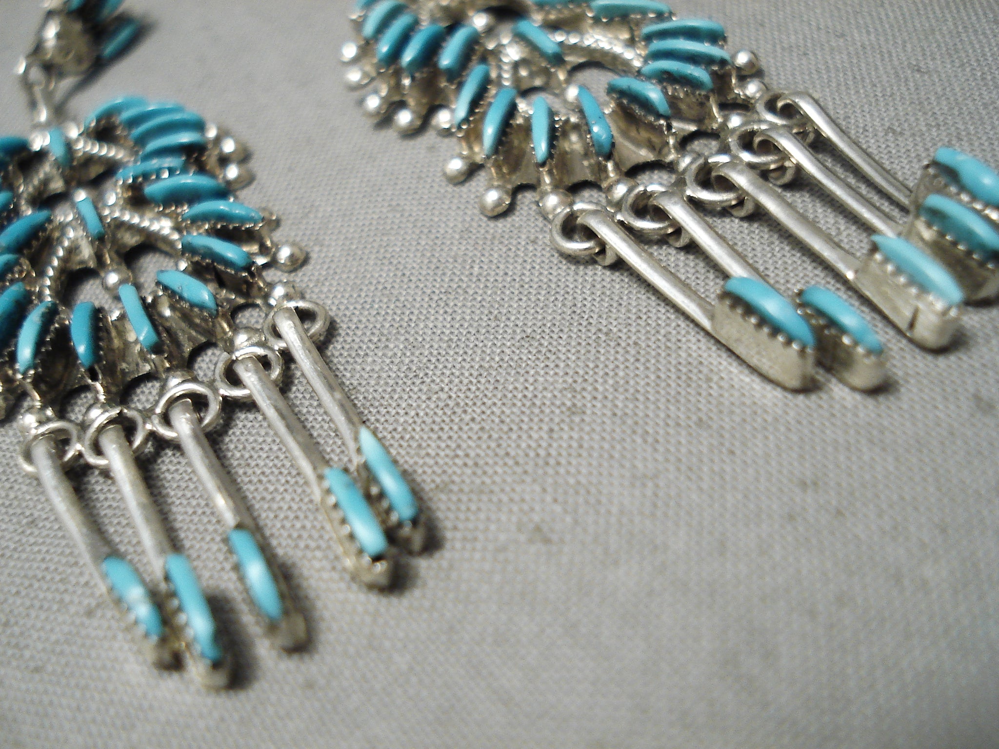 Incredible Vintage Zuni Native American Long Turquoise Sterling Silver Earrings