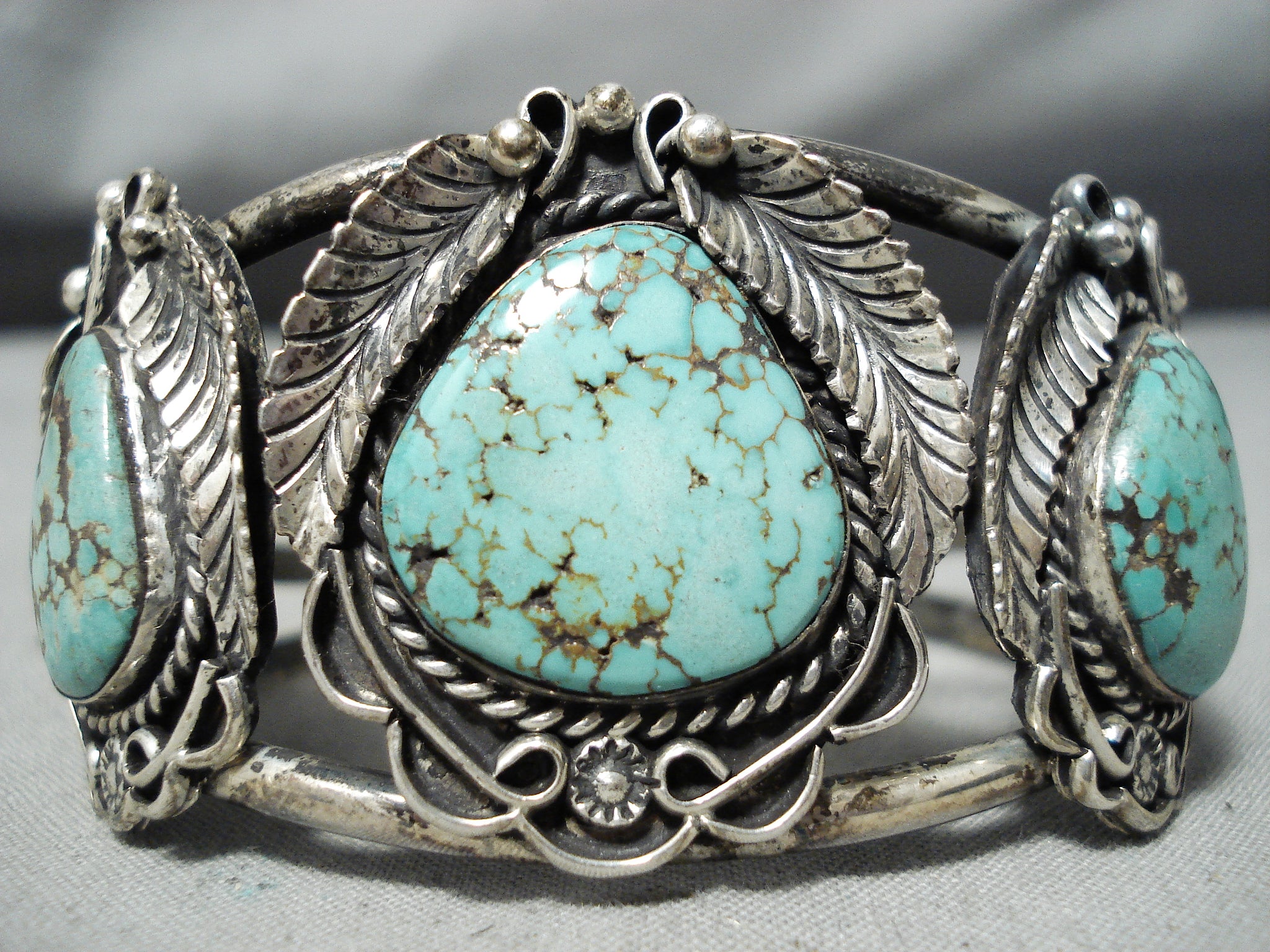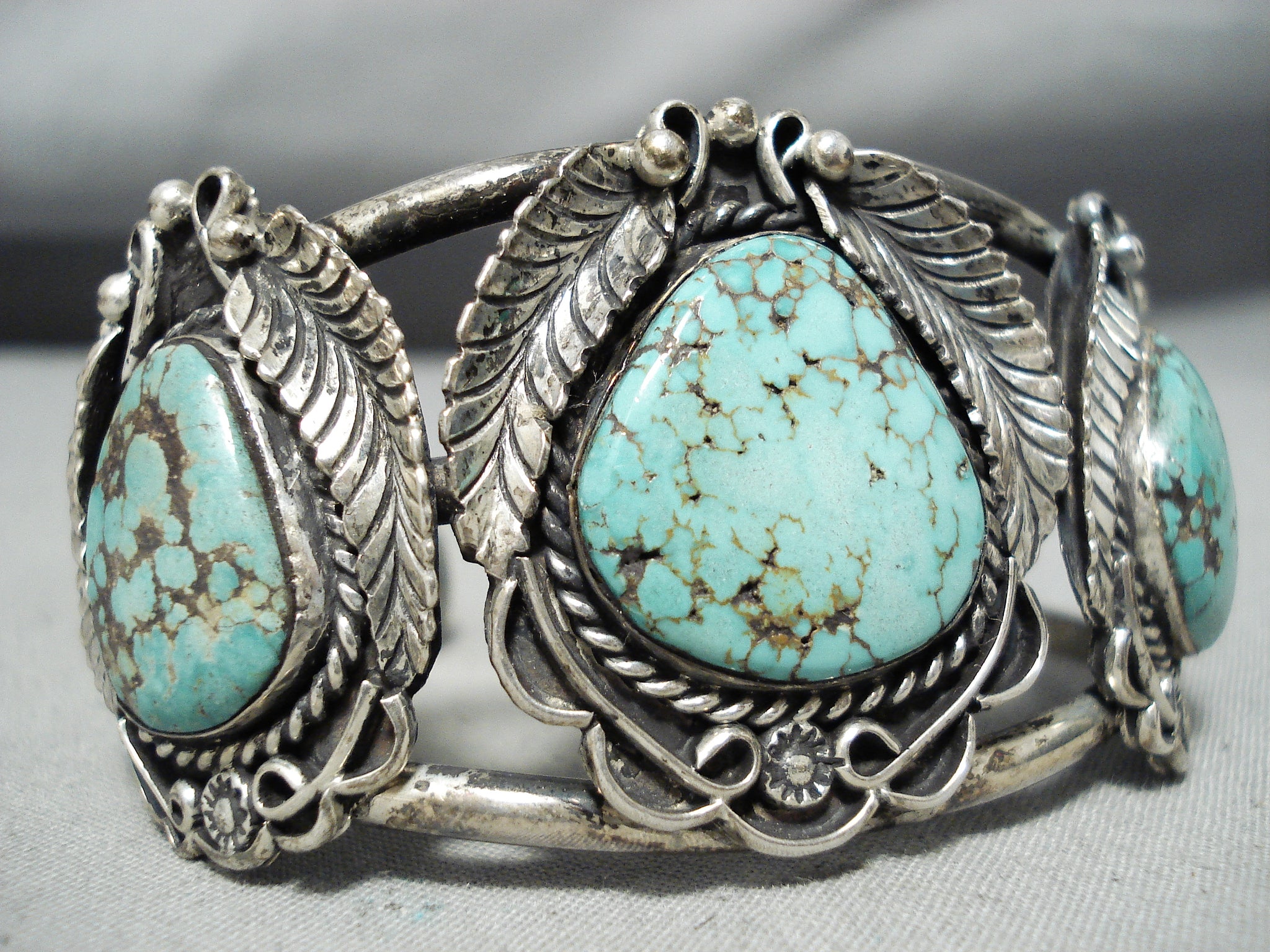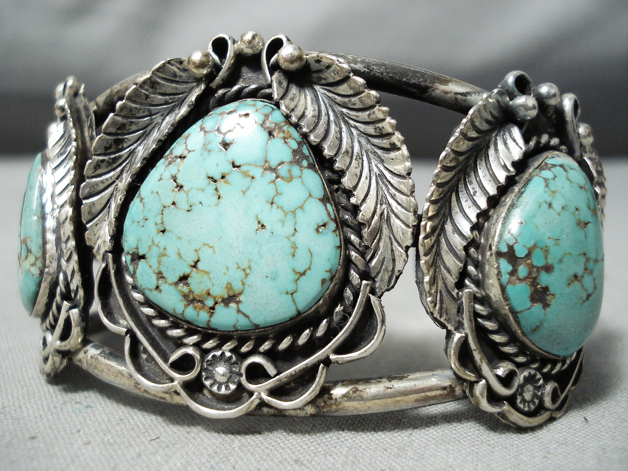 Intense Vintage Native American Navajo Carico Lake Turquoise Sterling Silver Leaf Bracelet
