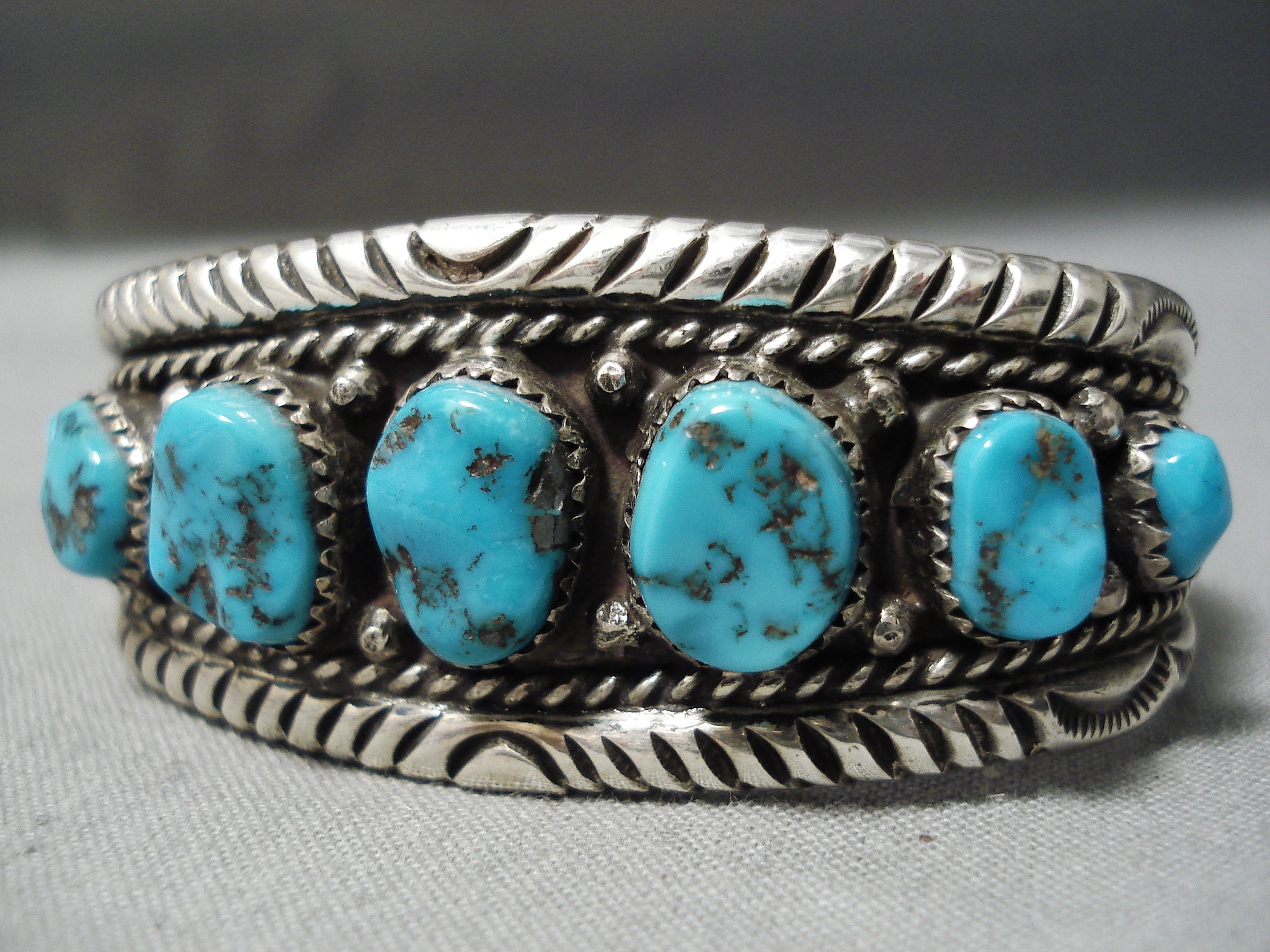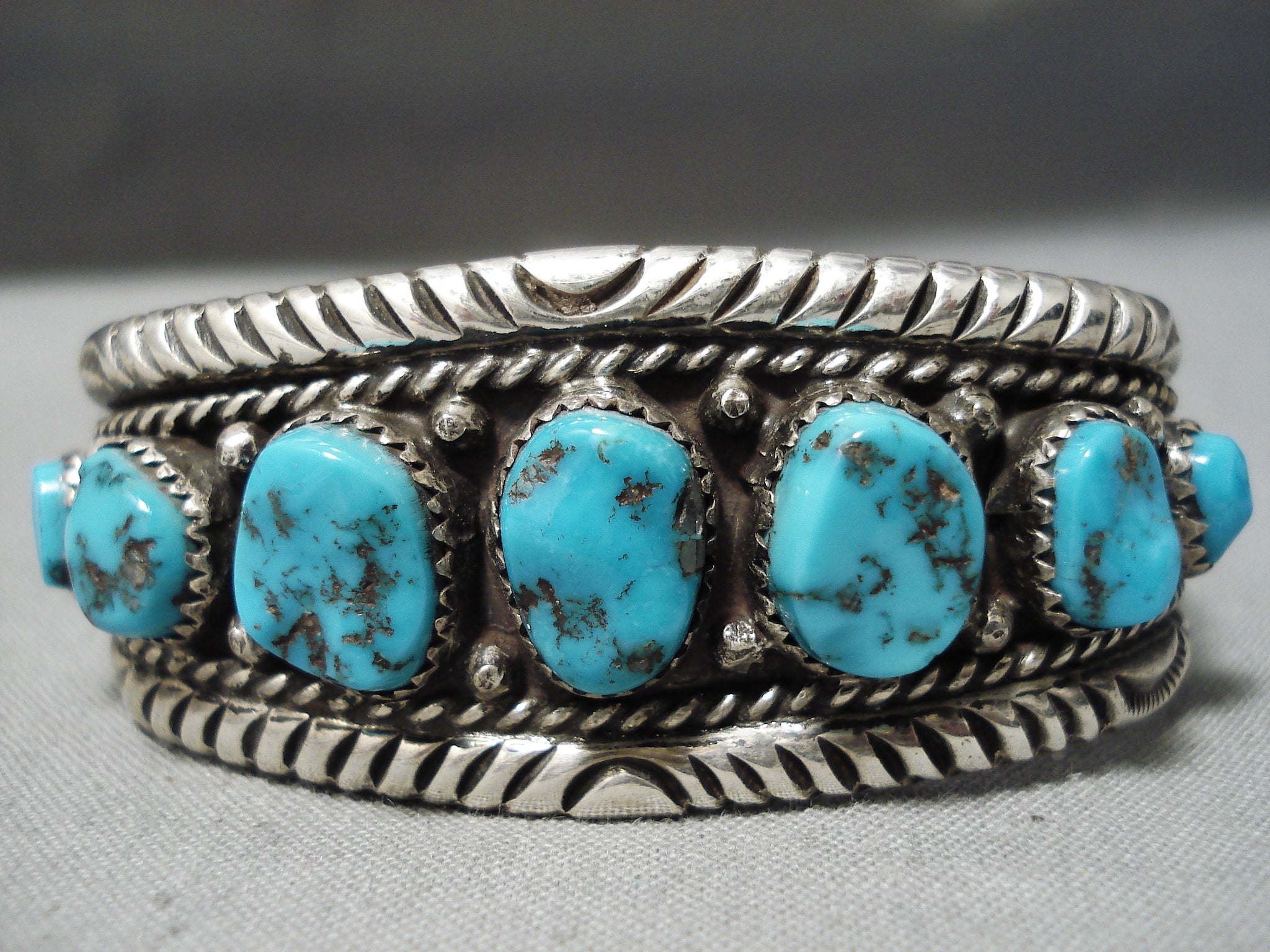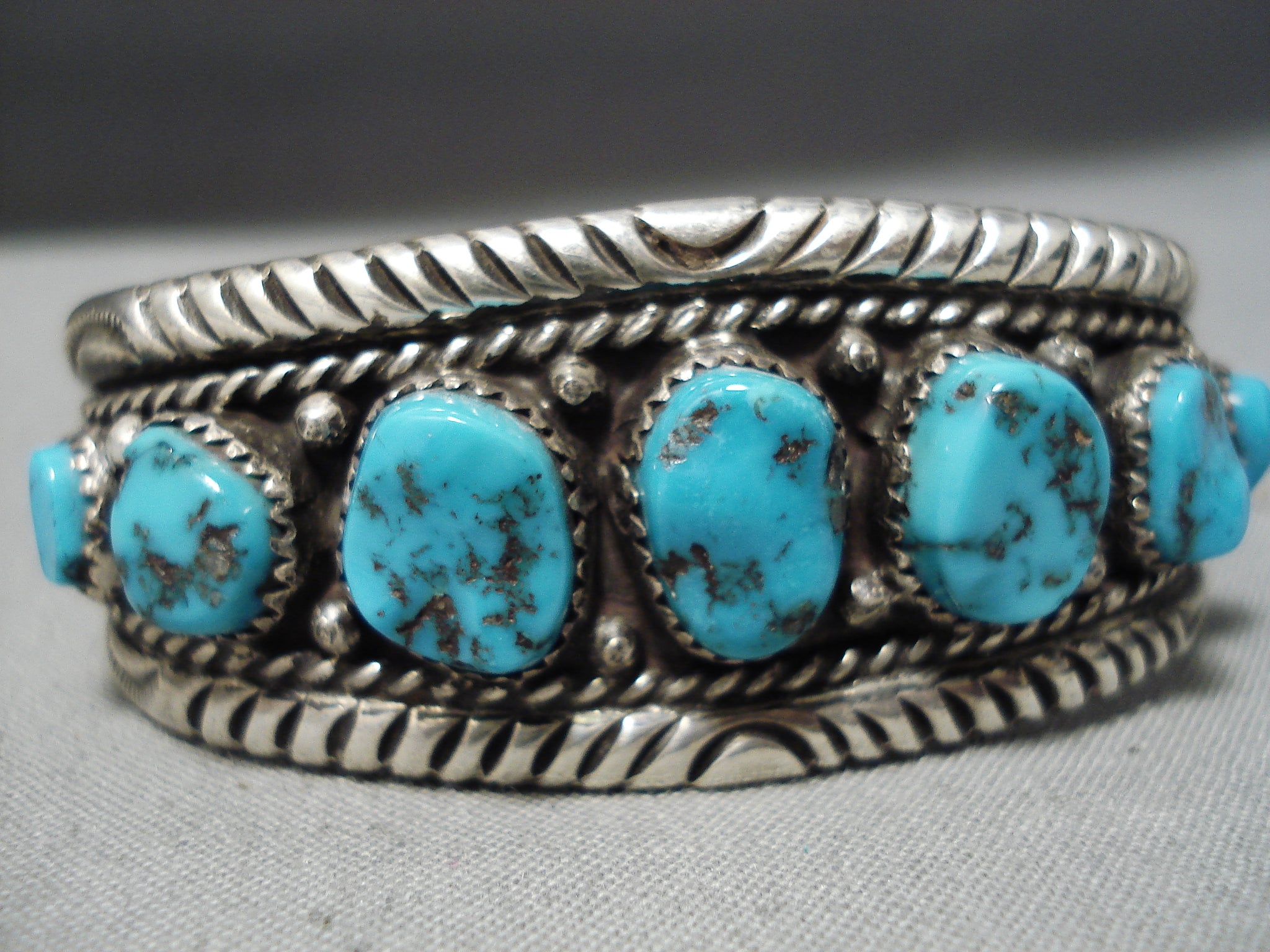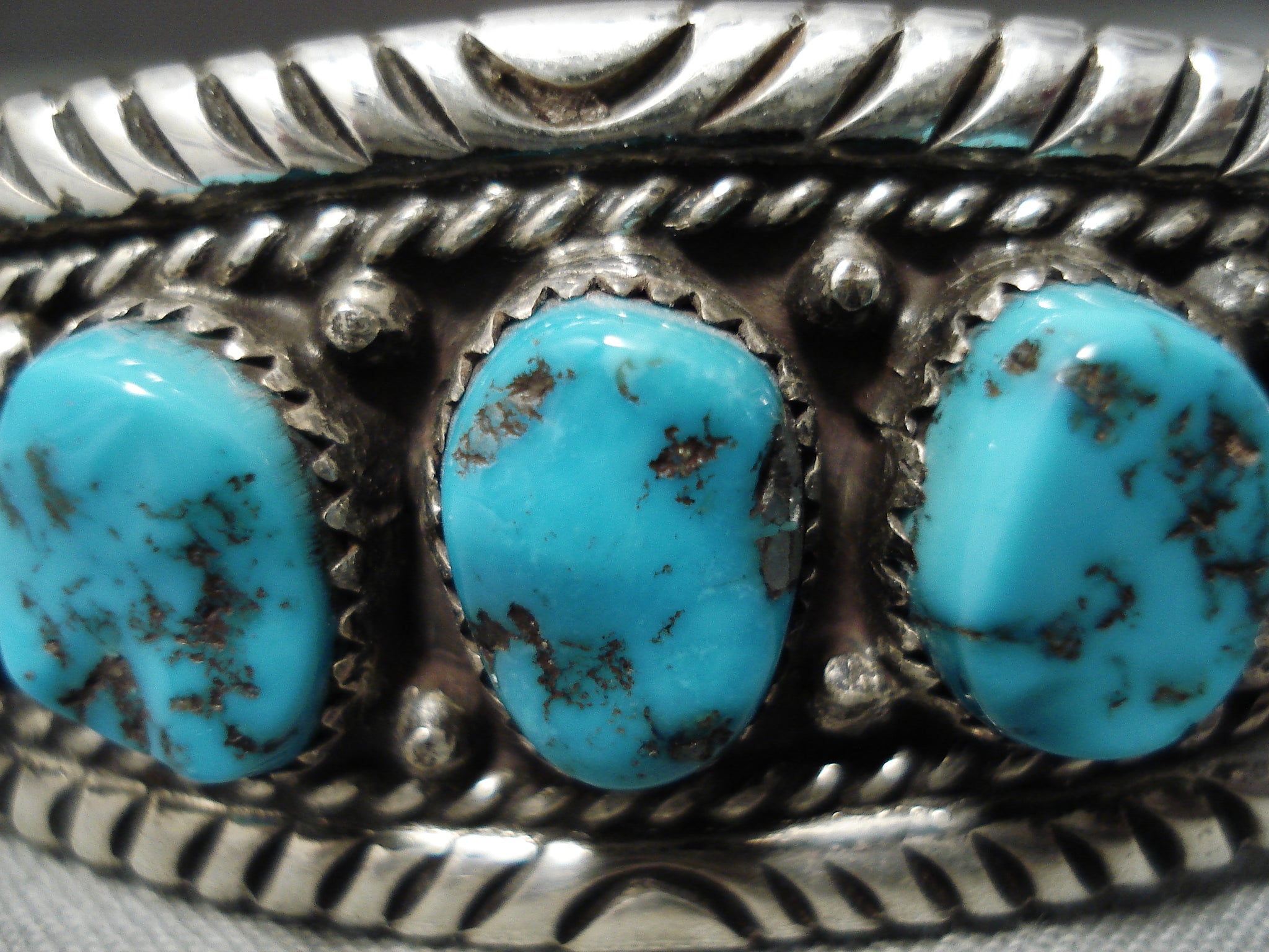 Intense Wave Vintage Native American Navajo Graduating Turquoise Sterling Silver Bracelet Old