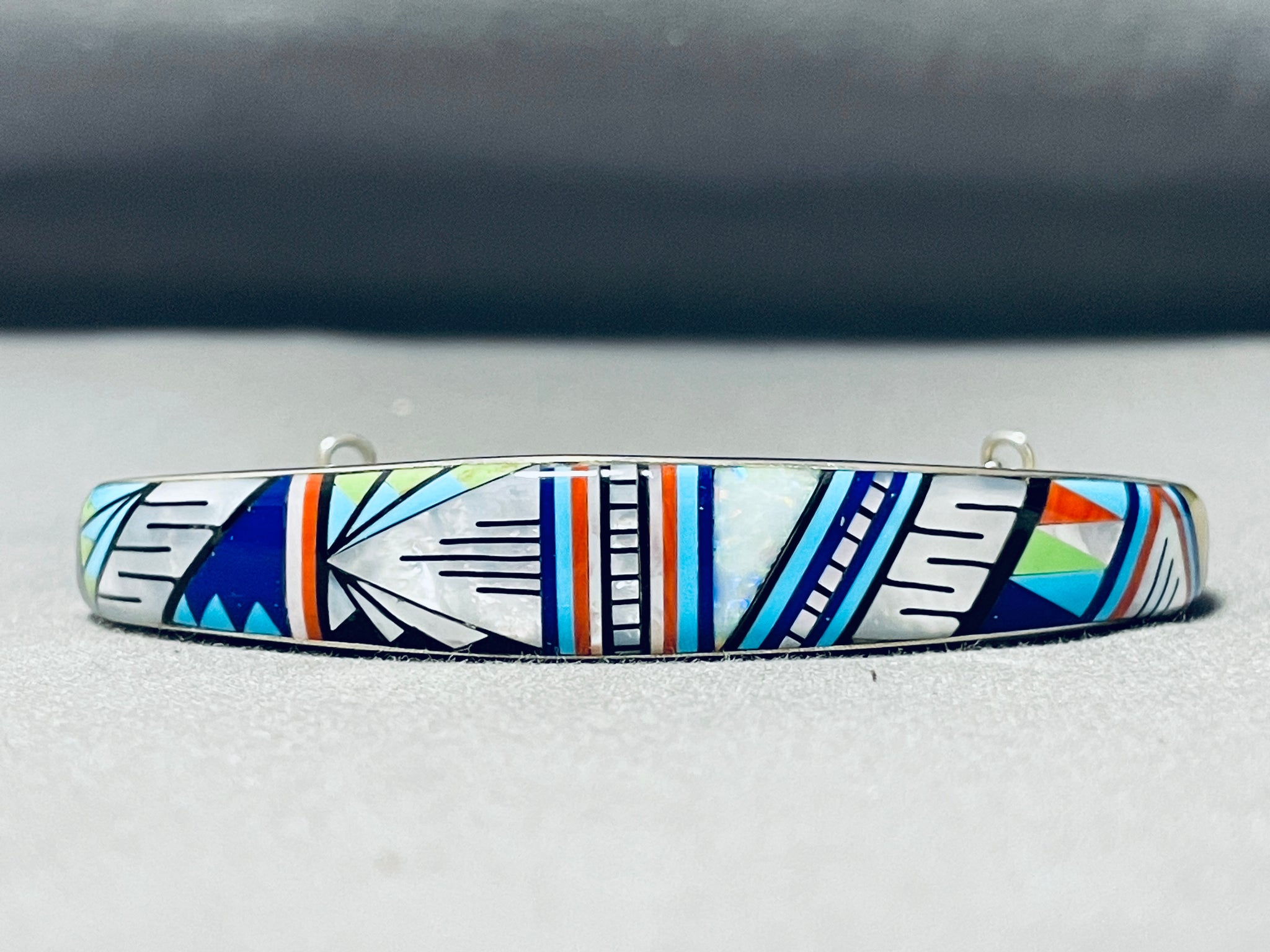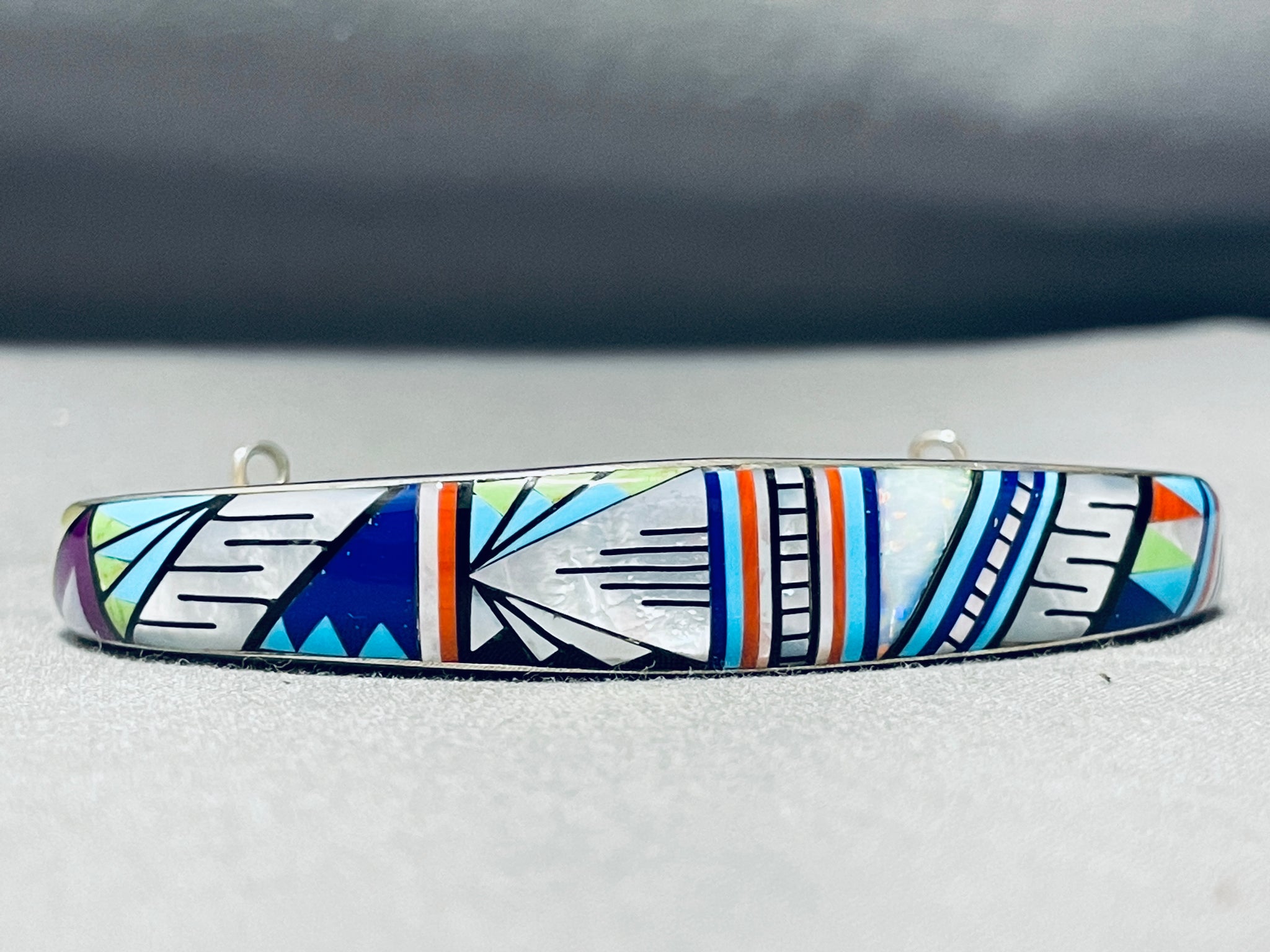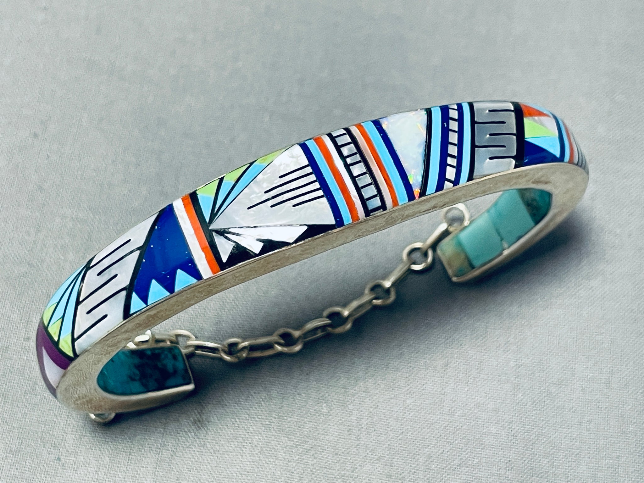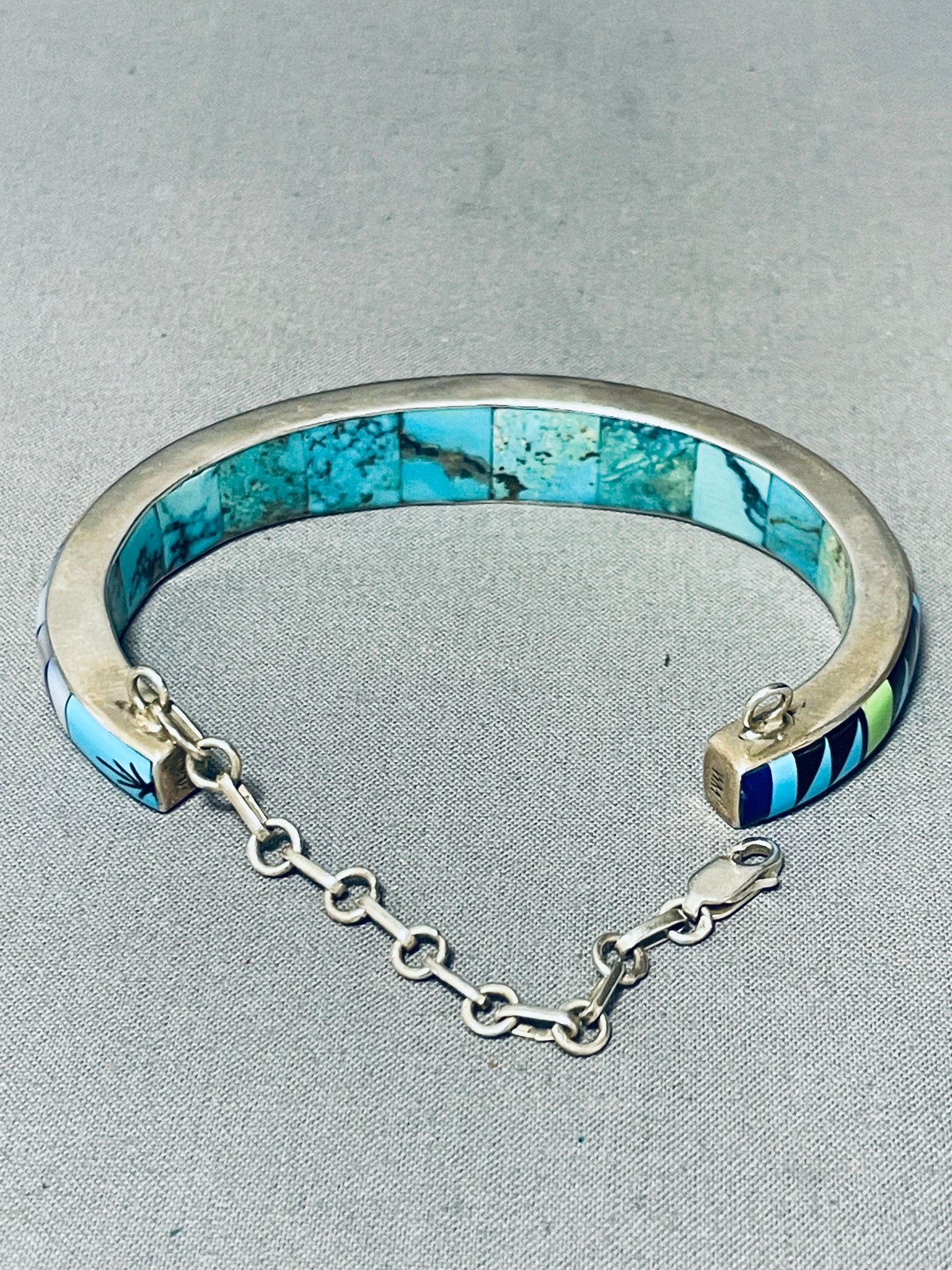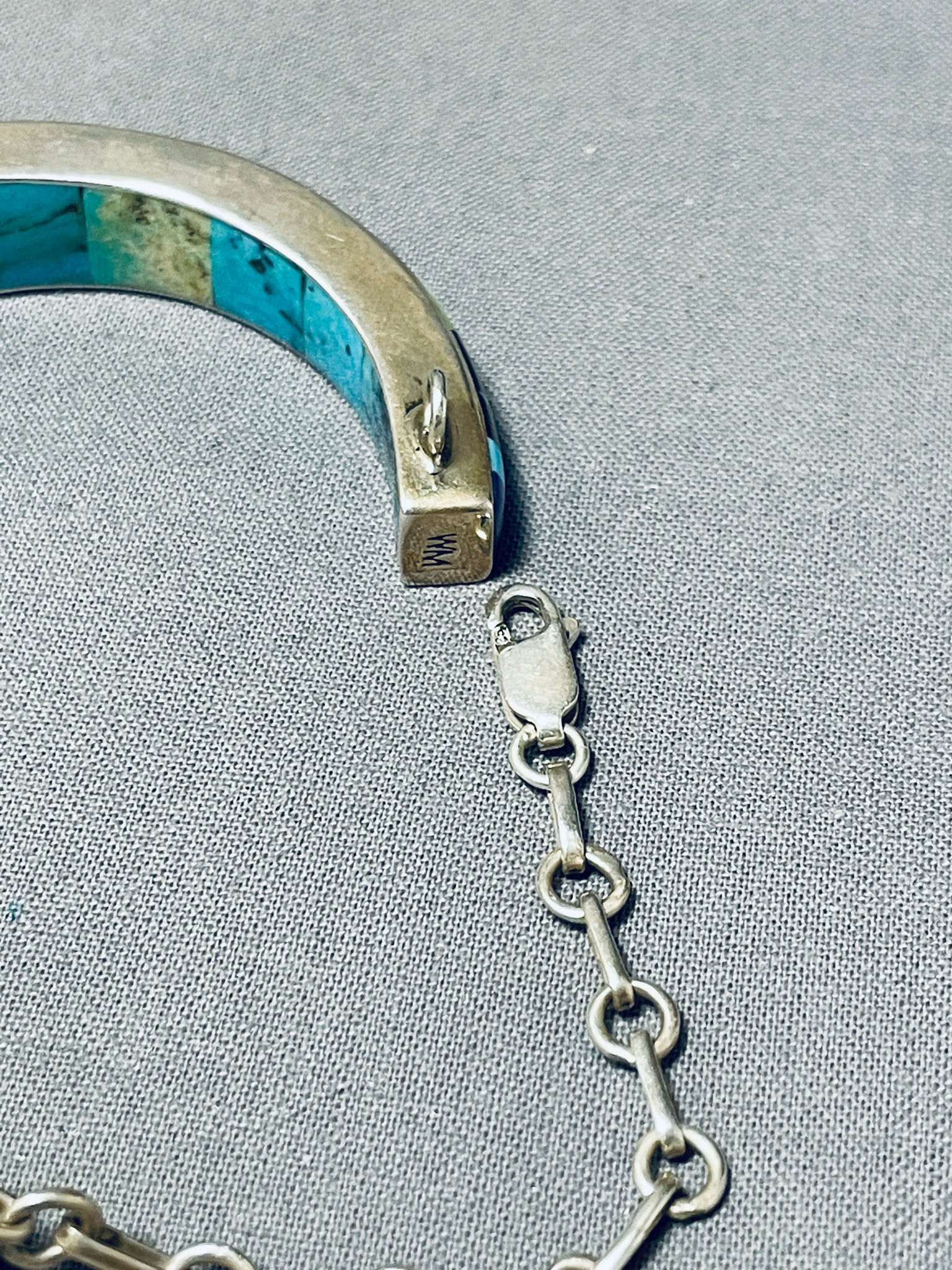 This is an impressive Southwestern inlaid very thick silver cuff bracelet. This outstanding bracelet is remarkably inlaid on the outside and inside of the very thick silver cuff. It is very rare to find such pieces that are inlaid with such detailing and so much inlay. Check out that very impeccable design of inlay work that wraps completely around the cuff consisting of lapis, opal. gaspeite, Sleeping Beauty turquoise, mother of pearl, coral, and onyx. The intricacy of the inlaid patterns is just phenomenal. Completely wrapping around the inside of the cuff are beautiful channel inlaid turquoise stones. I love how this bracelet contains a marvelous additional safety clasp. The width of the bracelet measures around 1/2". Signed by artist, WM. Sterling silver, marked. Cir. 1970's+. The inside end to end measures around 5-1/2" with an additional 1-3/4" gap. Sturdy 38 grams.