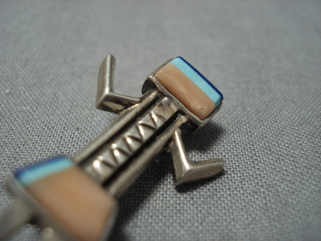 We are proud to offer this unique vintage Navajo silver pin. This is a wonderful vertically designed kachina pin - with two colorful regions of inlay stones that include turquoise and lapis. Sterling silver, marked. The pin measures around 1-1/8" x 5/8". Sturdy 6 grams.
