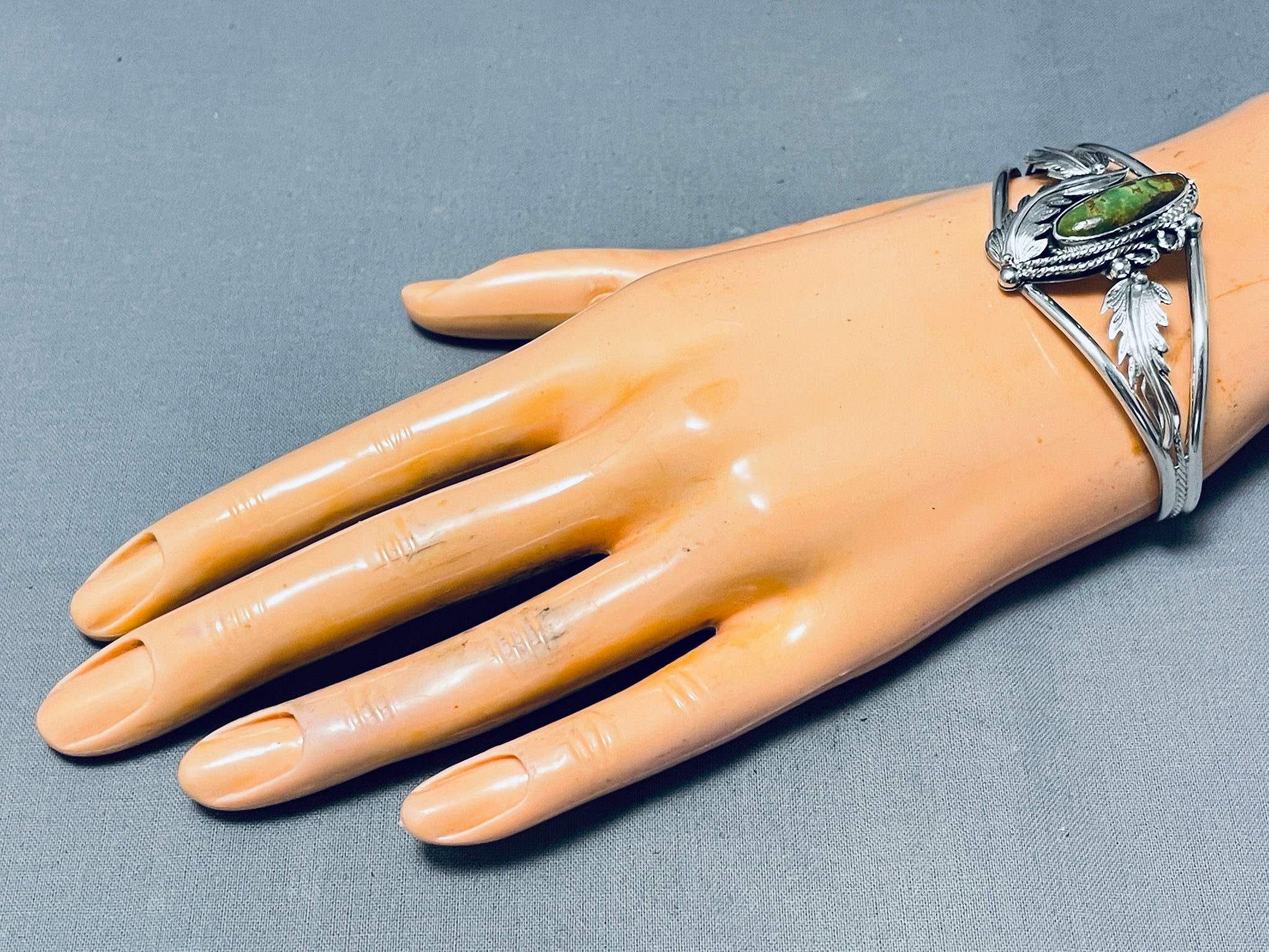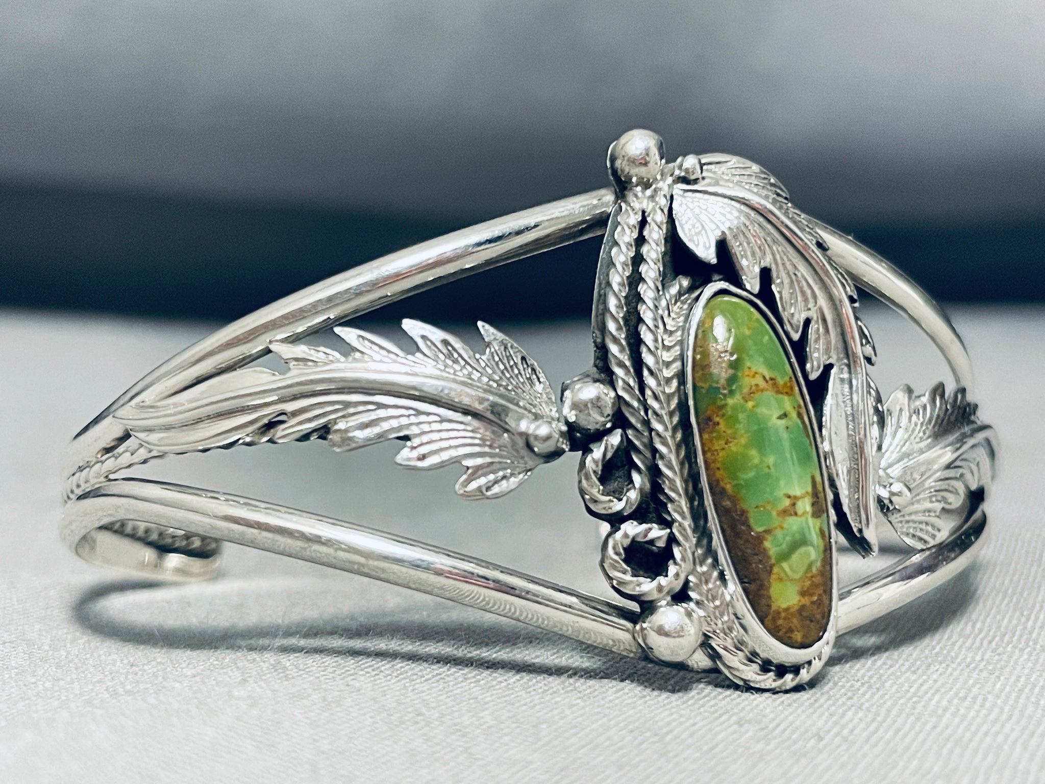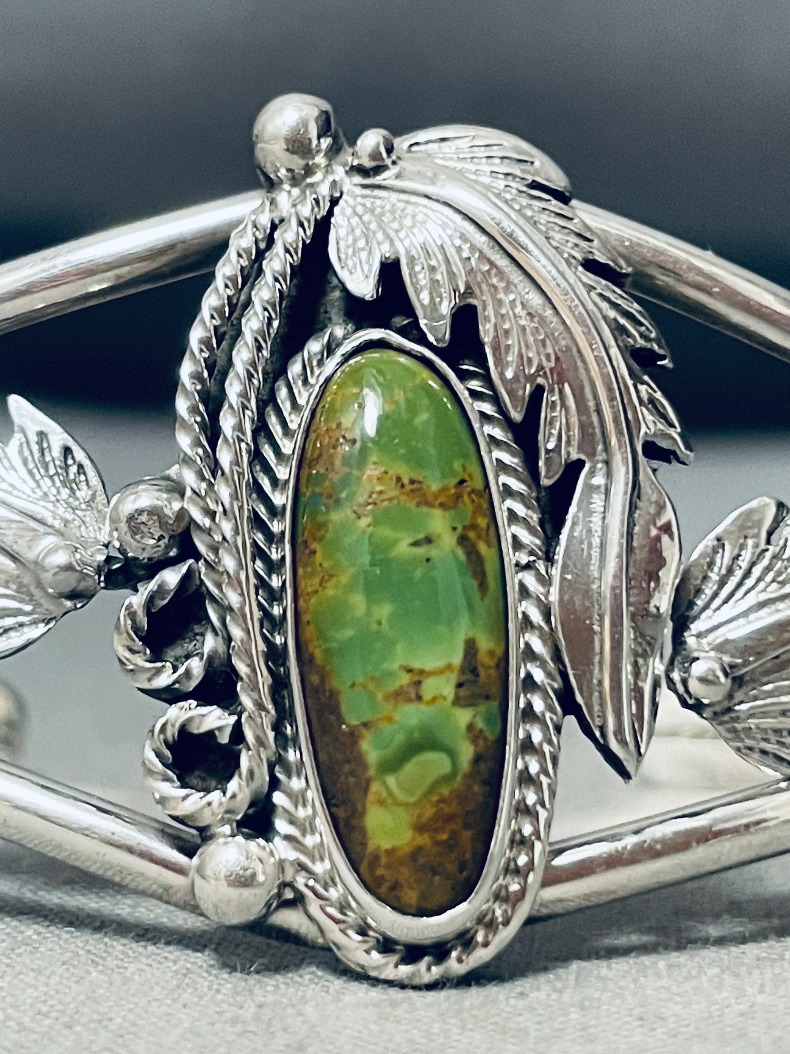 Intricate Leaf Vintage Native American Navajo Royston Turquoise Sterling Silver Bracelet