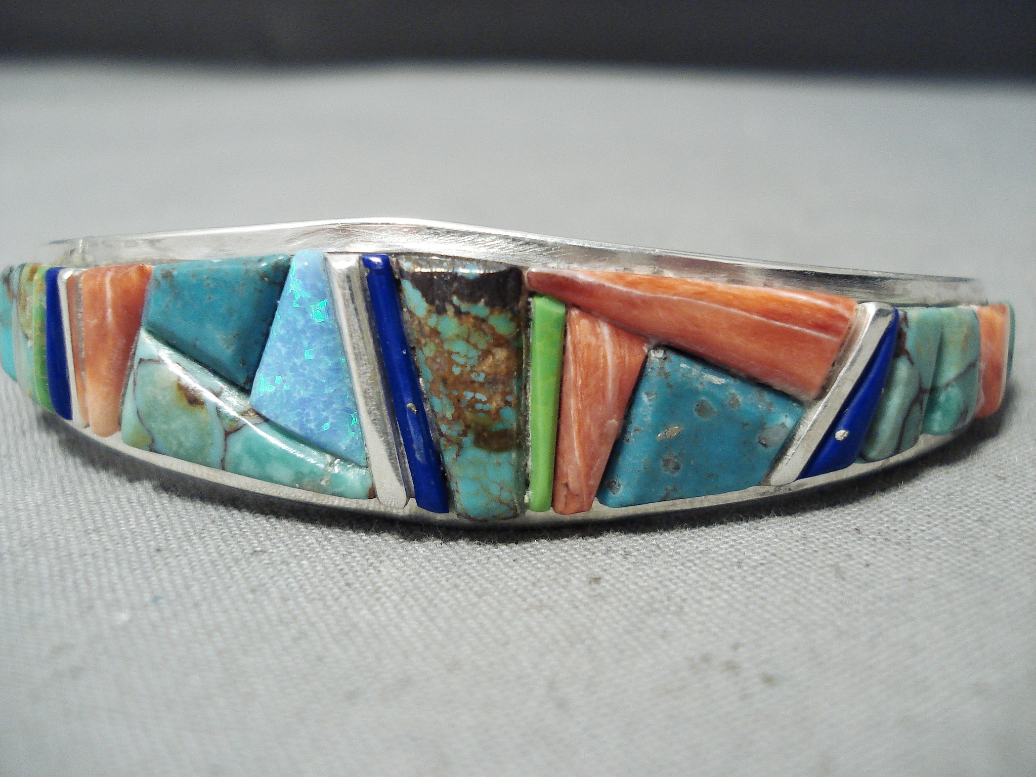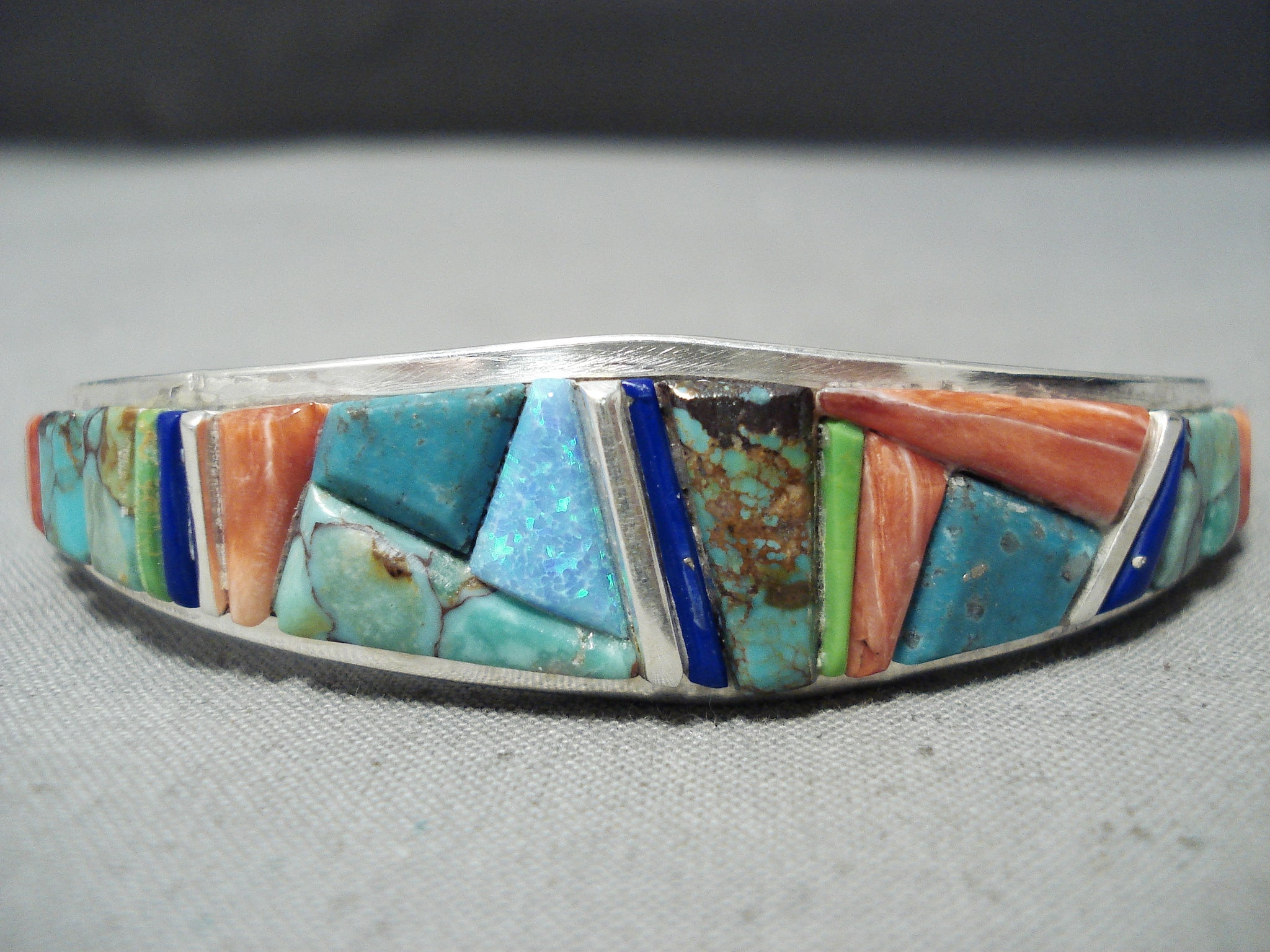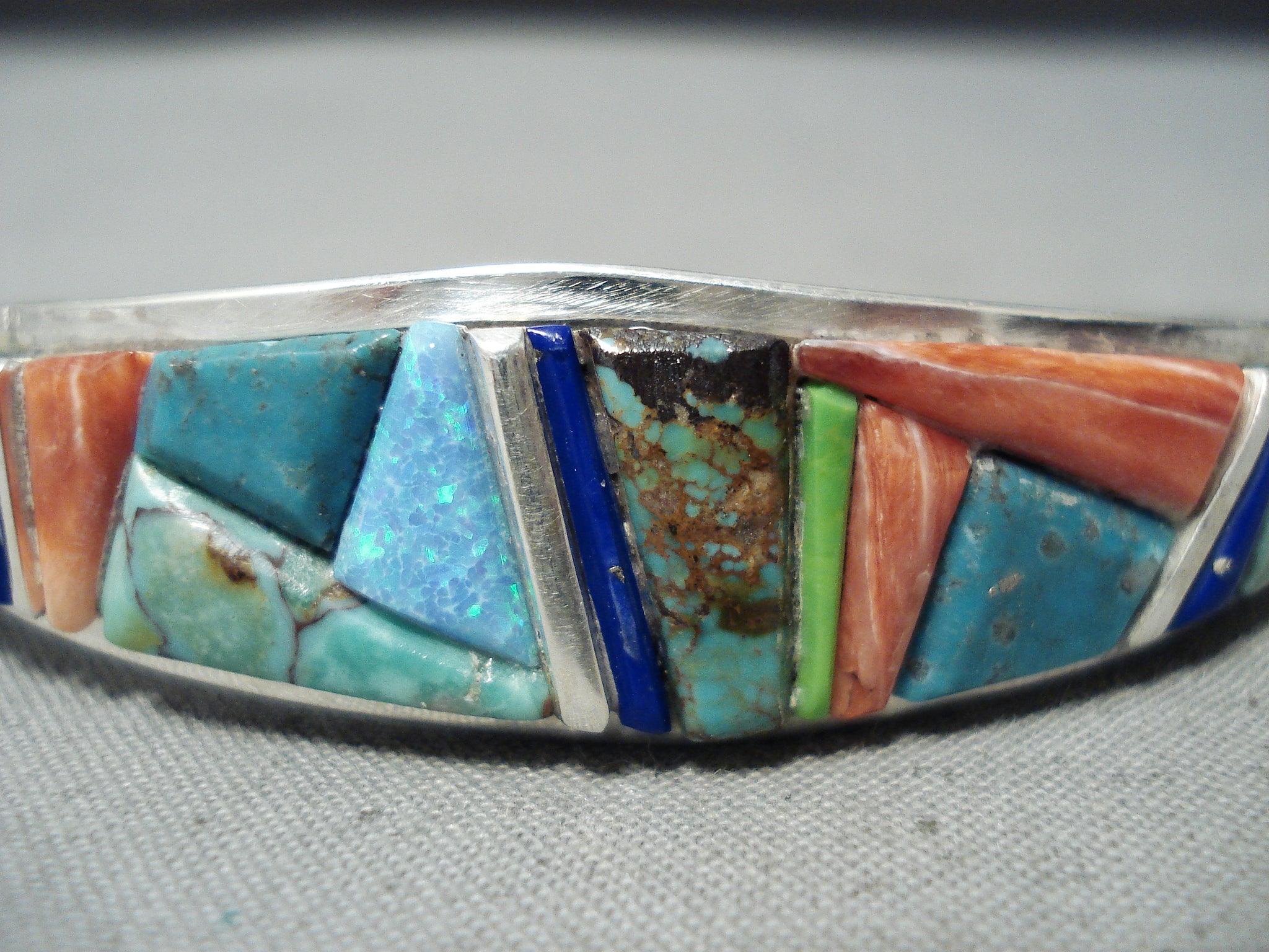 This is an exquisite vintage Navajo inlaid silver bracelet. This wonderful piece contains stunning inlay that wraps nearly around the entire thick and sturdy silver cuff. The inlay consists of Royston turquoise, lapis lazuli, opal, spiny oyster and gaspeite. This bracelet graduates in width and is absolutely incredible. The width of the bracelet measures around 5/8". Signed by Navajo artist, Lyn Robert . Sterling silver, marked. Cir. 1970's+. The inside end to end measures around 5-3/4" with an additional 1" gap. Sturdy 23 grams.