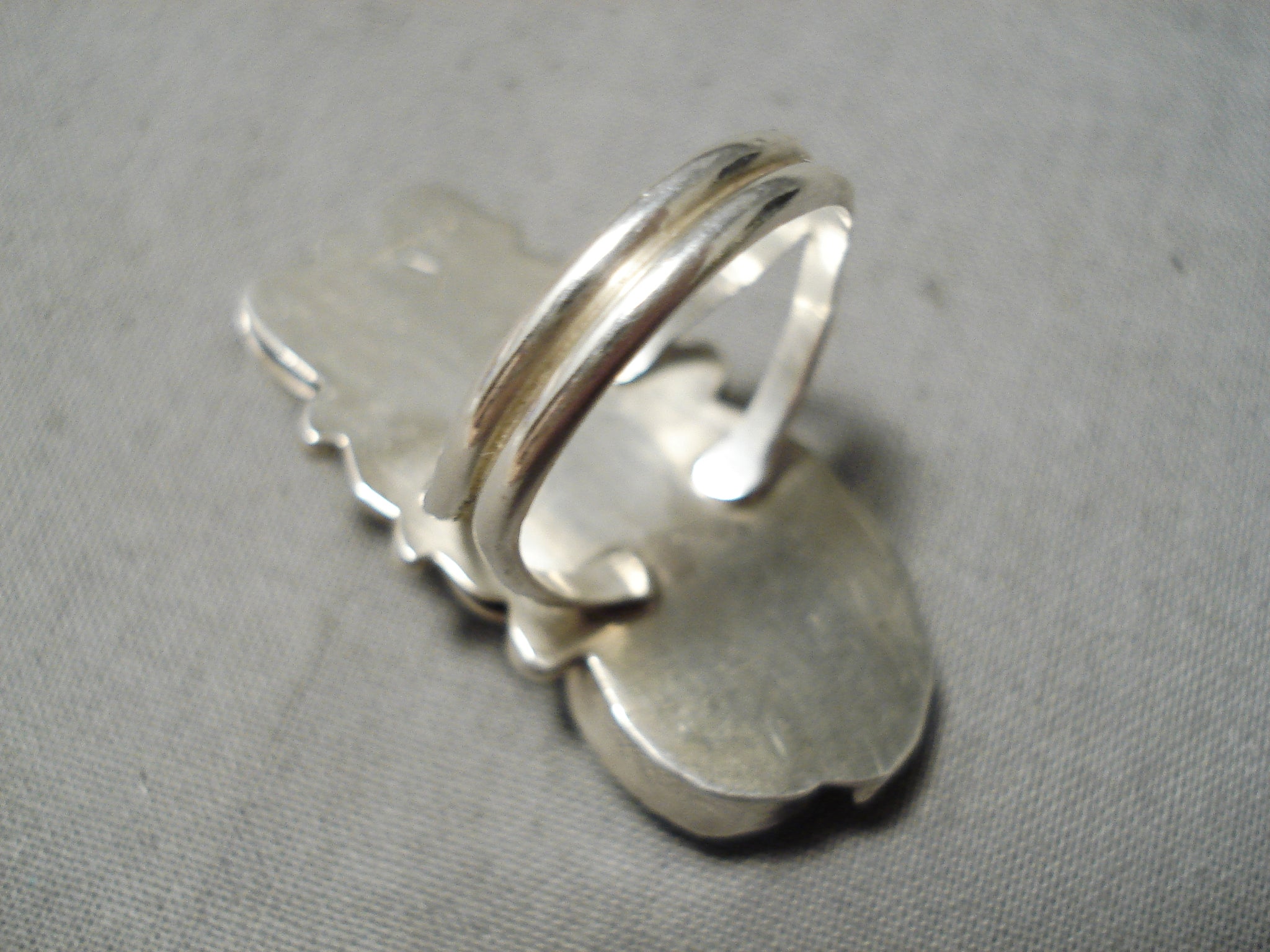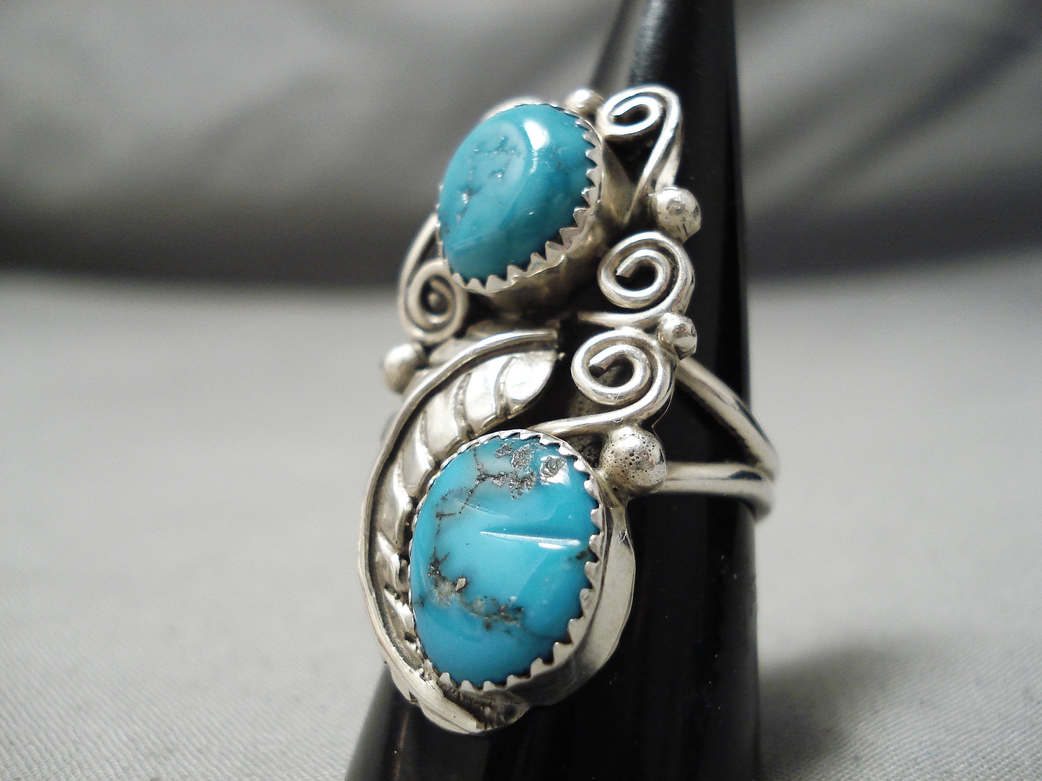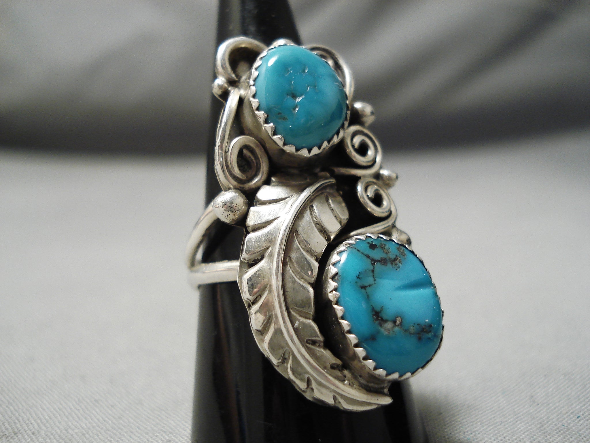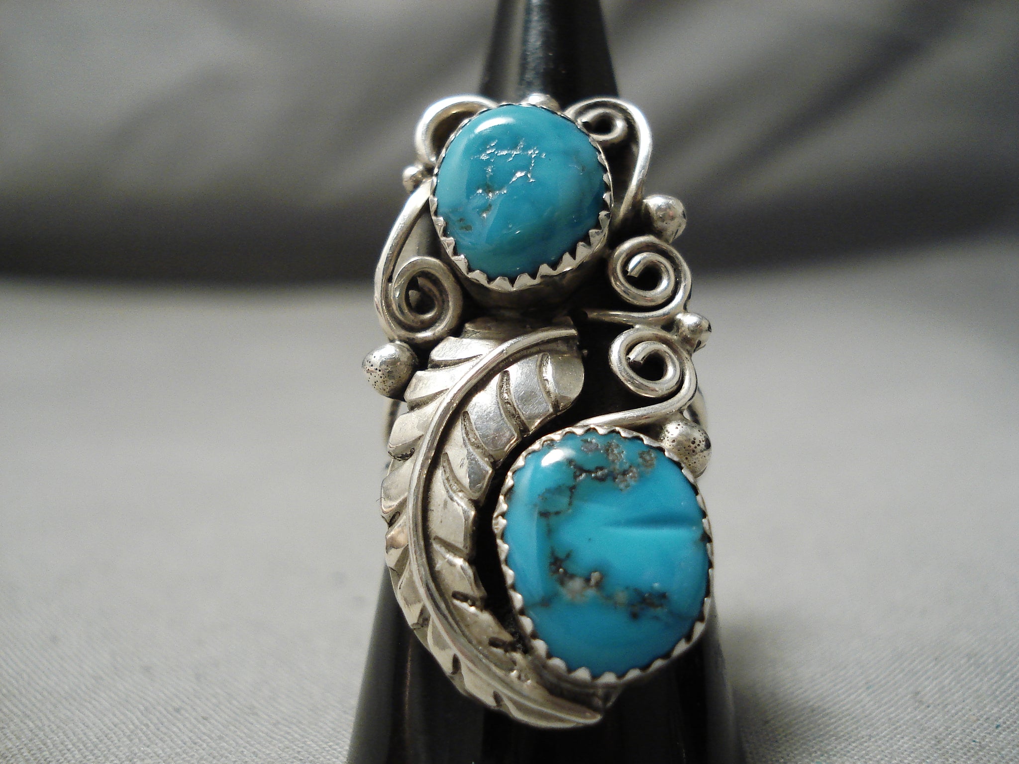 Intricate Vintage Native American Navajo Turquoise Sterling Silver Leaf Ring Old