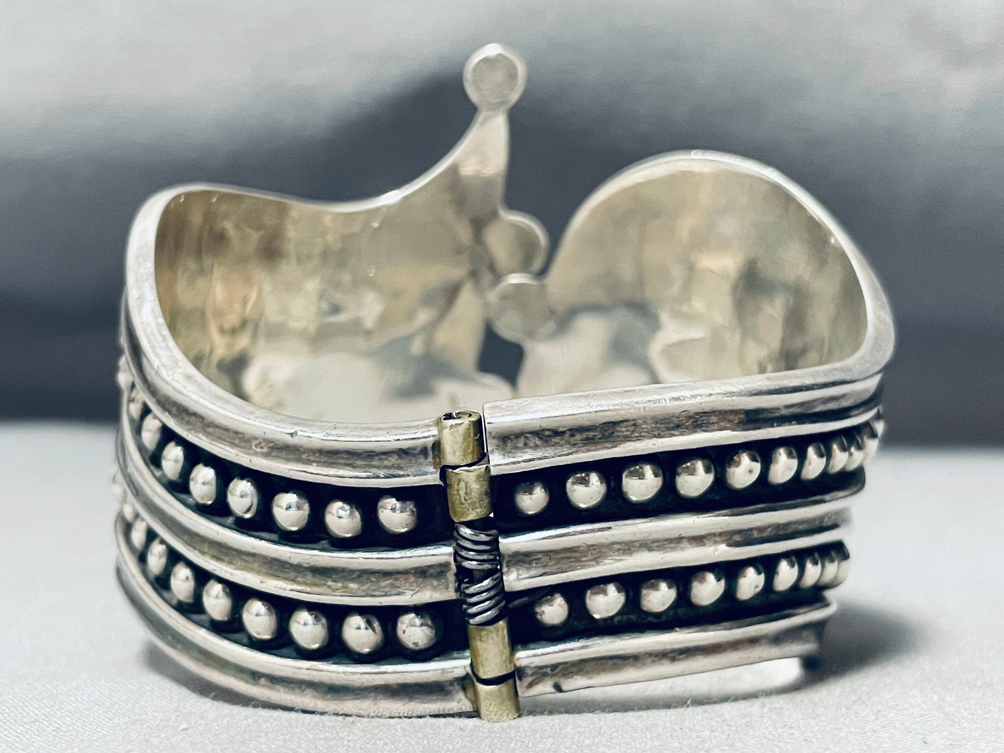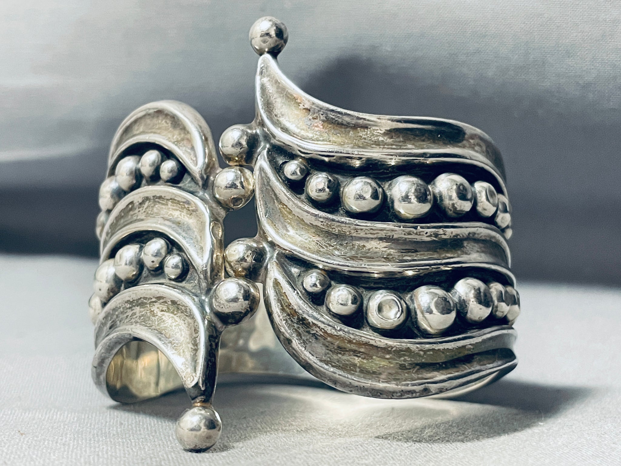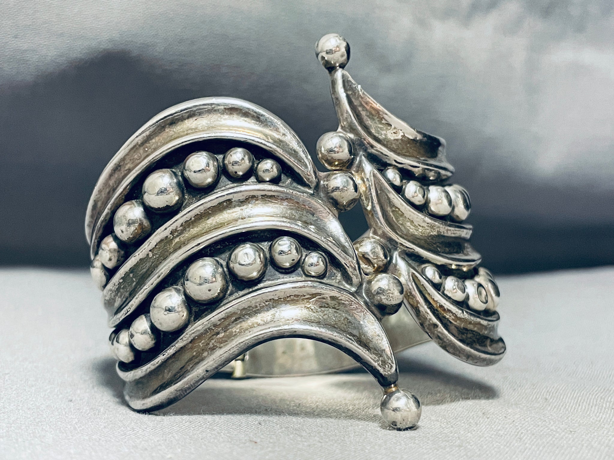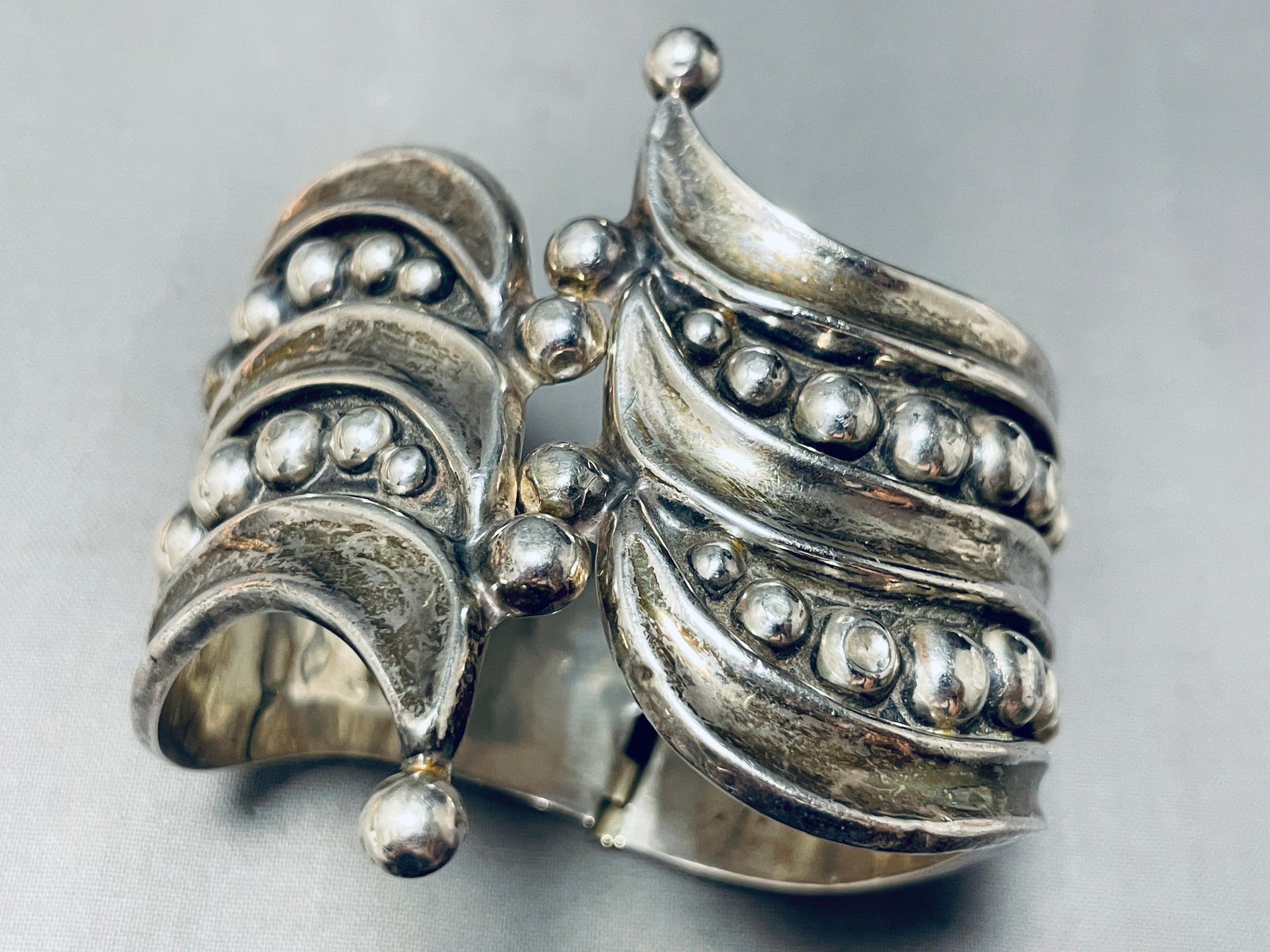 This is a fascinating Southwestern all silver unique style bracelet. This wonderful bracelet contains all silver workmanship that includes graduating raindrops and stem patterns. I just love how this bracelet opens up and contains wonderful hinges to allow the bracelet to fit basically any size wrist. As is the bracelet measures around 7" but again can be opened up to fit nearly any size wrist. The width of the bracelet measures around 2-1/2". Sterling silver. Cir. 1970's+. Sturdy 37 grams.