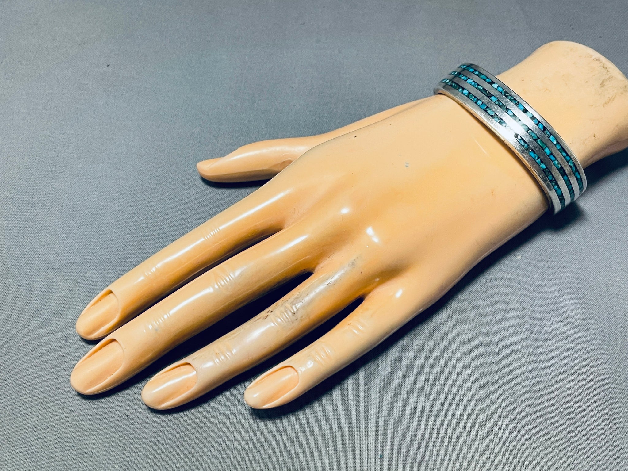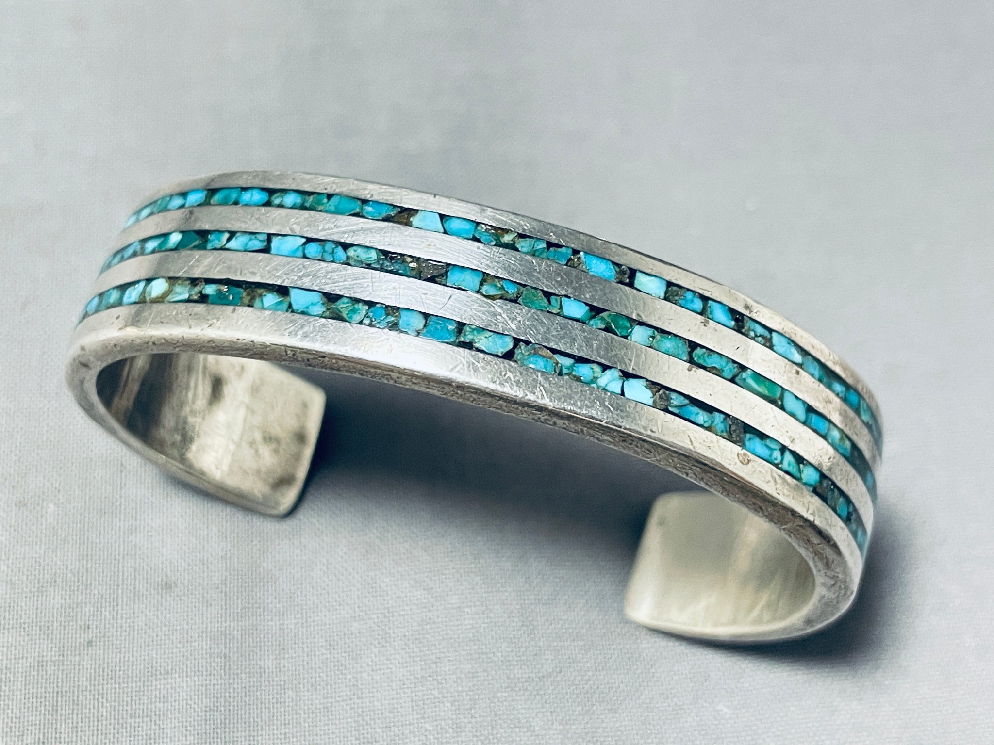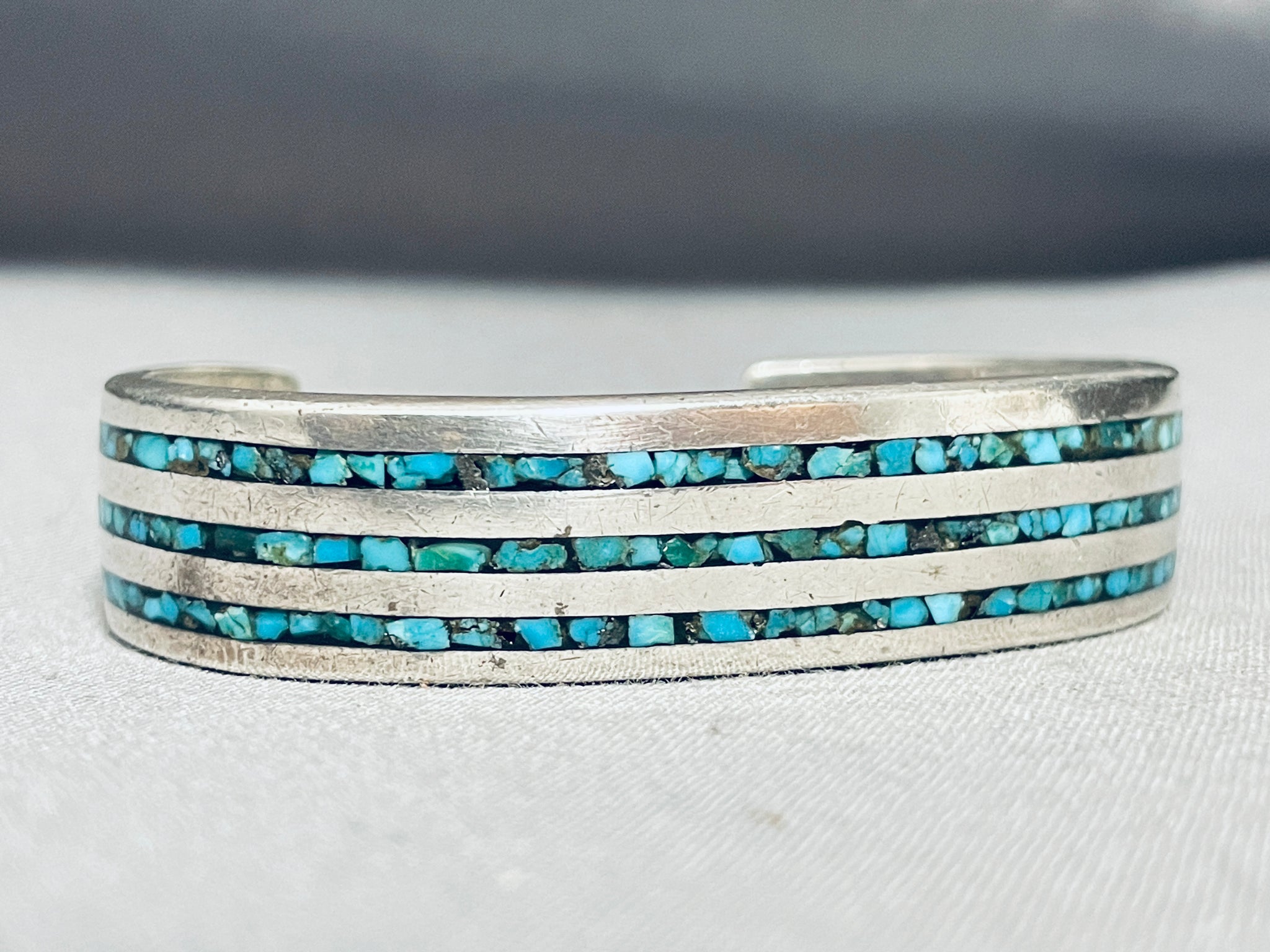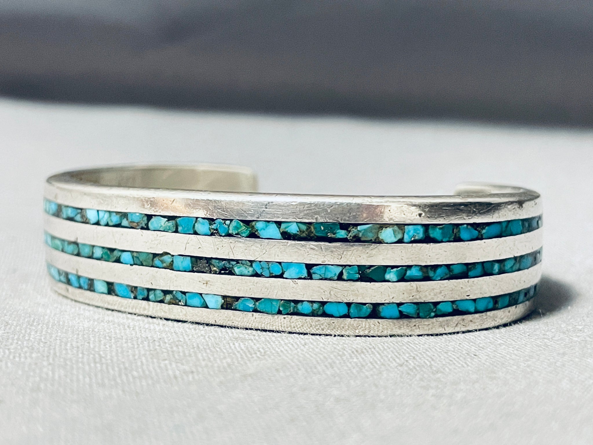 Intricately Inlaid Triple Row Vintage Native American Zuni Turquoise Sterling Silver Bracelet