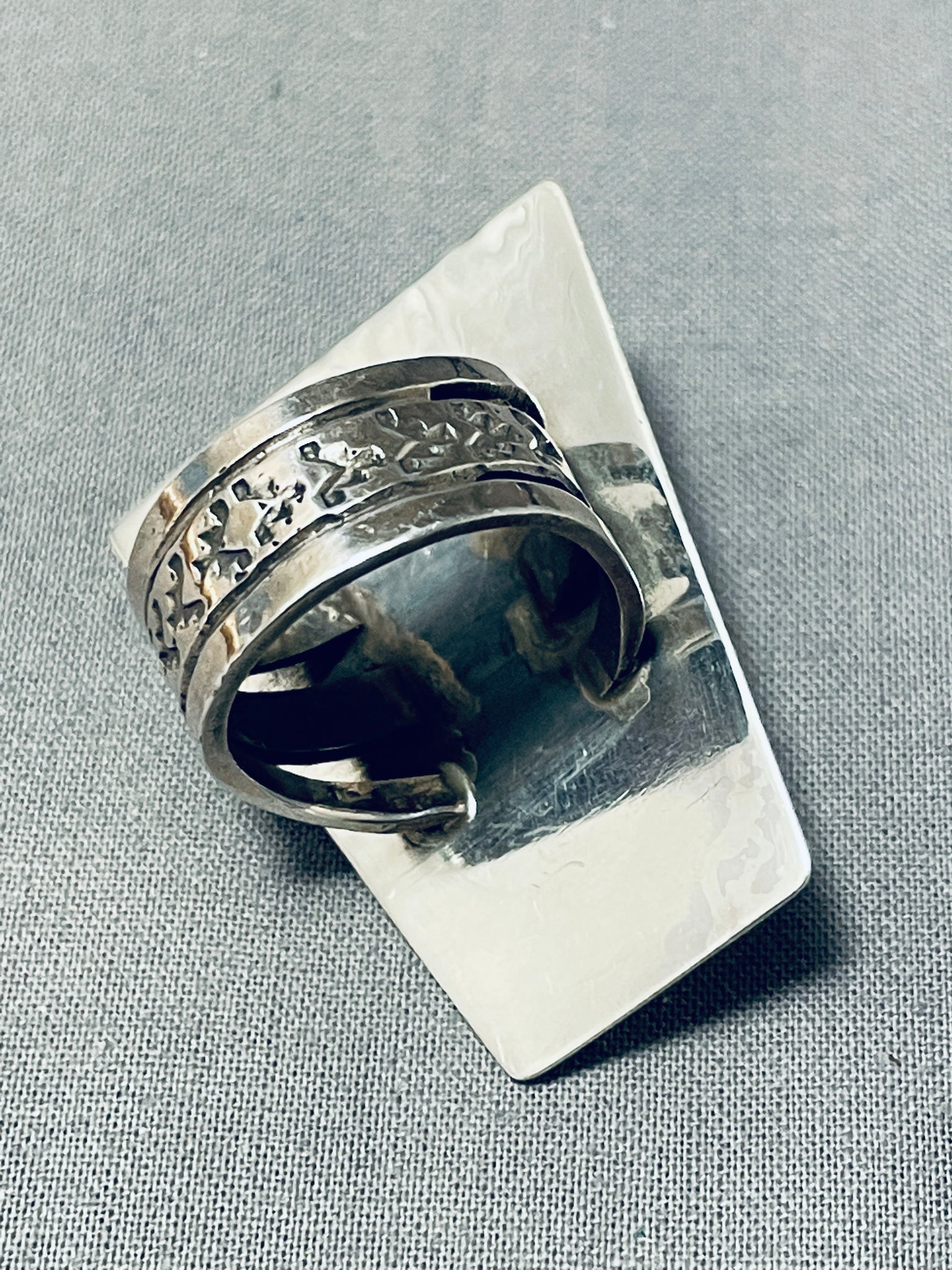 This is a beautiful San Felipe ring featuring a Royston turquoise stone on a handcarved silver background, with a handstamped triple rail silver band that graduates to a solid silver band! Truly Distinctive! The center stone measures around 1" x 1/2". The ring face measures around 1-1/2" x 1-1/4". Signed by San Felipe artist, Jake Francosa. The ring size is around 9. Sterling silver, marked. Sturdy 15 grams.