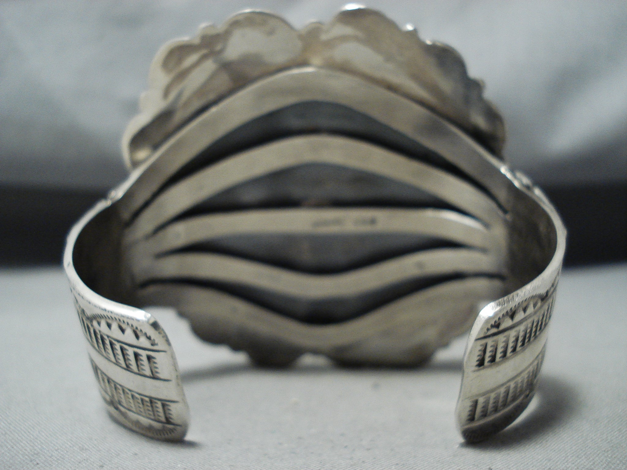 We are proud to offer this striking Navajo silver bracelet having 2 large Blue Diamond turquoise stones surrounded by handcarved silver rope with silver beads, a handcarved scalloped silver border and silver handstampings! This incredible bracelet has handcarved vertical silver flanks on the sides of the handcarved graduated 5 rail silver cuff! Absolutely Stunning Piece! The largest stone measures around 2-3/8" x 3/4". The width of the bracelet measures around 3". Signed by Navajo artist, Jo Tso. Sterling silver, marked. The inside end to end measures around 5-3/4" with an additional 1-3/8" gap.