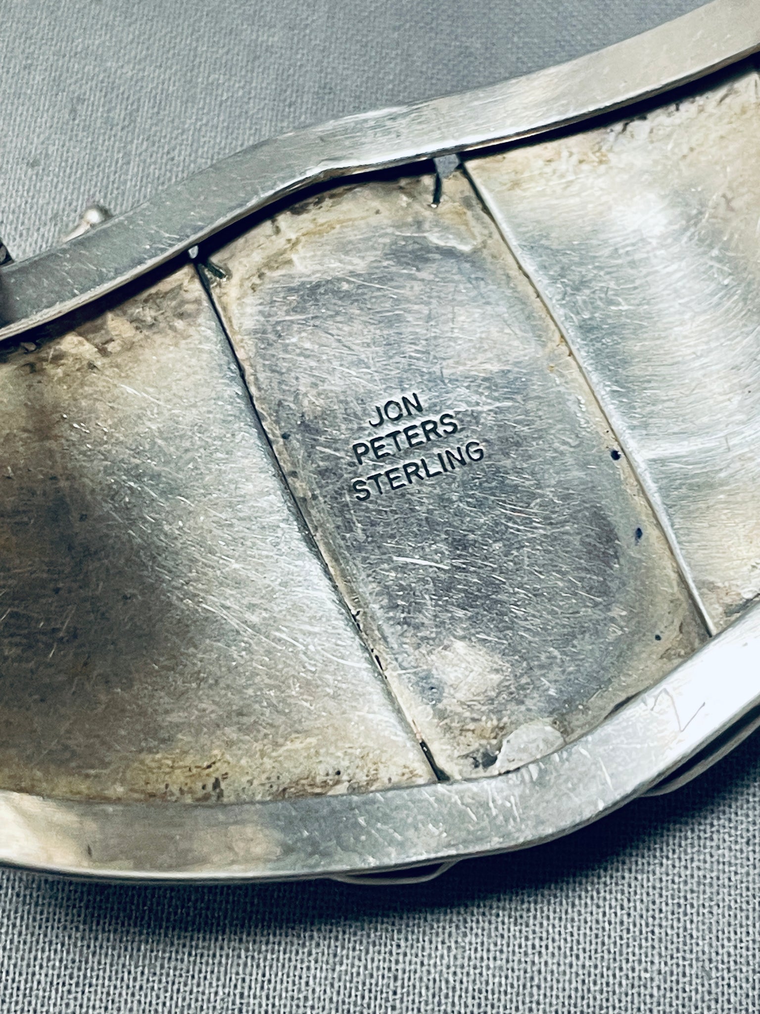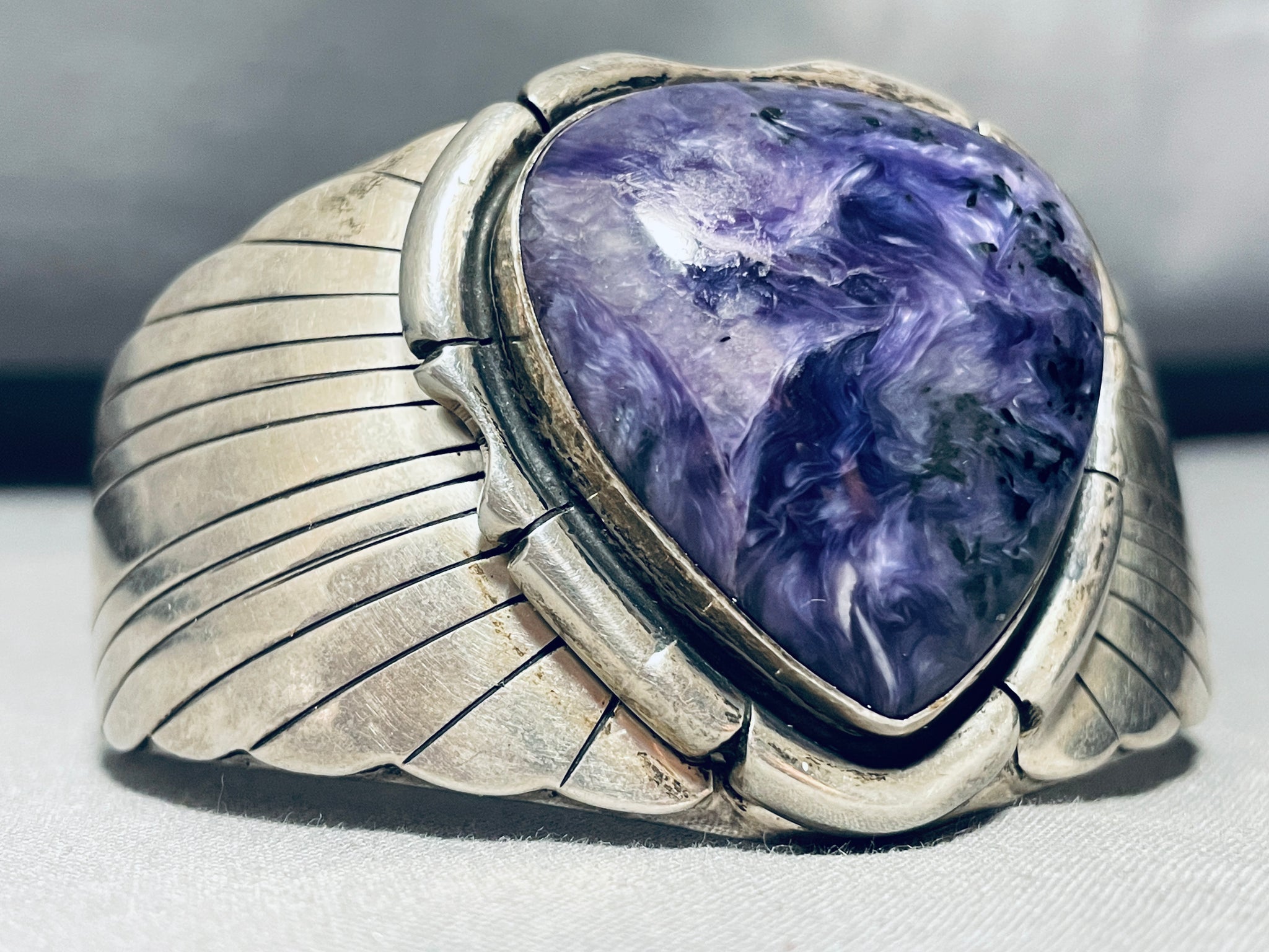 This is a tremendous vintage Navajo large single stone silver bracelet. This outstanding bracelet contains a beautiful center fat teardrop shaped Charoite stone. The stone is beautifully placed in a shadowbox setting with surrounding wave patterns and channel works. Running down both ends of the thick and sturdy double silver shank cuff are amazing sun stamped silver flanks that are large and incredible. The center stone measures around 1-3/8" x 1-3/8". The width of the bracelet measures around 1-3/4". Signed by Navajo artist, Jon Peters. Sterling silver, marked. Cir. 1970's+. The inside end to end measures around 5-1/4" with an additional 1-3/4" gap. Sturdy 70 grams.