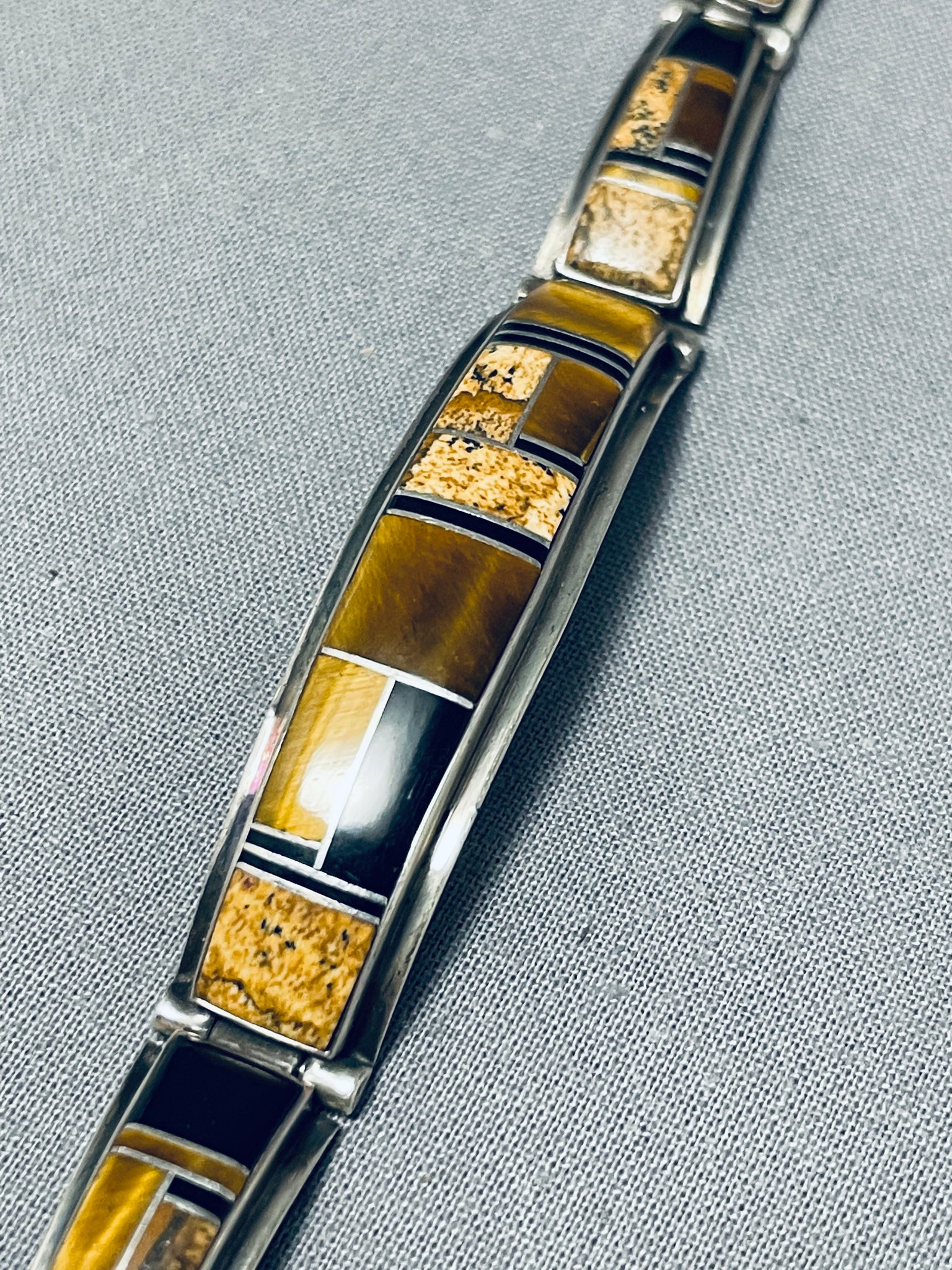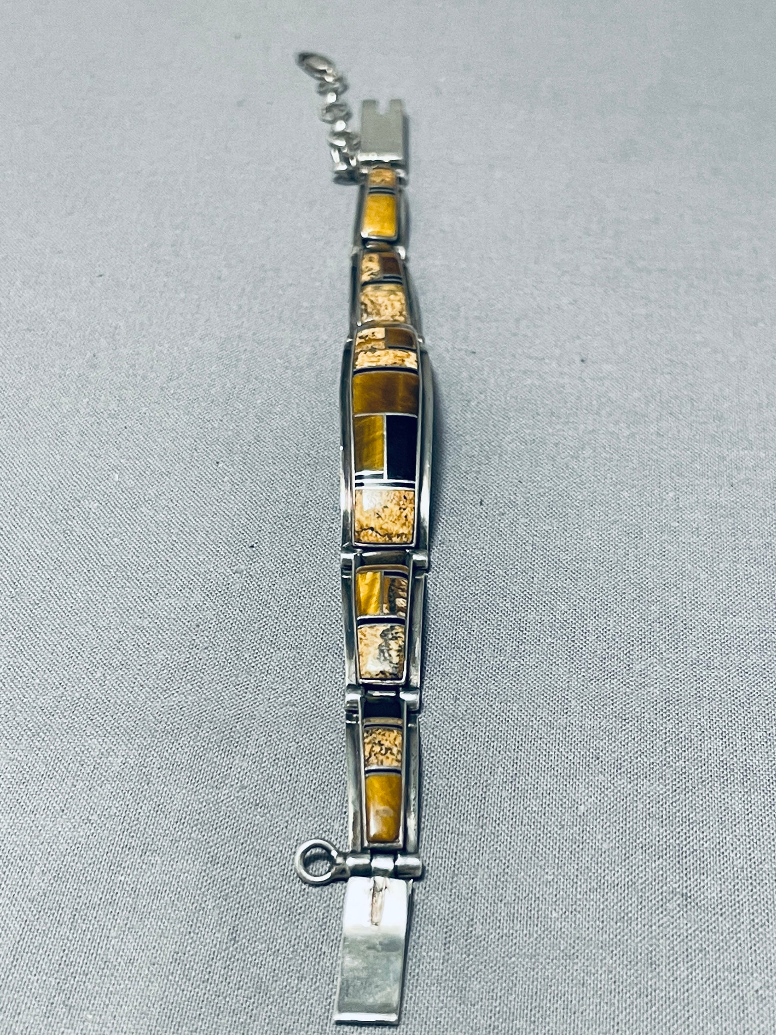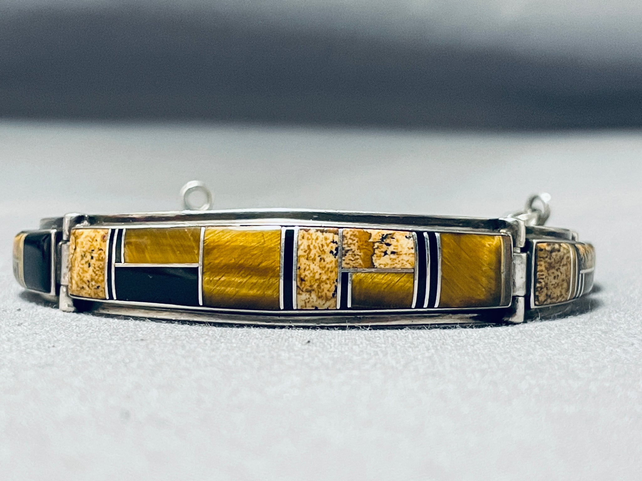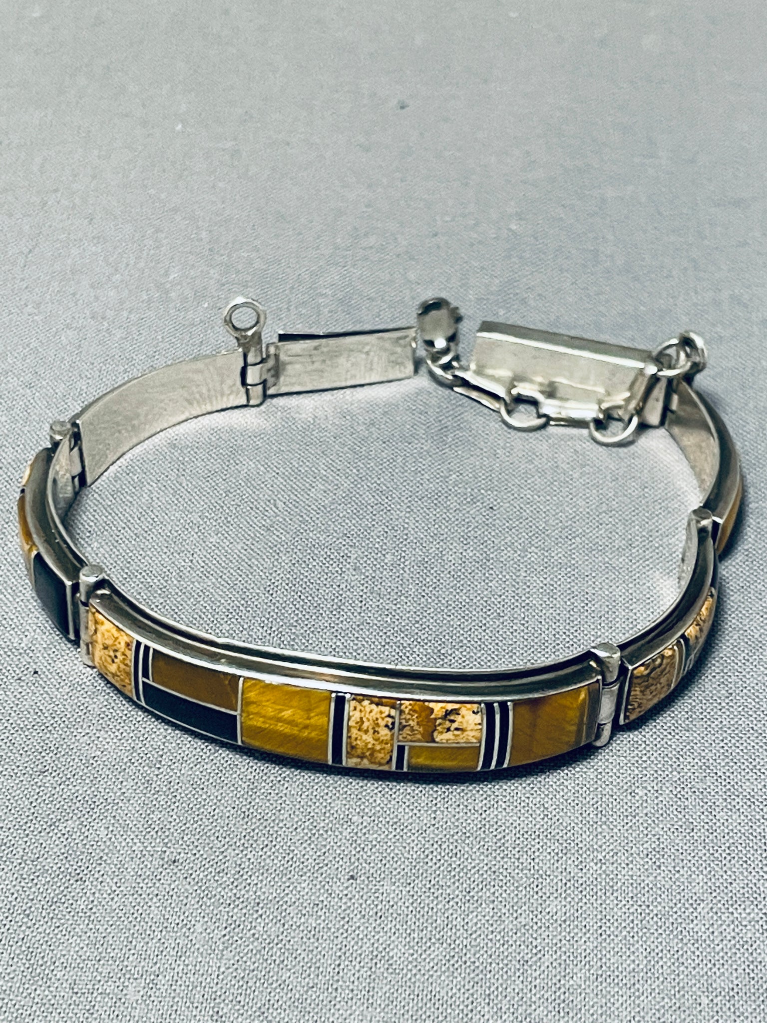 We are proud to offer this fascinating vintage Navajo bracelet featuring 5 silver links with tiger's eye and jet inlay, and a silver box clasp with a silver chain! Positively Phenomenal! The width of the bracelet measures around 1/2". Signed by Navajo artist, Julian Arviso. Sterling silver, marked. The inside end to end measures around 6-1/4". Sturdy 21 grams.