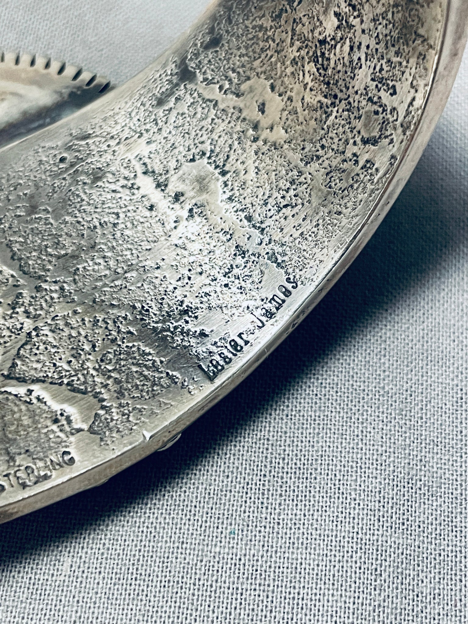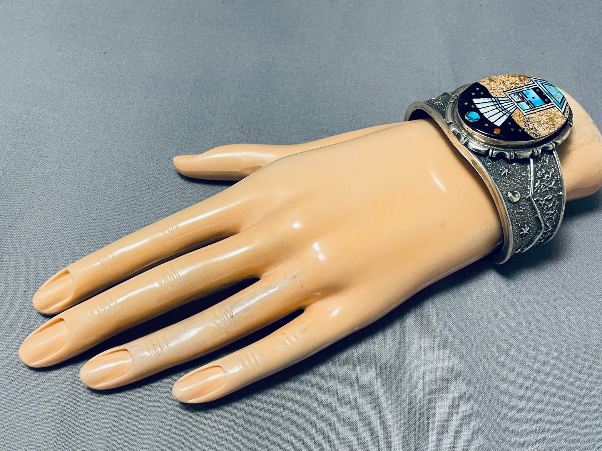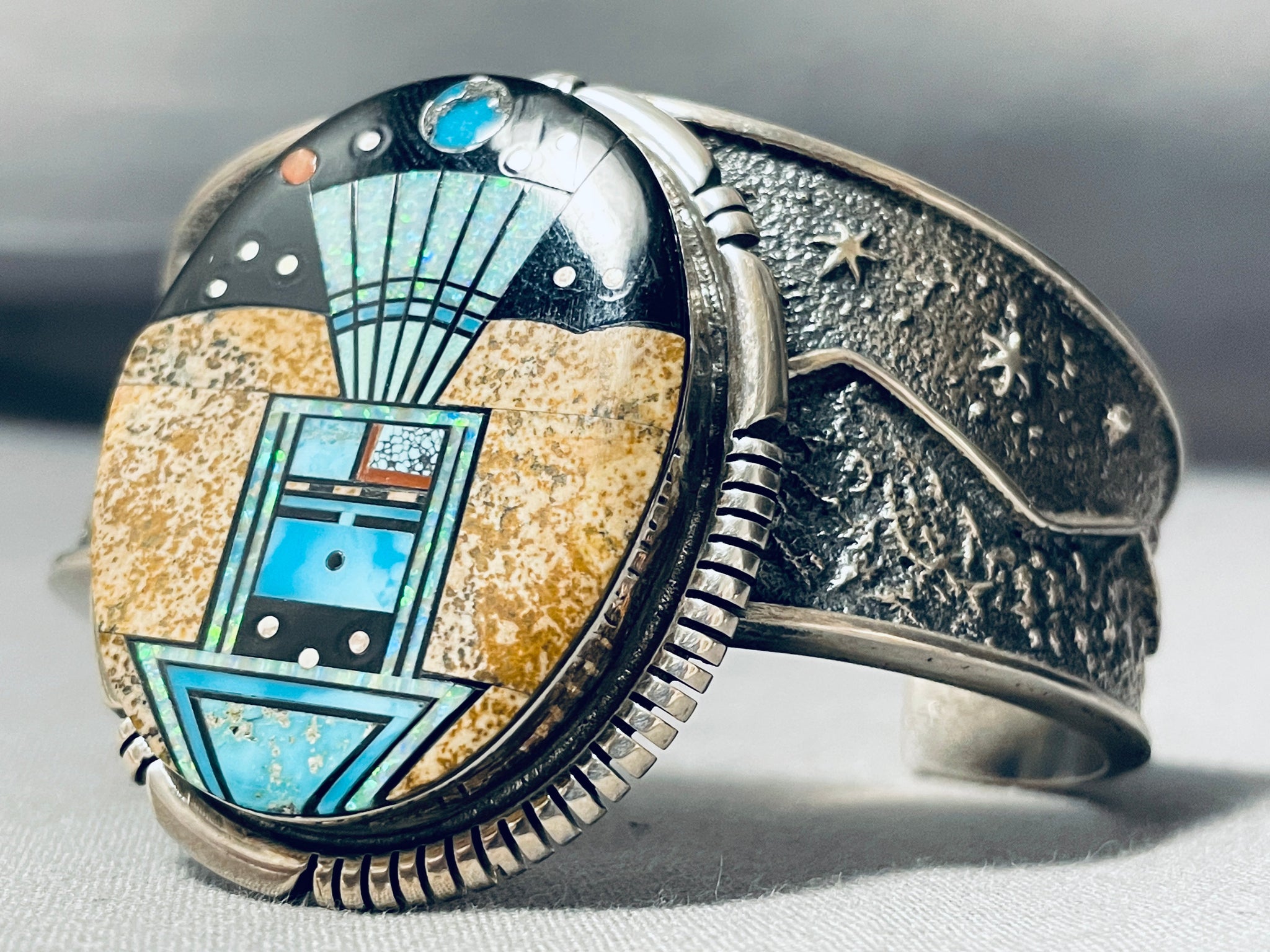This is an exceptional Navajo inalid very thick and sturdy silver cuff bracelet. This remarkable bracelet contains a center inlaid very detailing kachina pattern that is in a desert scenery with a night sky background. The inlay includes amazing abalone, turquoise, onyx, coral, tan shell and denim lapis. The inticacy is just so phenomenal. I aboslutely love the surrounding accenting silver works that consist of wave works and channeled patterns. The very thick and sturdy silver cuff beautifully graduates in width towards the center. Running down both ends are amazing star patterns, moon patterns, mountain patterns, and a textured cuff. Such a beautiful bracelet with so much thought put into it. The width of the bracelet measures around 1-7/8". Signed by Navajo artist, Lest James . Sterling silver, marked. The inside end to end measures around 5-3/4" with an additional 1-1/4" gap. Sturdy 92 grams.