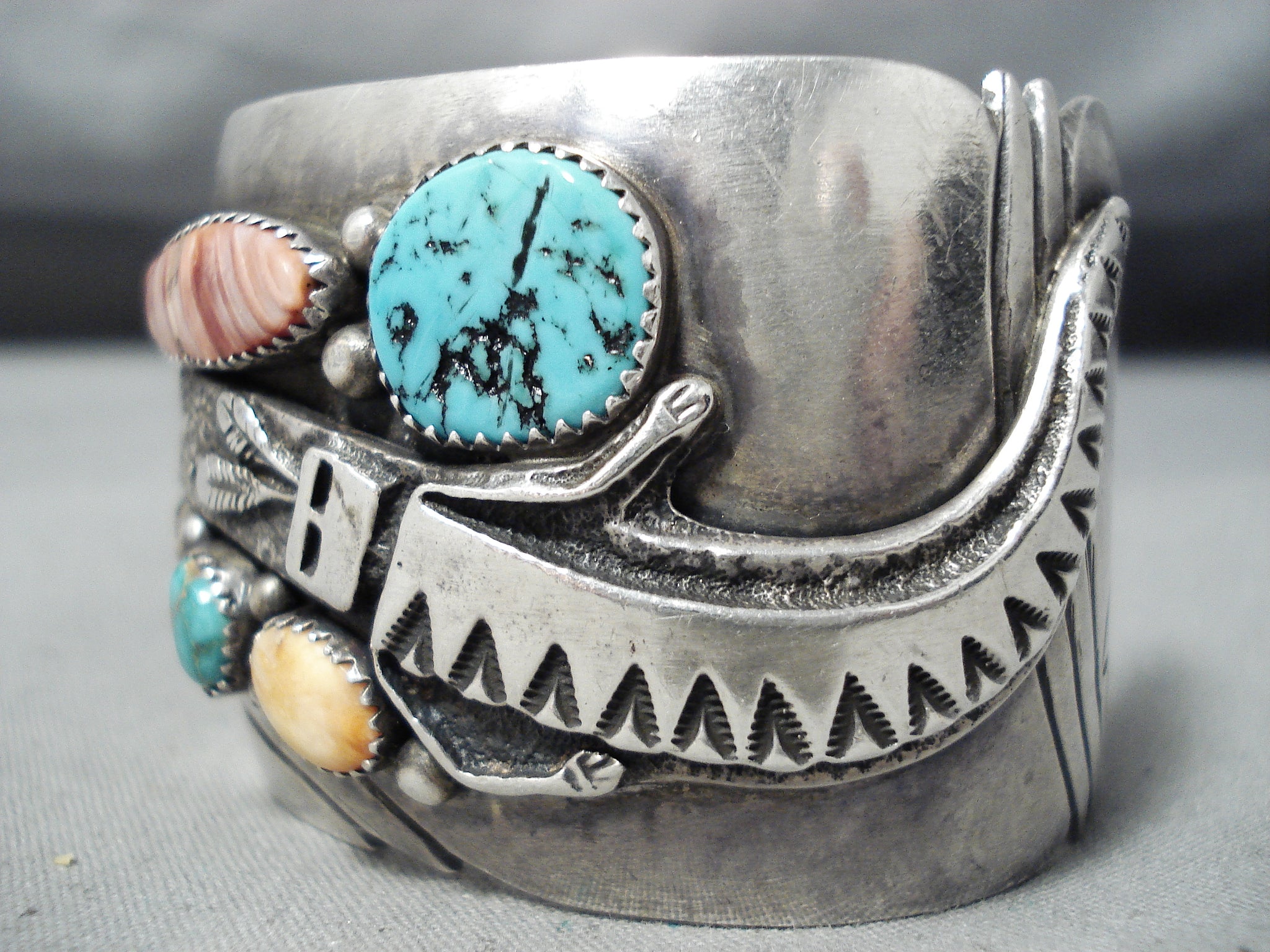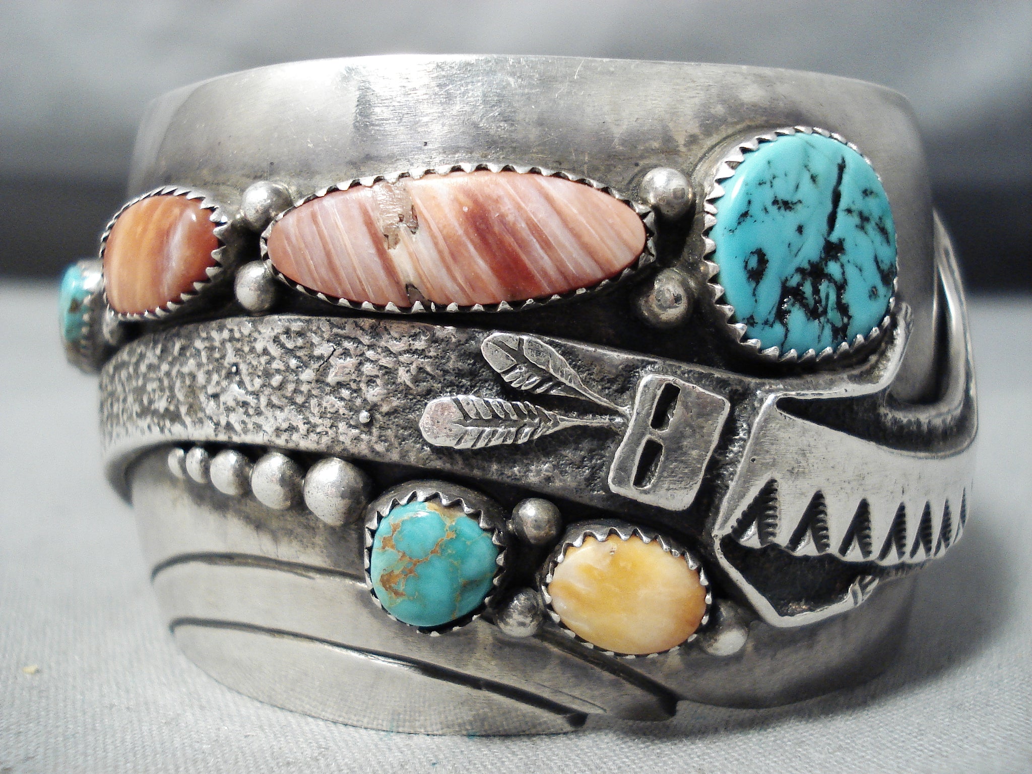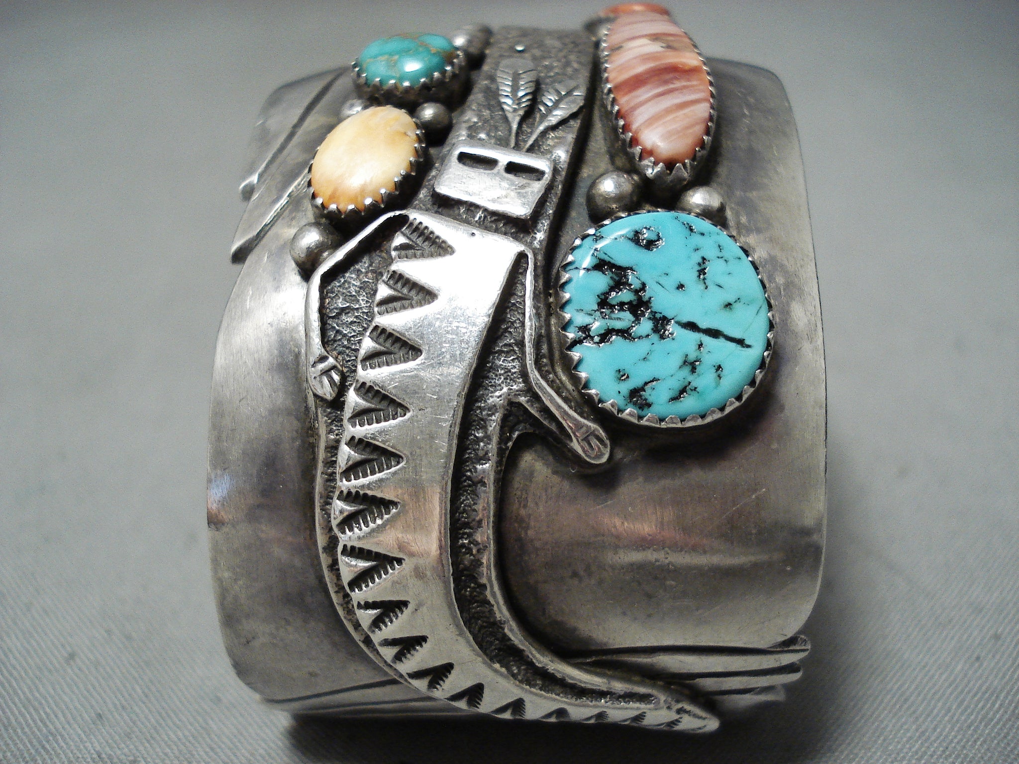 This is an astounding vintage Navajo multiple stone and shell silver kachina bracelet. This remarkable piece contains a wonderful hand carved silver kachina that is beautifully placed on one end of the cuff. Located throughout the cuff are superior spiny oyster shells and turquoise stones. The stones appear to be from both the Royston and old Sleeping Beauty turquoise mine. I love how sturdy and thick this cuff is on this bracelet with accenting raindrops, oblique patterns and wave works. The largest stone measures around 1/2" x 1/2". The width of the bracelet measures around 1-1/2". Sterling silver. Cir. Mid century . The inside end to end measures around 5-1/2" with an additional 1" gap. Sturdy 79 grams.
