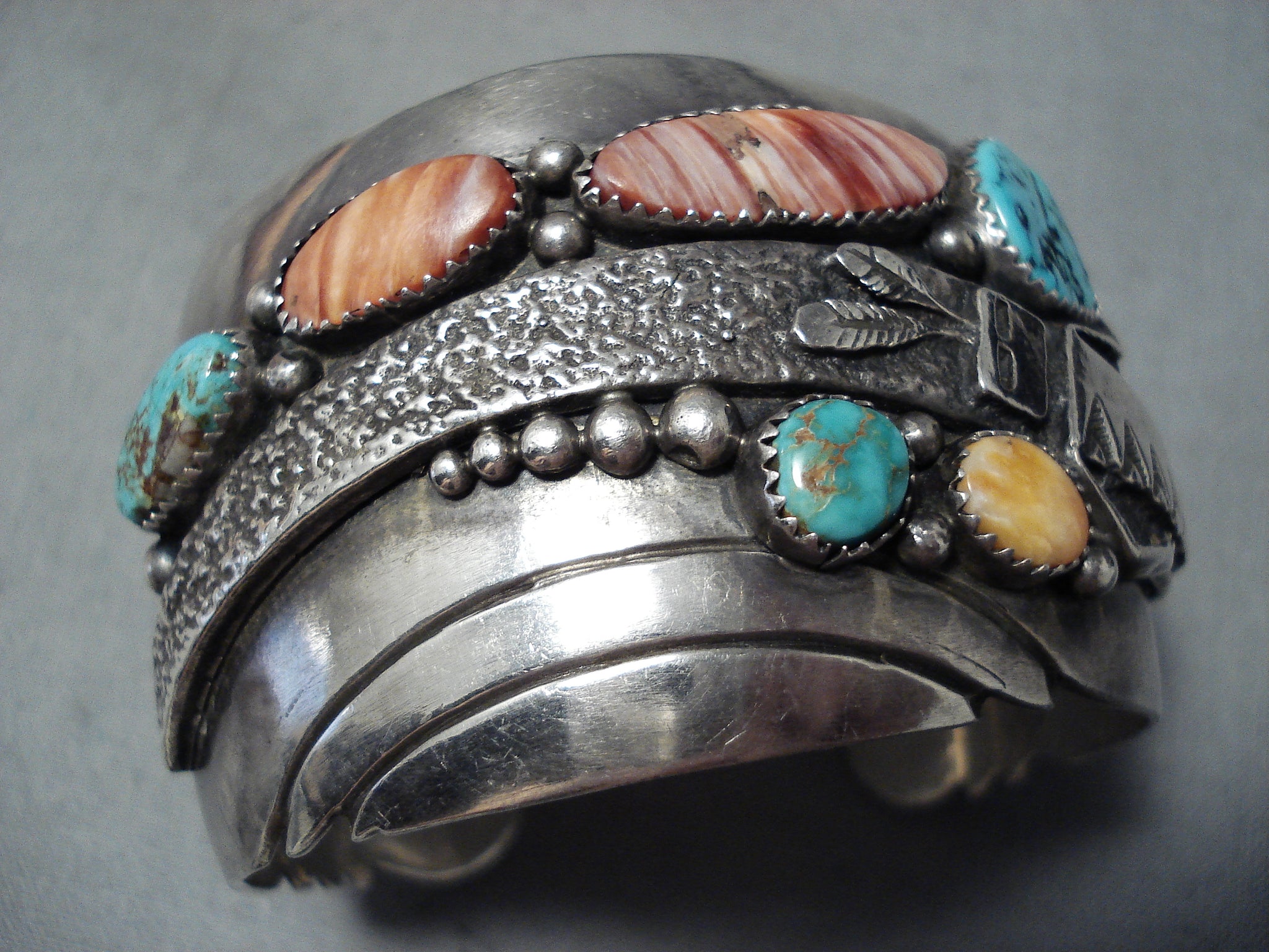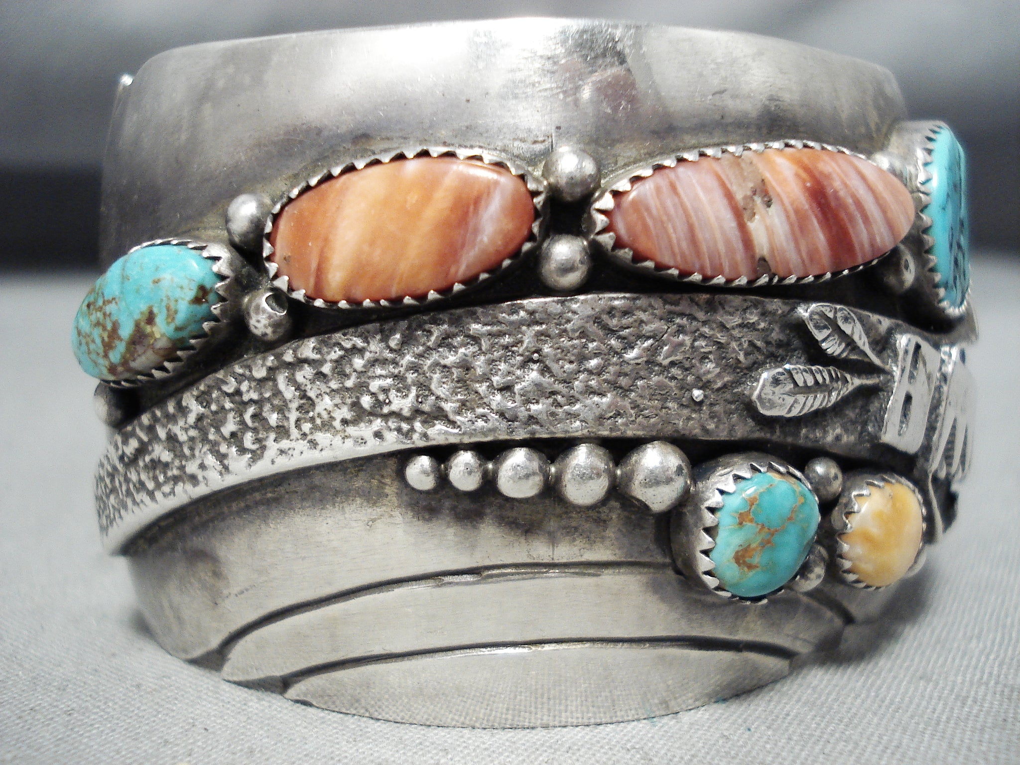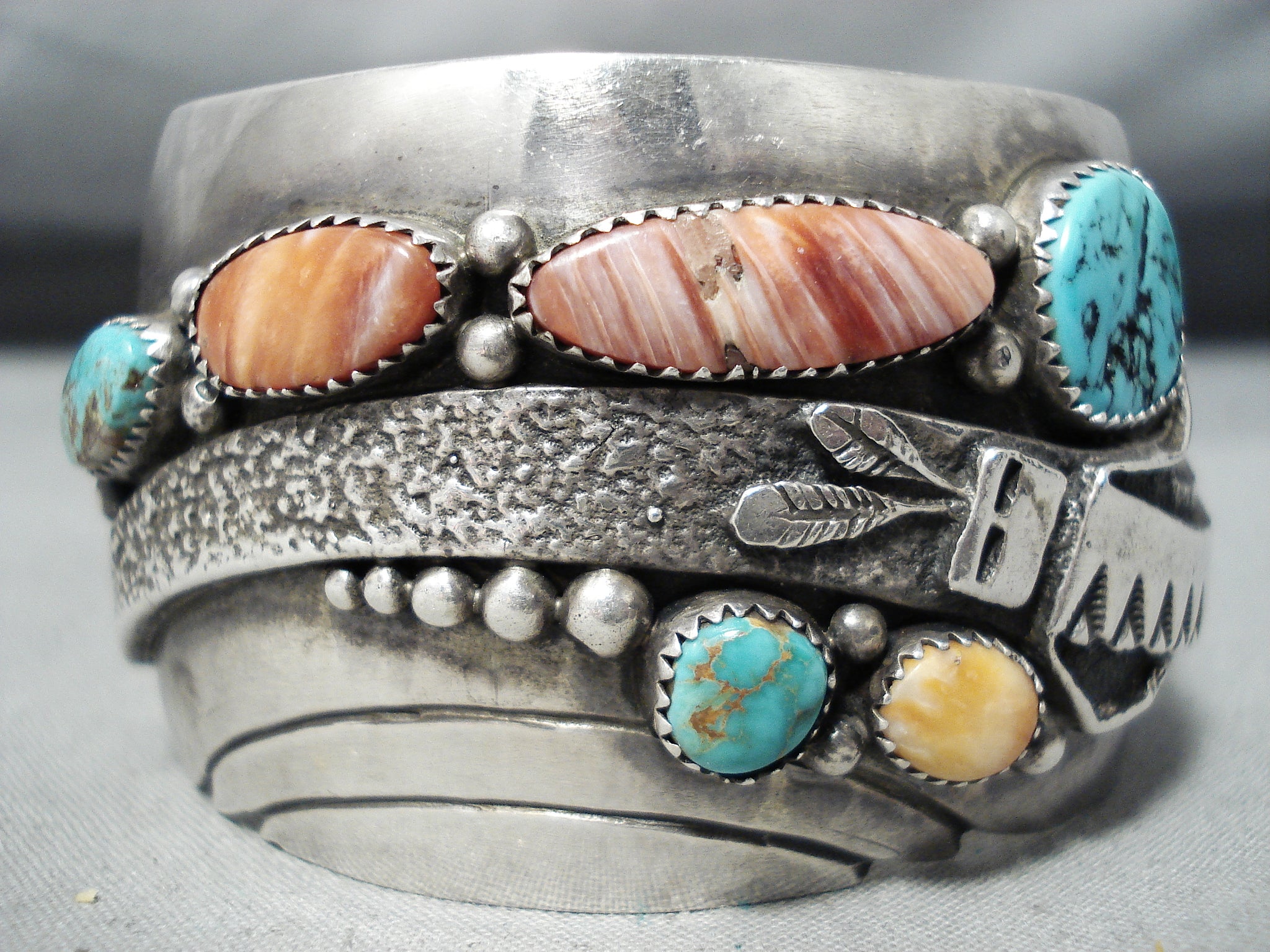 This is an astounding vintage Navajo multiple stone and shell silver kachina bracelet. This remarkable piece contains a wonderful hand carved silver kachina that is beautifully placed on one end of the cuff. Located throughout the cuff are superior spiny oyster shells and turquoise stones. The stones appear to be from both the Royston and old Sleeping Beauty turquoise mine. I love how sturdy and thick this cuff is on this bracelet with accenting raindrops, oblique patterns and wave works. The largest stone measures around 1/2" x 1/2". The width of the bracelet measures around 1-1/2". Sterling silver. Cir. Mid century . The inside end to end measures around 5-1/2" with an additional 1" gap. Sturdy 79 grams.