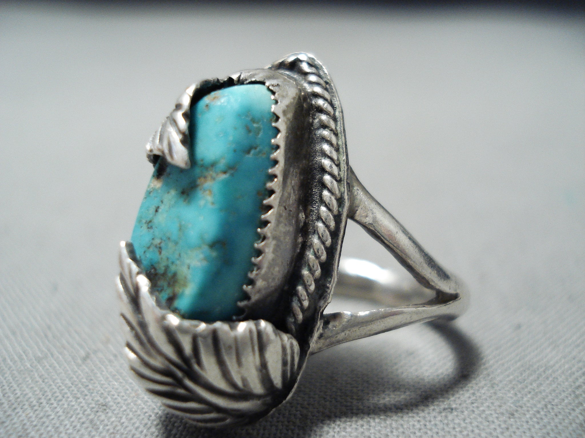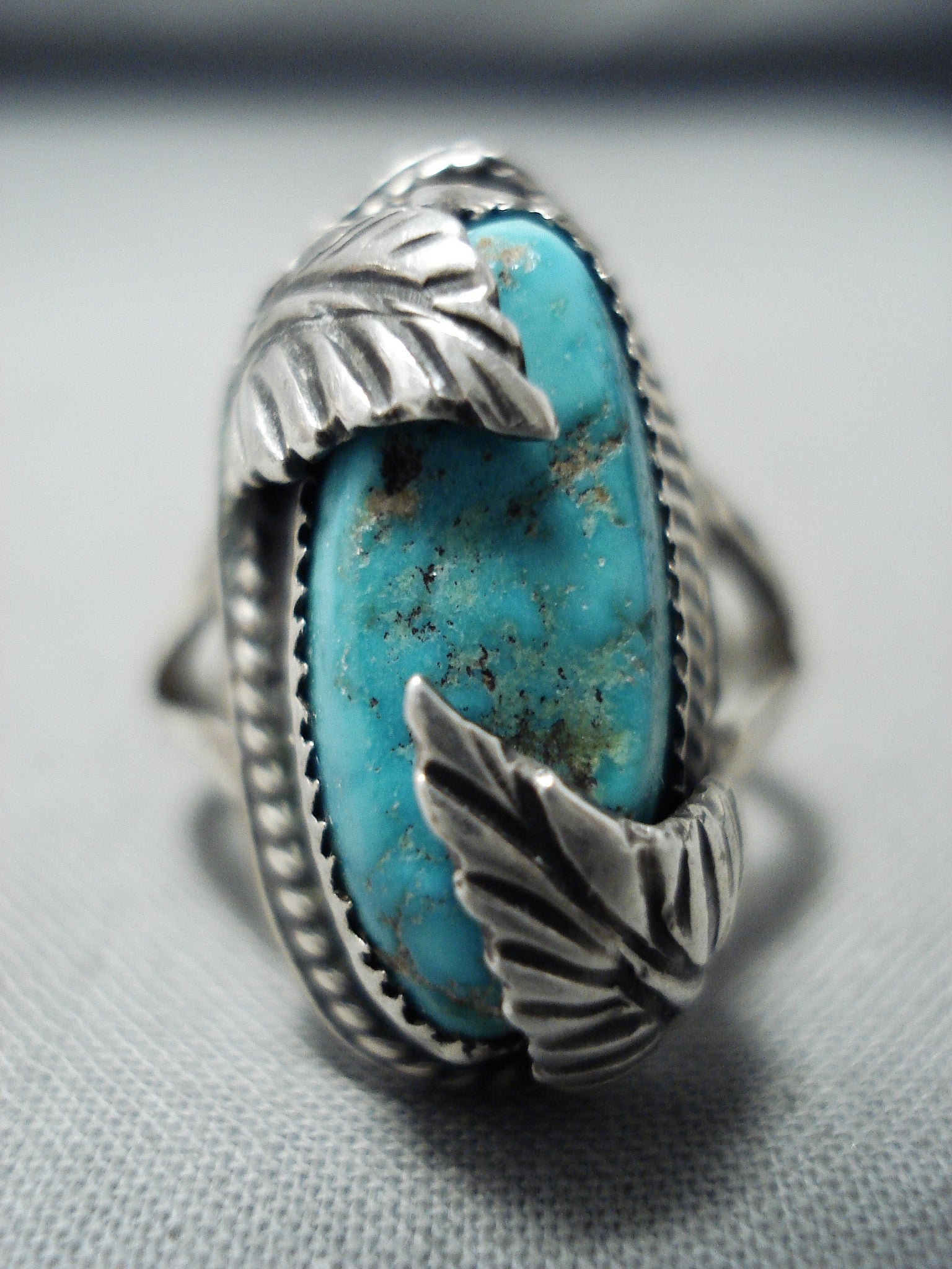 This is an incredible Navajo silver ring. The tall turquoise stone is surrounded with silver rope and then nestled among two silver leaves! The center stone measures around 11/16" x 1/4". The ring face measures around 7/8" x 3/4". Signed by Navajo artist, Kay Rogers. The ring size is around 7. Sterling silver. Sturdy 6 grams.