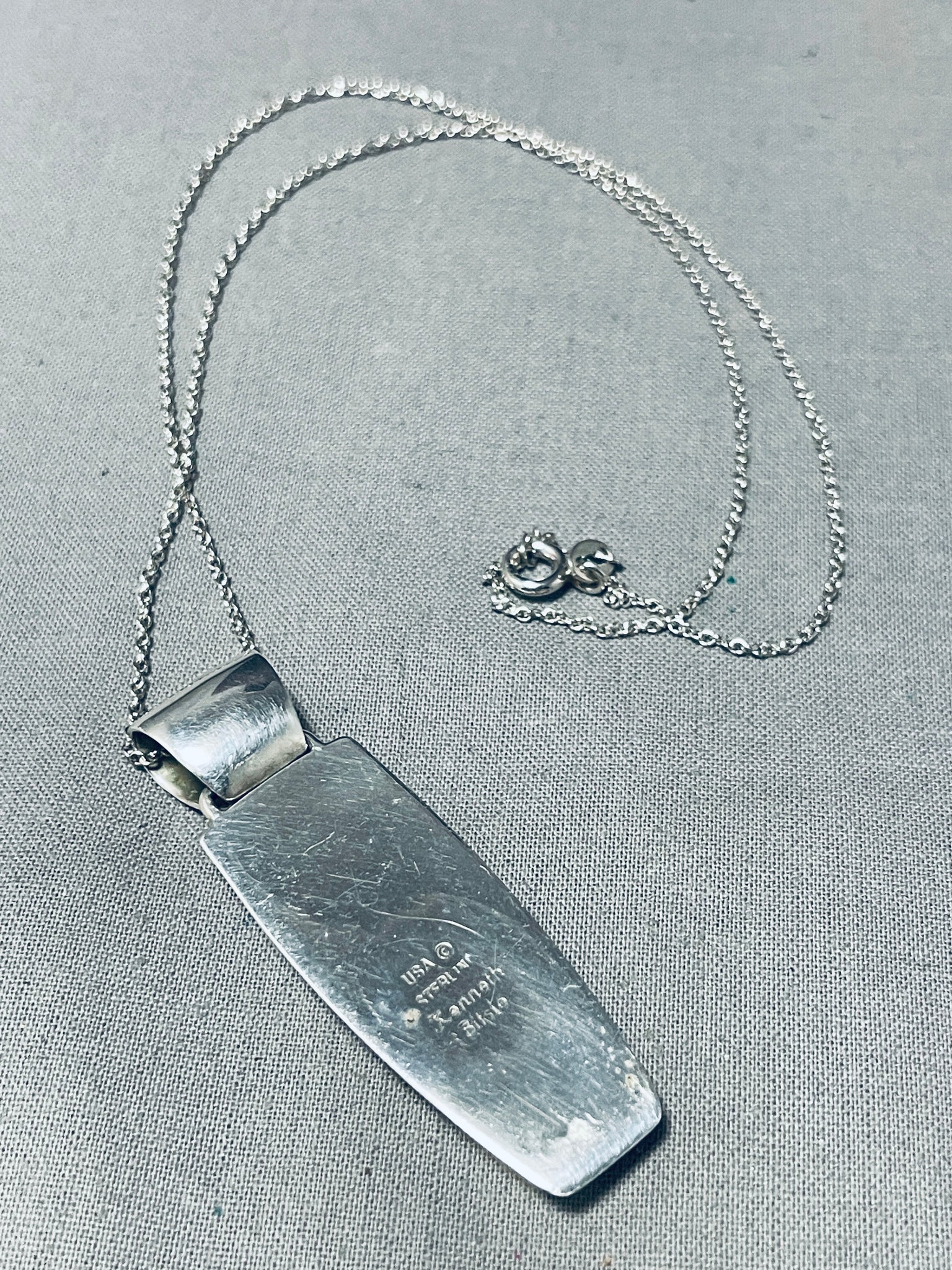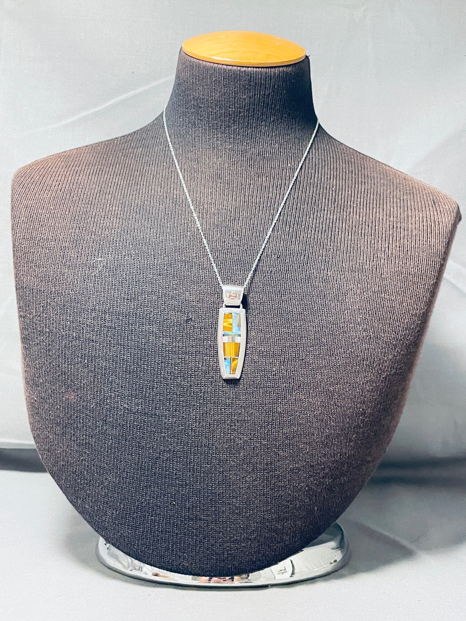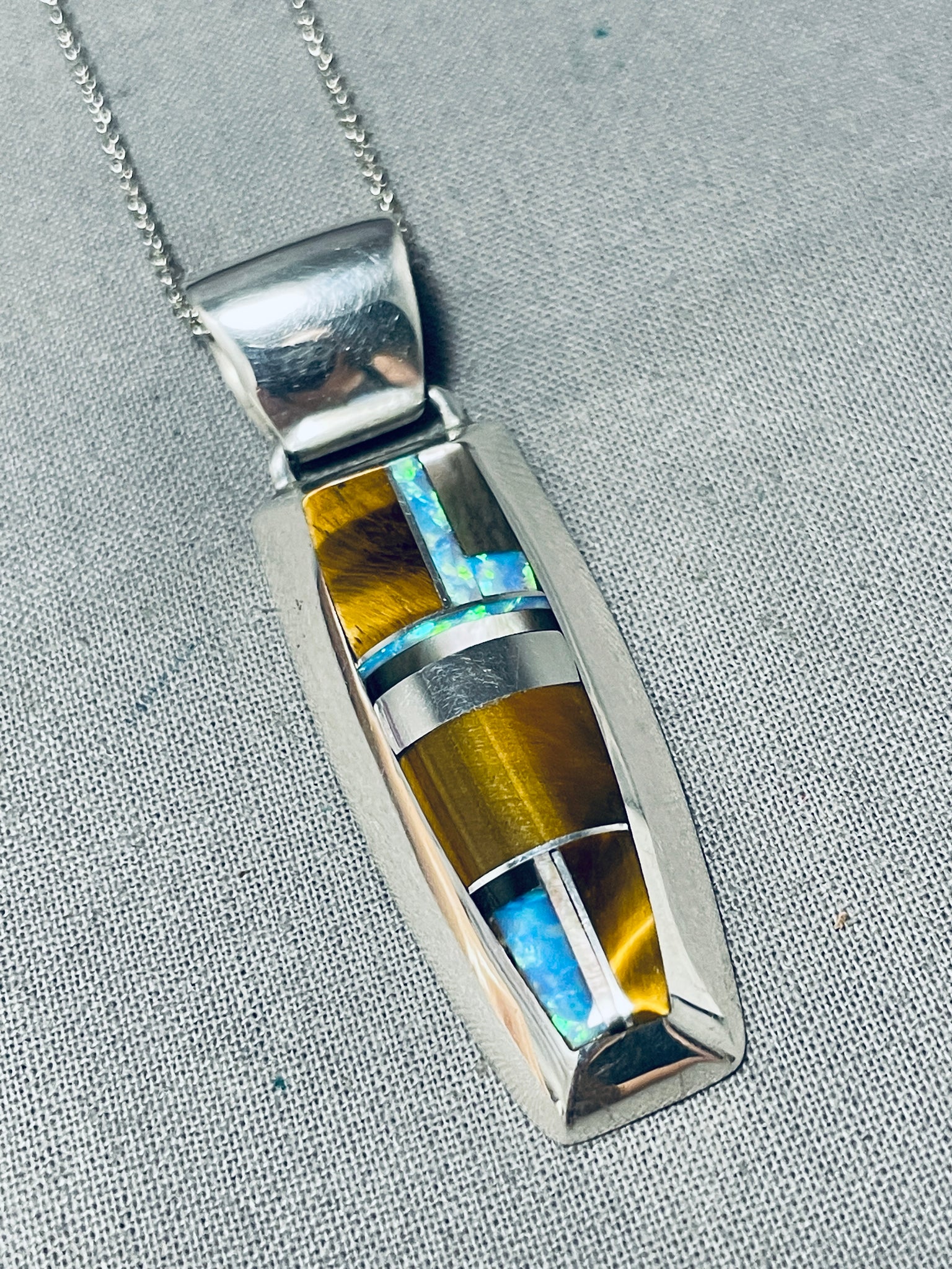 Kenny Bitsue Signed Native American Navajo Inlay Tigers Eye Opal Sterling Silver Necklace
