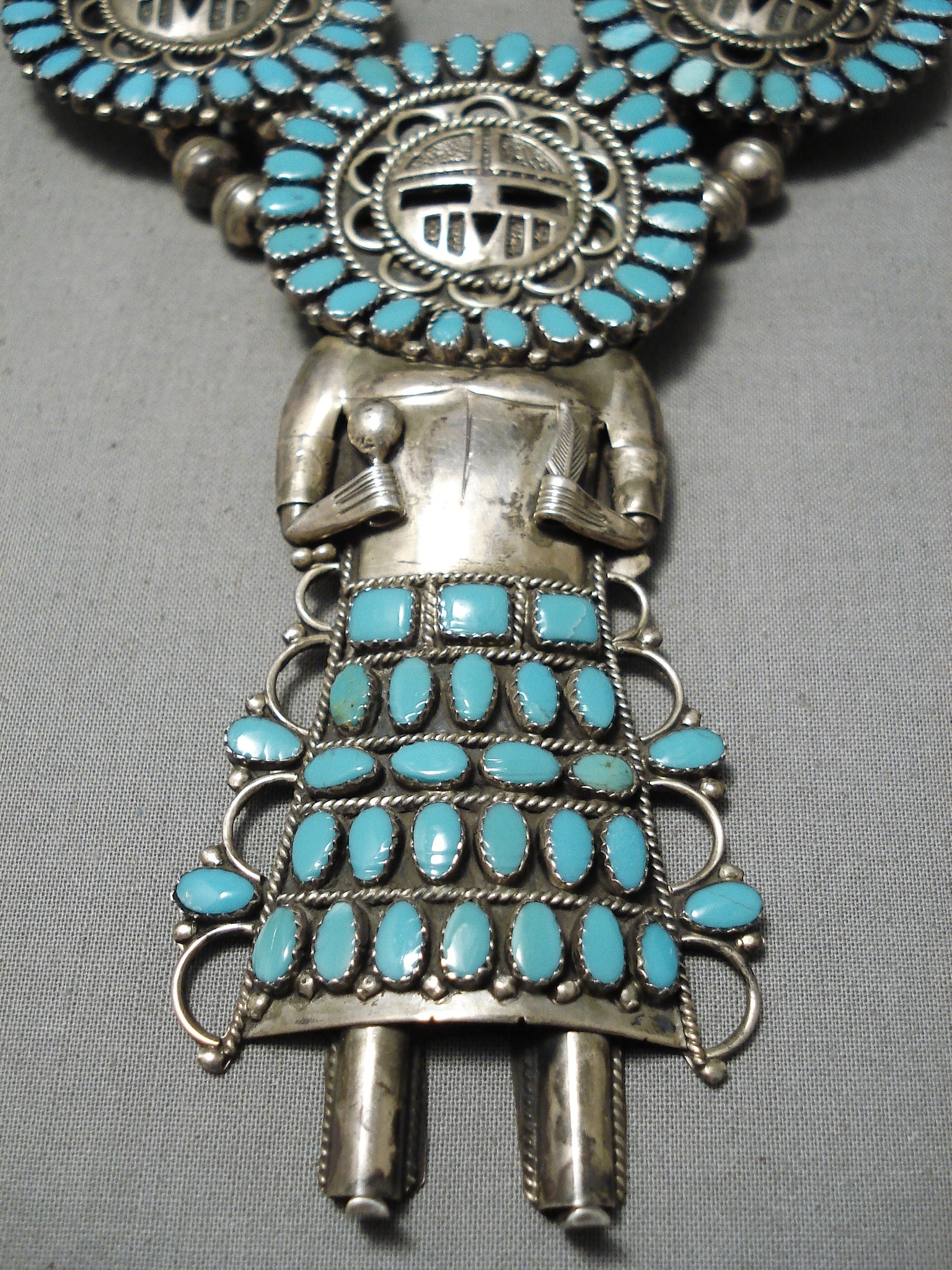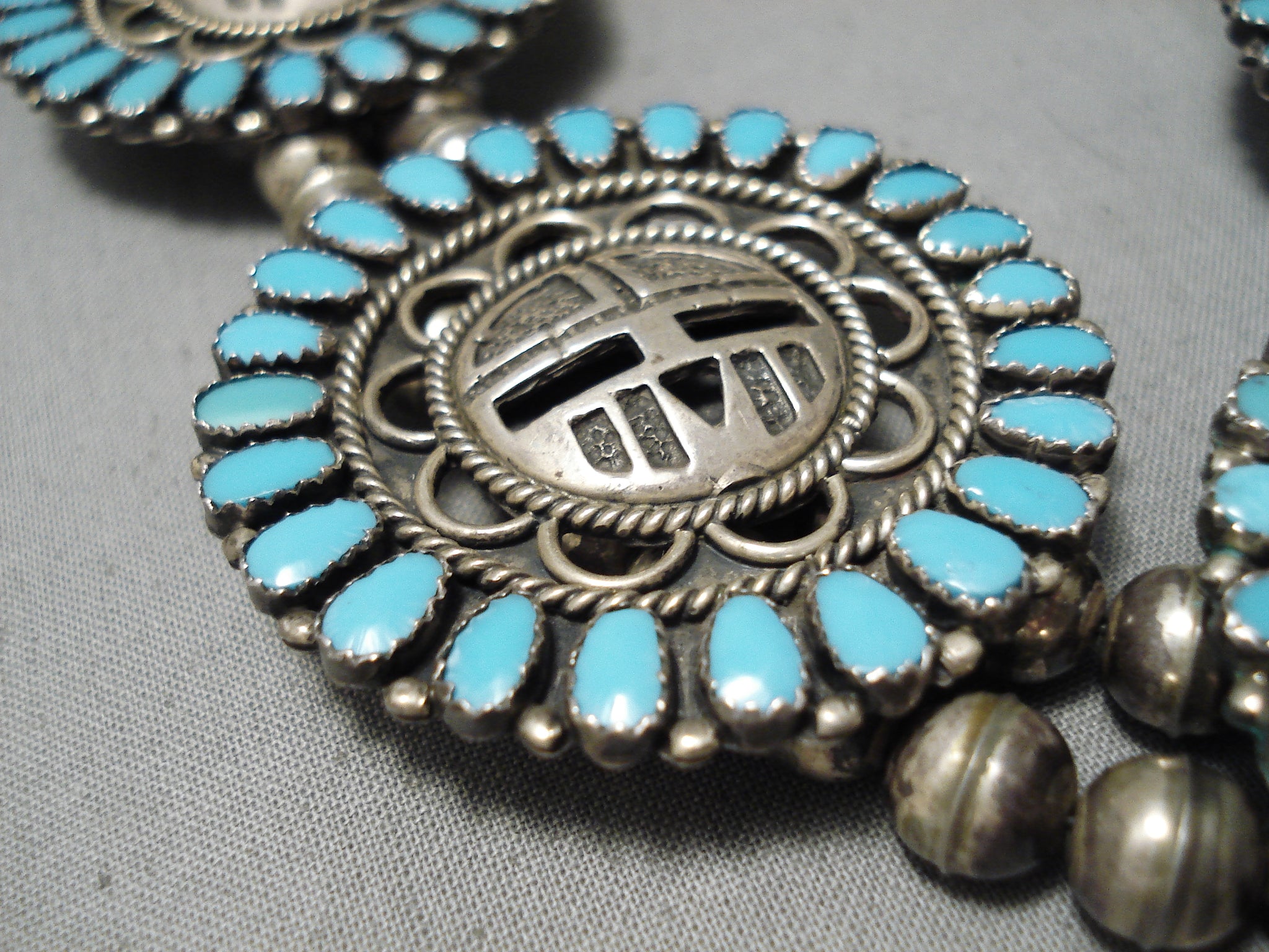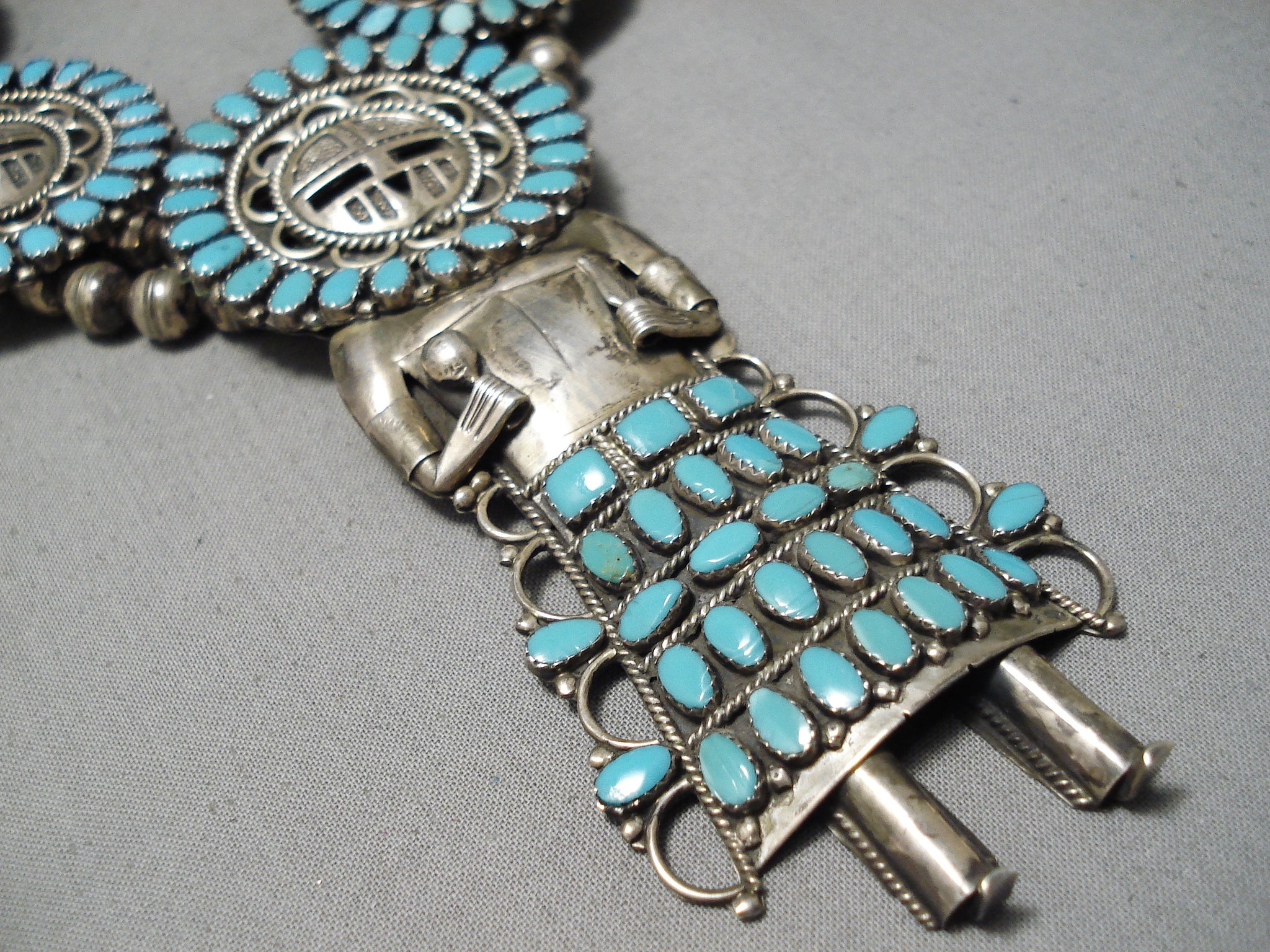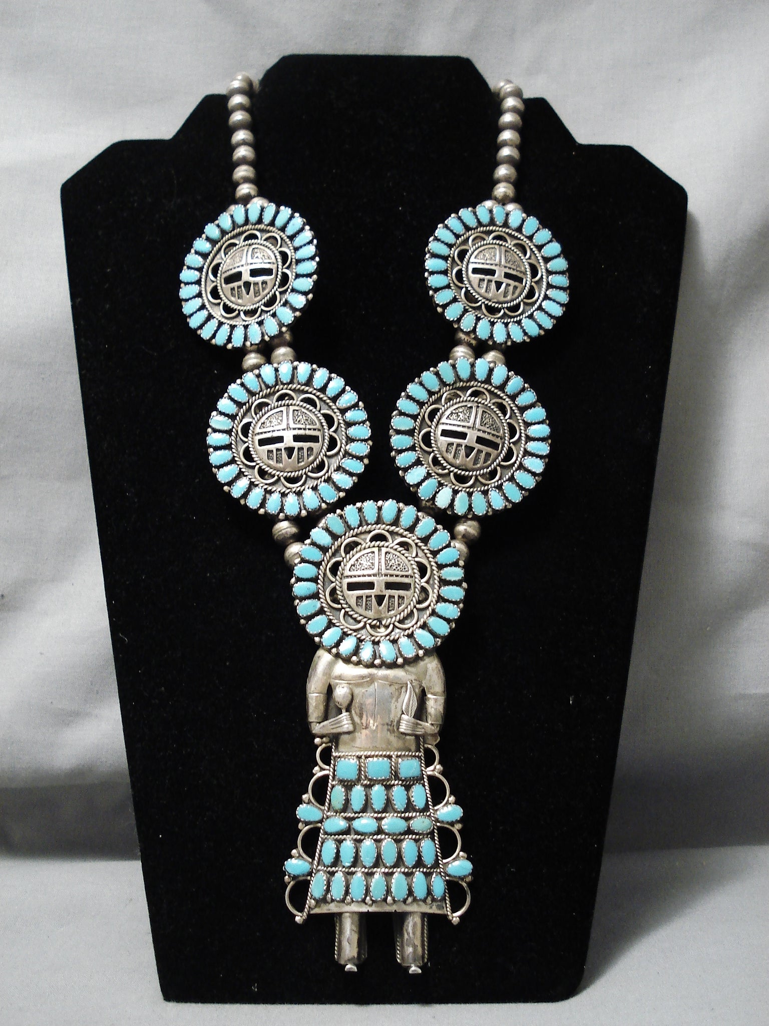 Larry Mos Begay Vintage Native American Navajo Turquoise Sterling Silver Squash Blossom Necklace