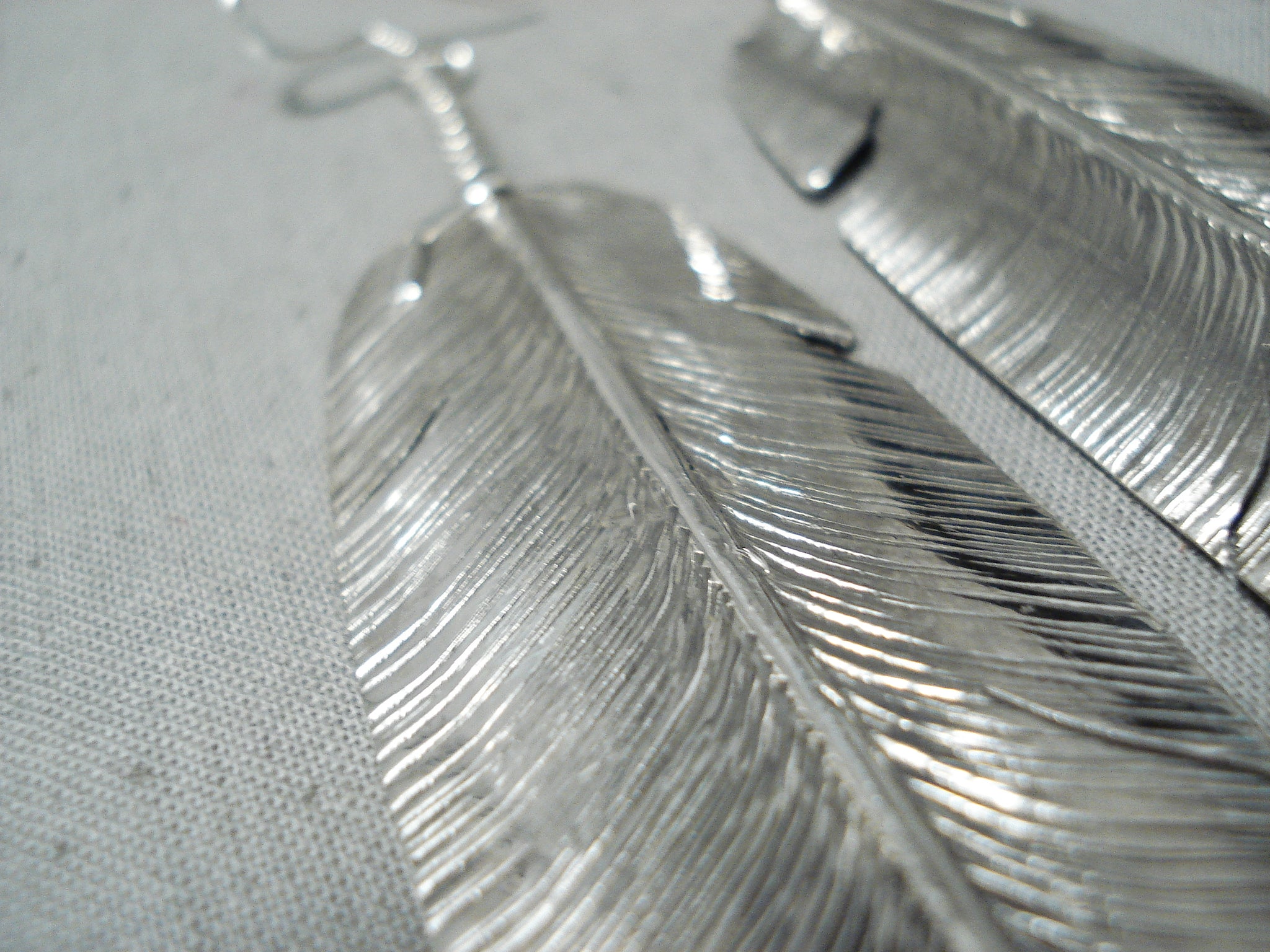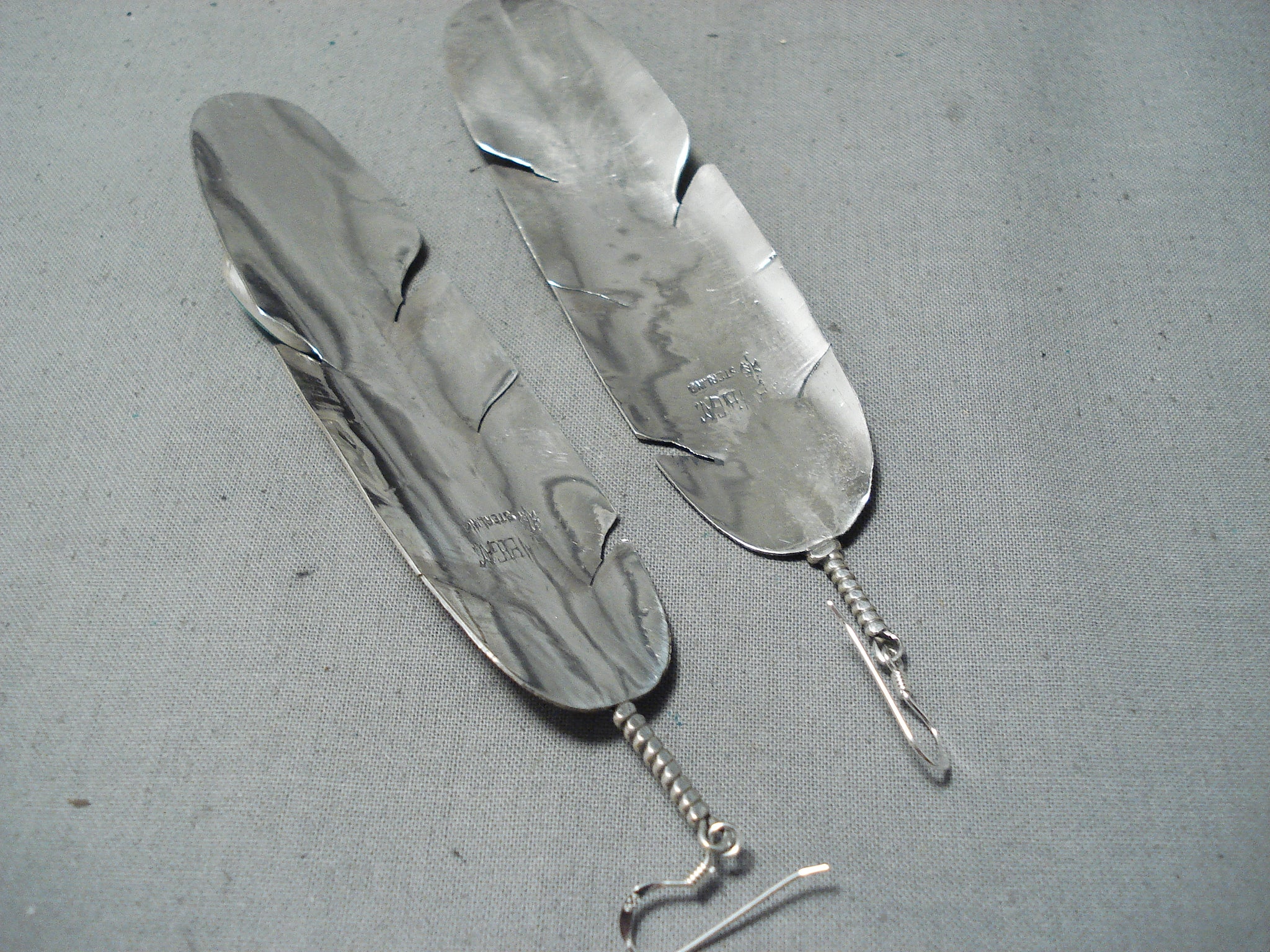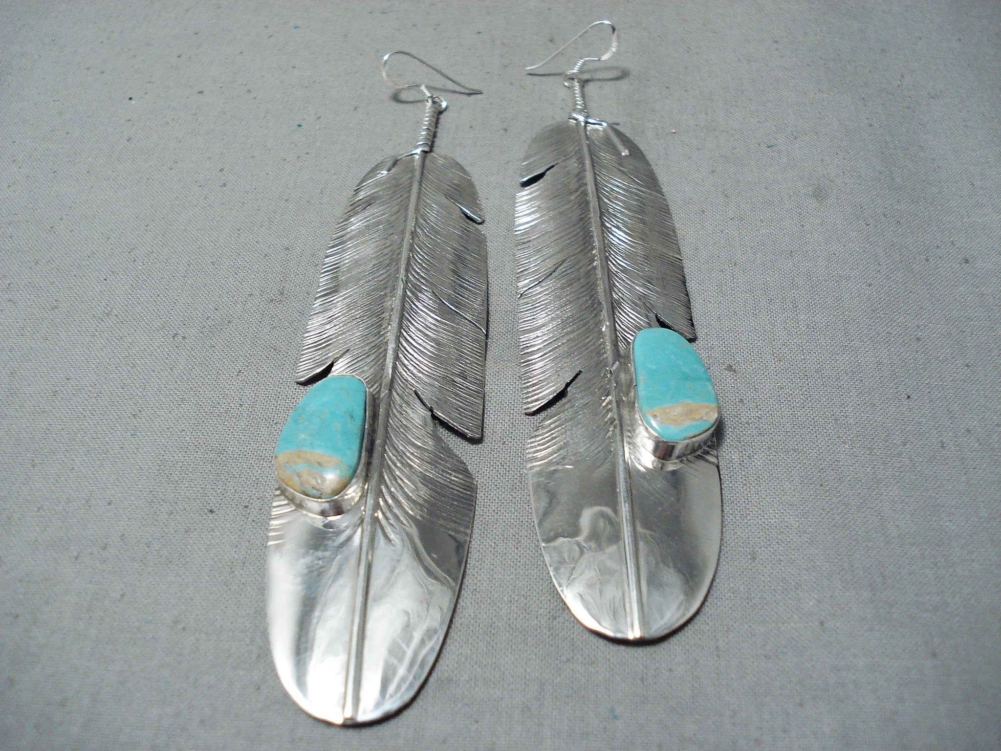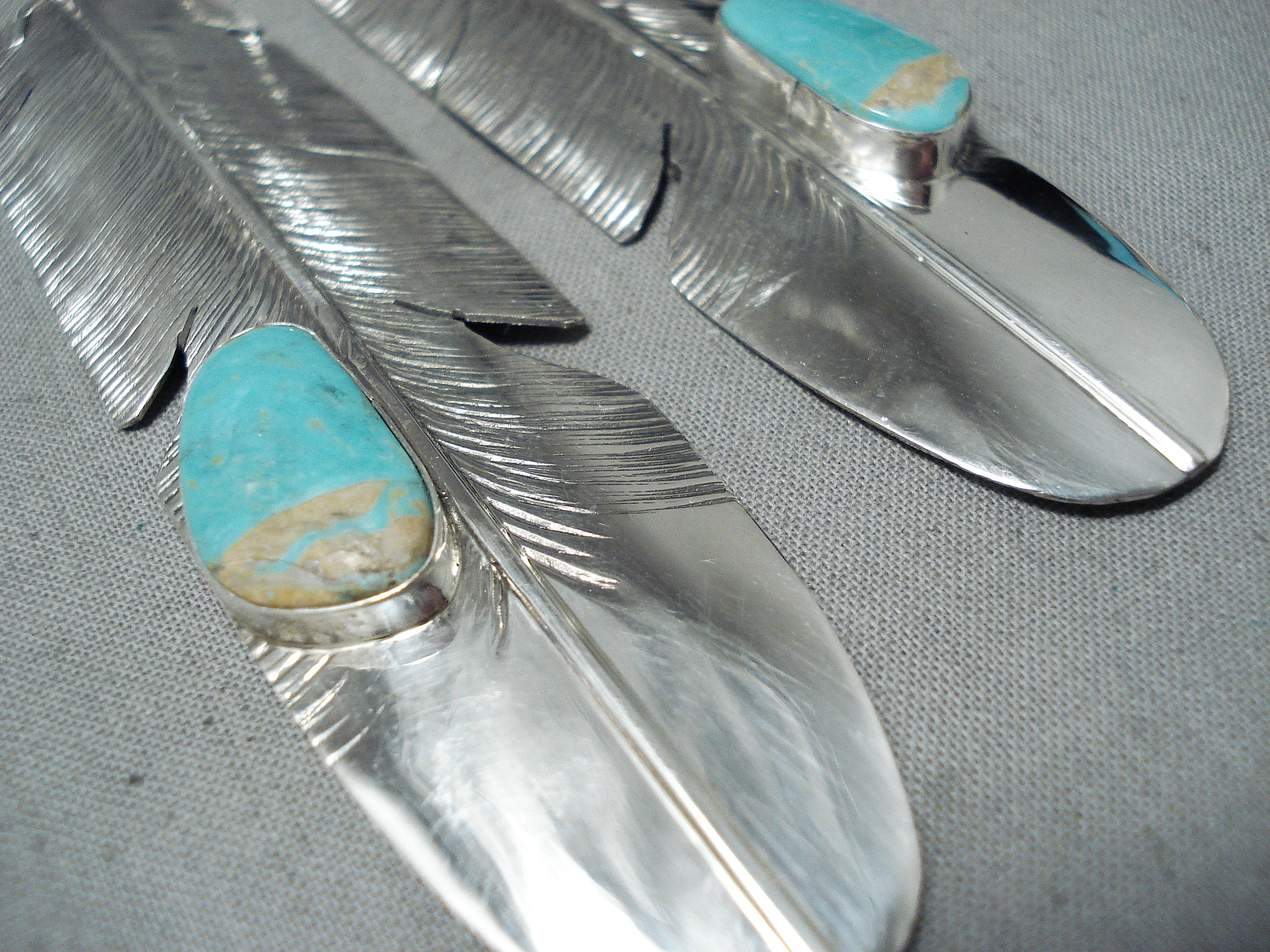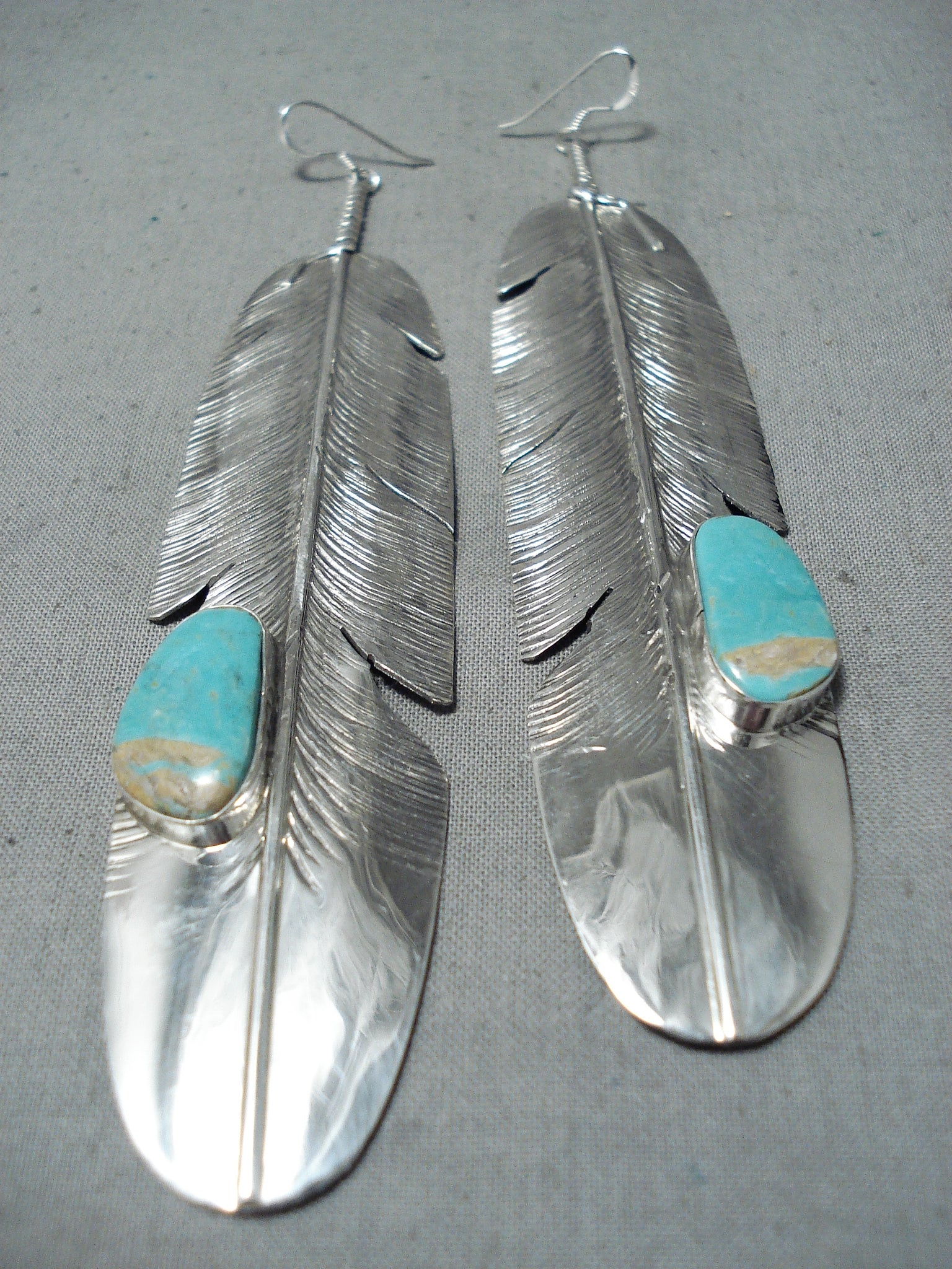 Longest 4' Long Native American Navajo Royston Turquoise Sterling Silver Feather Earrings