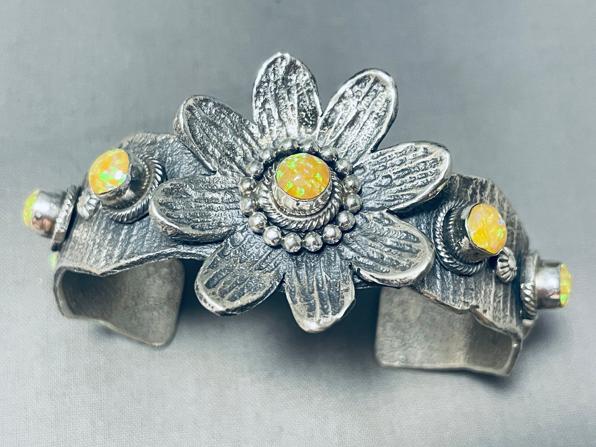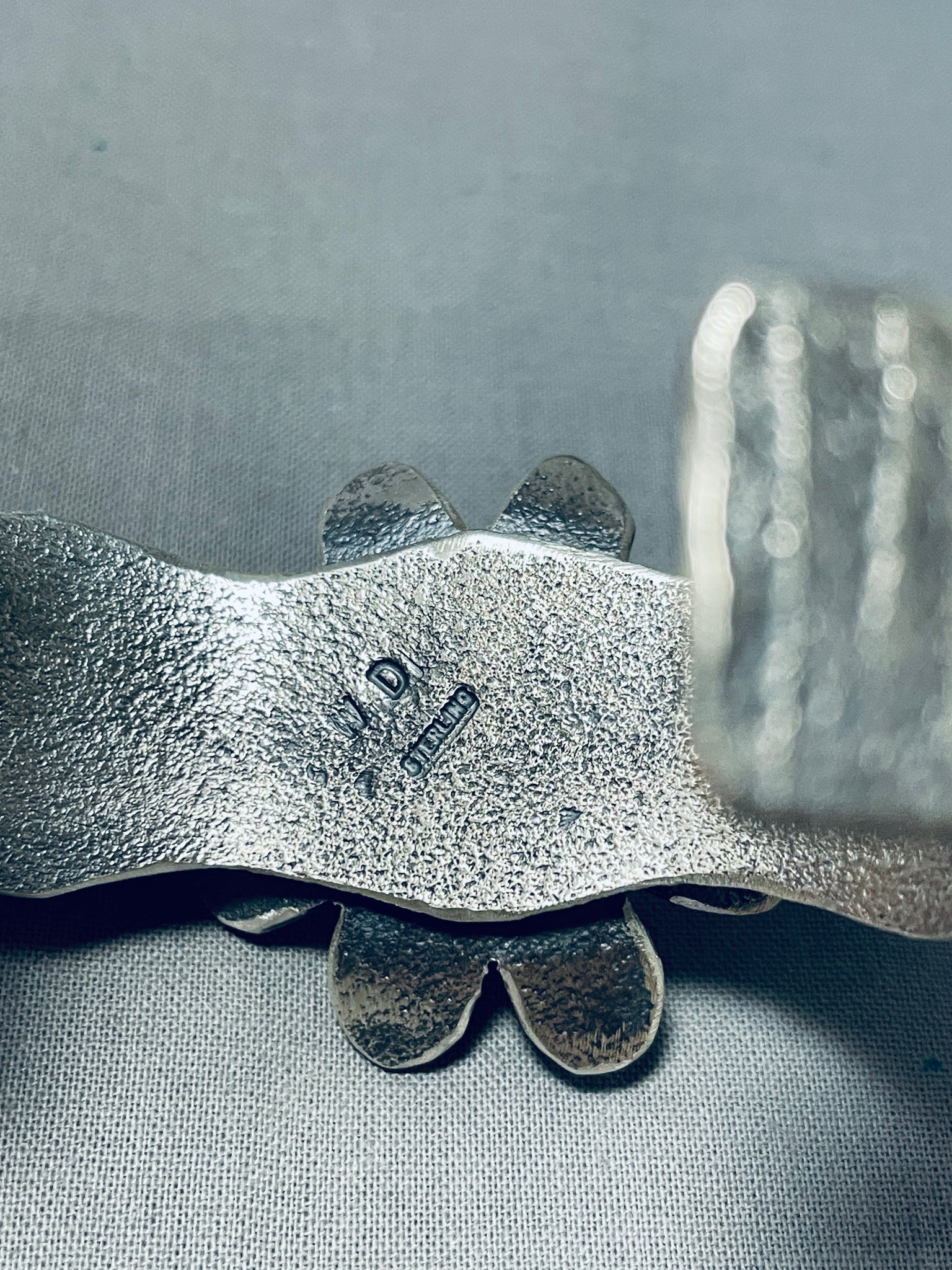 We are excited to auction off this sparkling Navajo bracelet! It features a large hand carved silver flower, 7 synthetic opals, silver rope, silver beads, and silver stars, all on a textured solid silver cuff! Such a unique design! The center stone measures around 1/4" x 1/4". The width of the bracelet measures around 1-1/2". Signed by Navajo artist, W.D. Sterling silver, marked. The inside end to end measures around 5-3/4" with an additional 1-3/8" gap. Sturdy 68 grams.