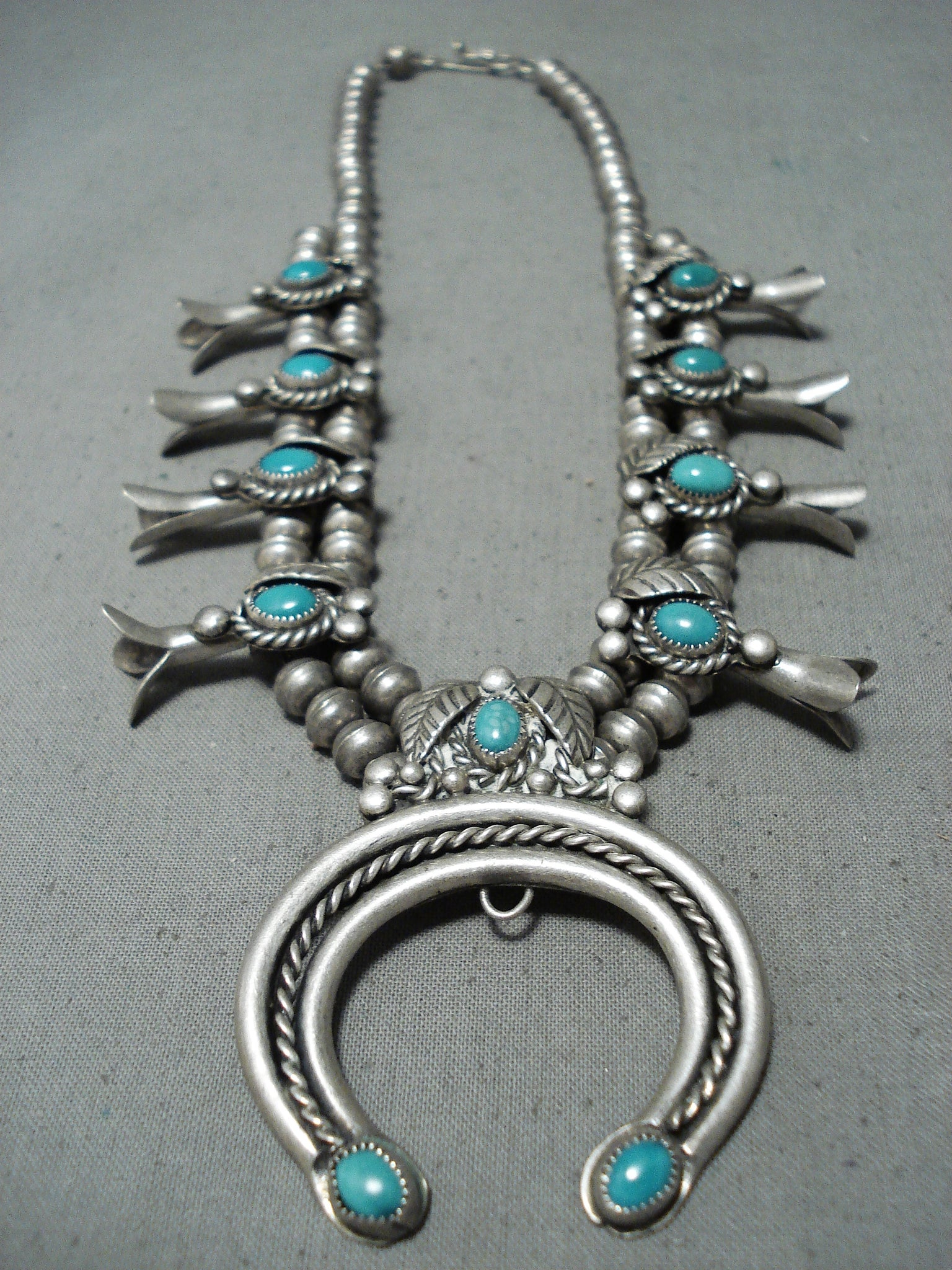 Magnificent Vintage Native American Navajo Old Kingman Sterling Silver Squash Blossom Necklace
