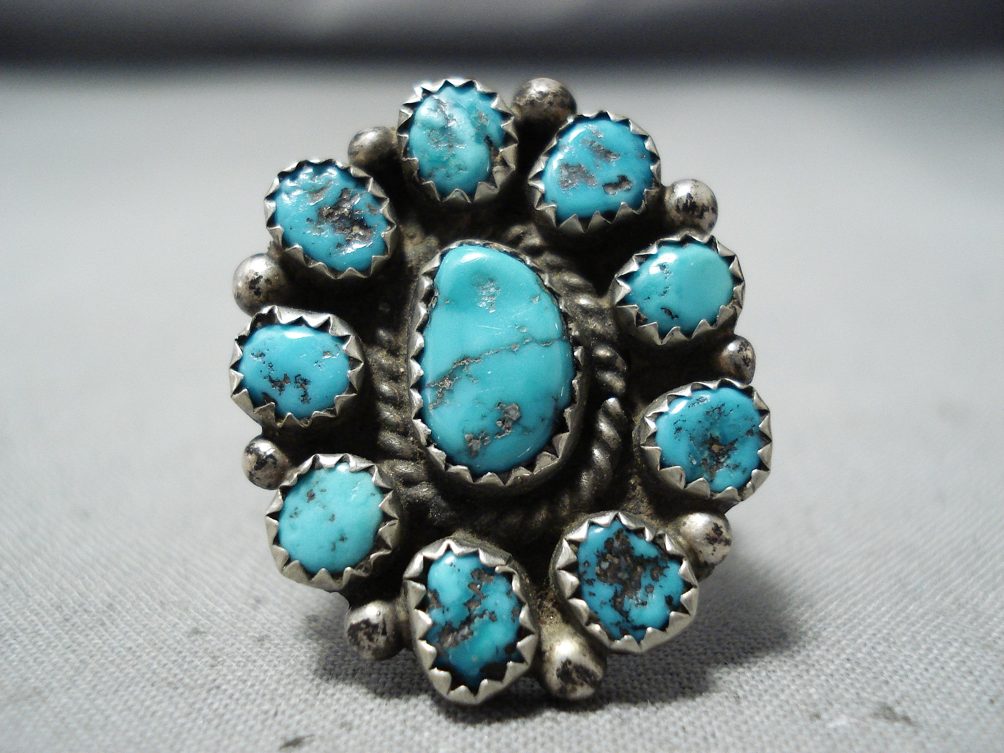 Maravelous Vintage Native American Navajo Turquoise Cluster Sterling Silver Ring Old