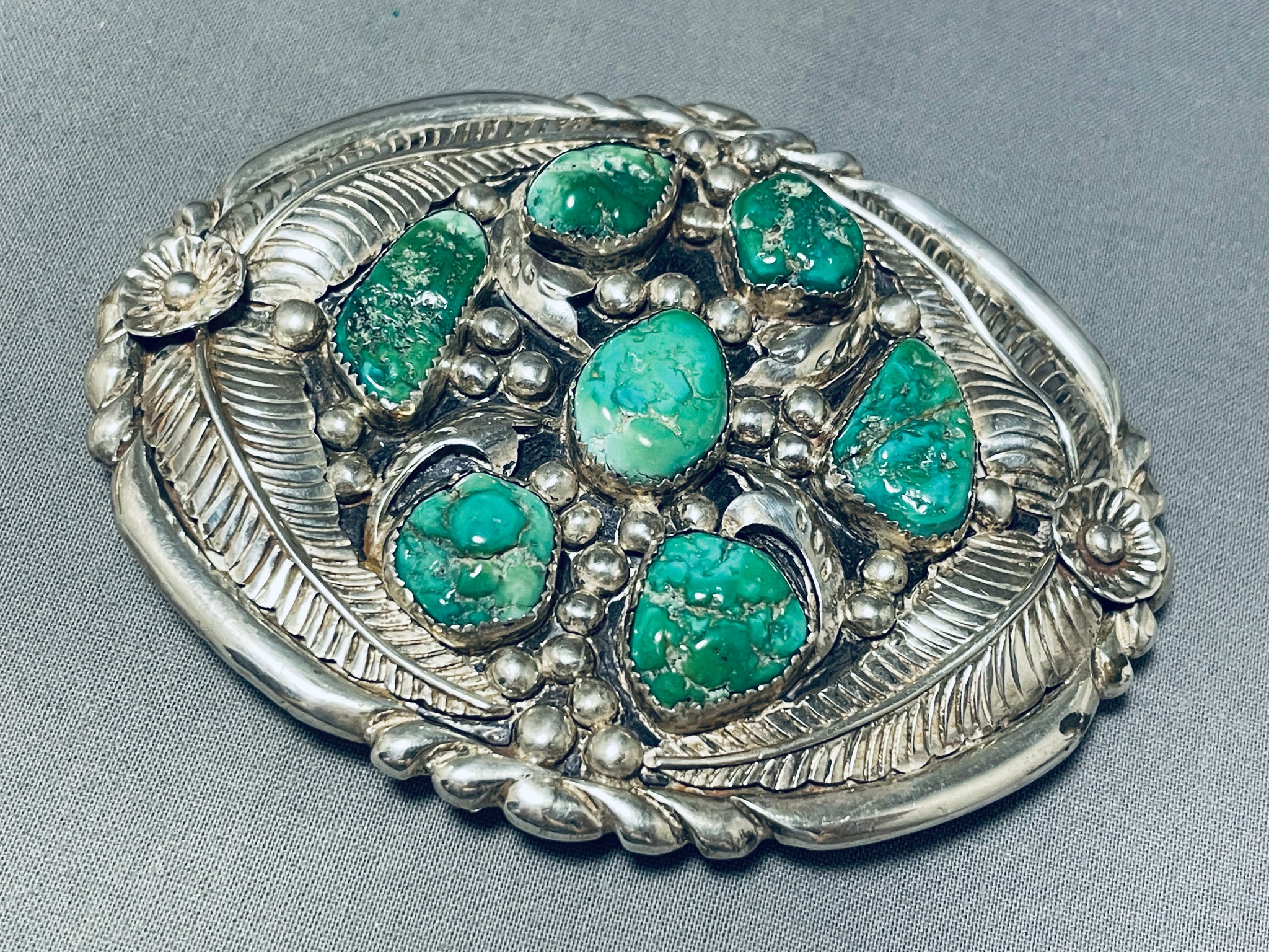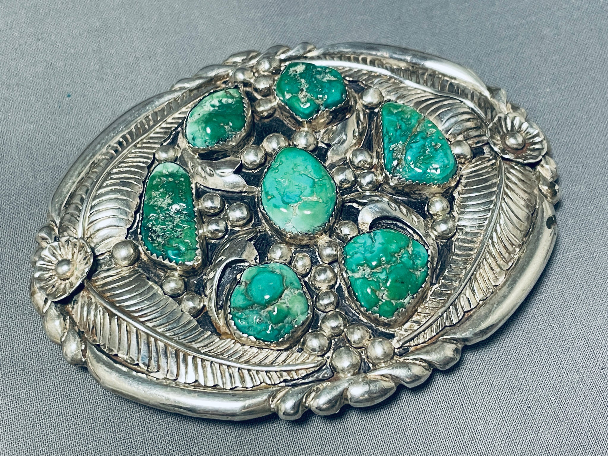 This is a magnificent vintage Navajo large turquoise stone thick silver buckle handmade by the very famous artist, Mark Chee. This amazing superior large thick silver buckle consists of 7 very rare large chunky green Kingman turquoise stones. Located on this buckle are phenomenal silver works that include raindrops, fans, flowers, wave patterns and huge accenting detailed silver leaves. The buckle measures around 3-3/4" X 3" and can fit a belt width of about 1-5/8" or less. The center stone measures around 3/4" x 1/2". Sterling silver. Signed by Navajo artist, Mark Chee. Cir. 1960's+. Sturdy 102 grams.