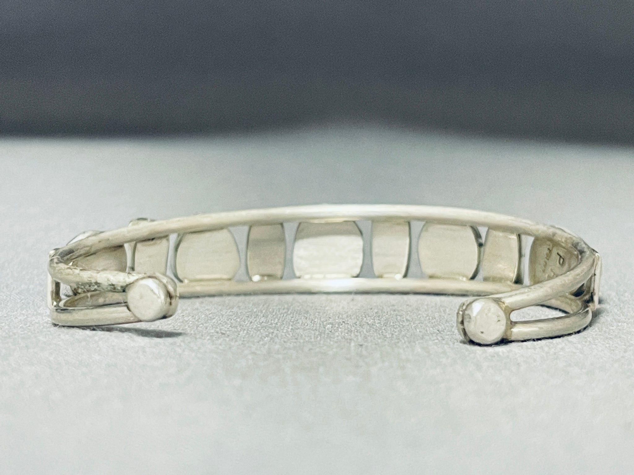 Up for sale is this remarkable Navajo bracelet featuring alternating Old Kingman turquoise and coral stones, on a graduated double rail silver cuff! Truly Noteworthy! The largest stone measures around 3/8" x 3/8". The width of the bracelet measures around 1/2". Signed by Navajo artist, P.R. Sterling silver, marked. The inside end to end measures around 5-5/8" with an additional 1-5/8" gap. Sturdy 18 grams.