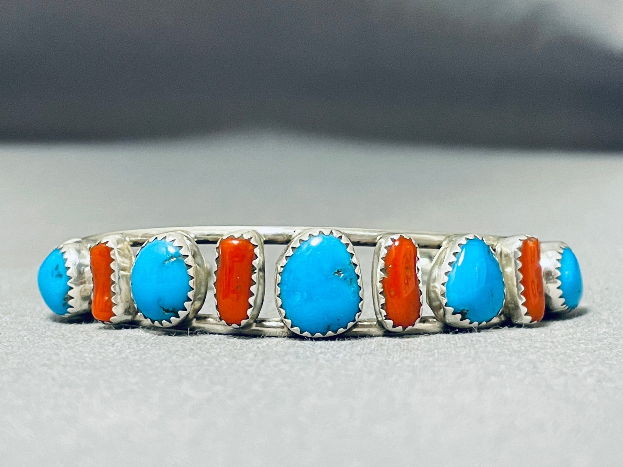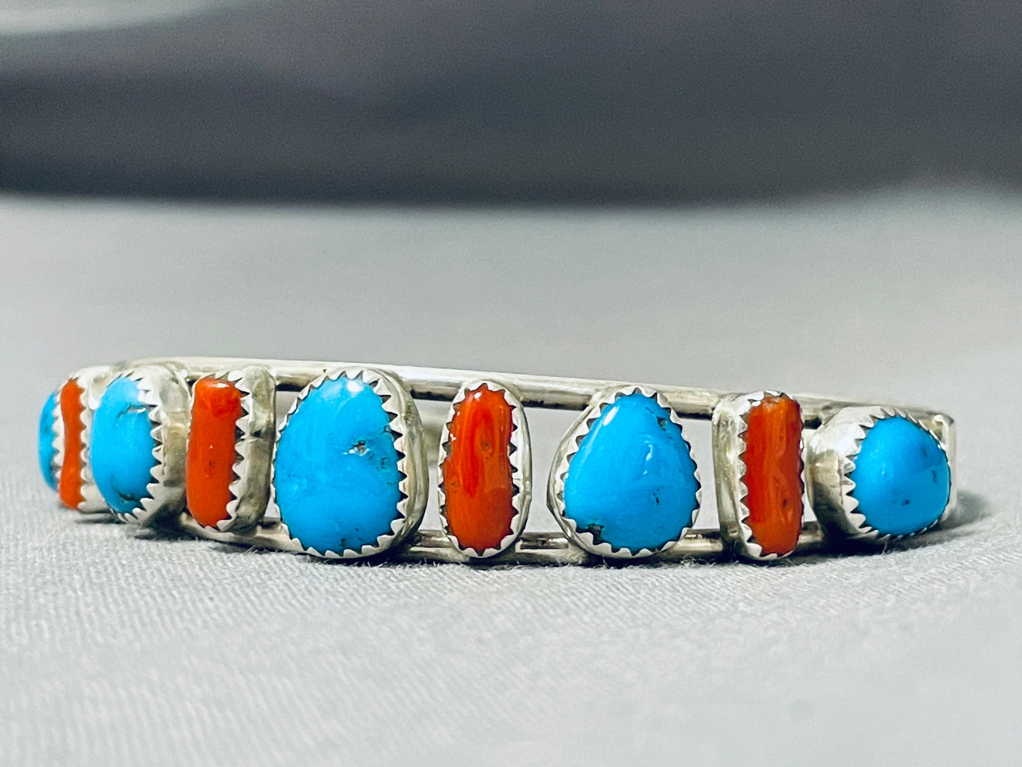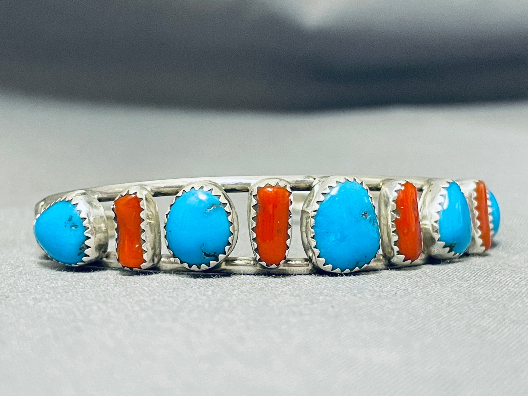 Marvelous Native American Navajo Old Kingman Turquoise Coral Sterling Silver Bracelet