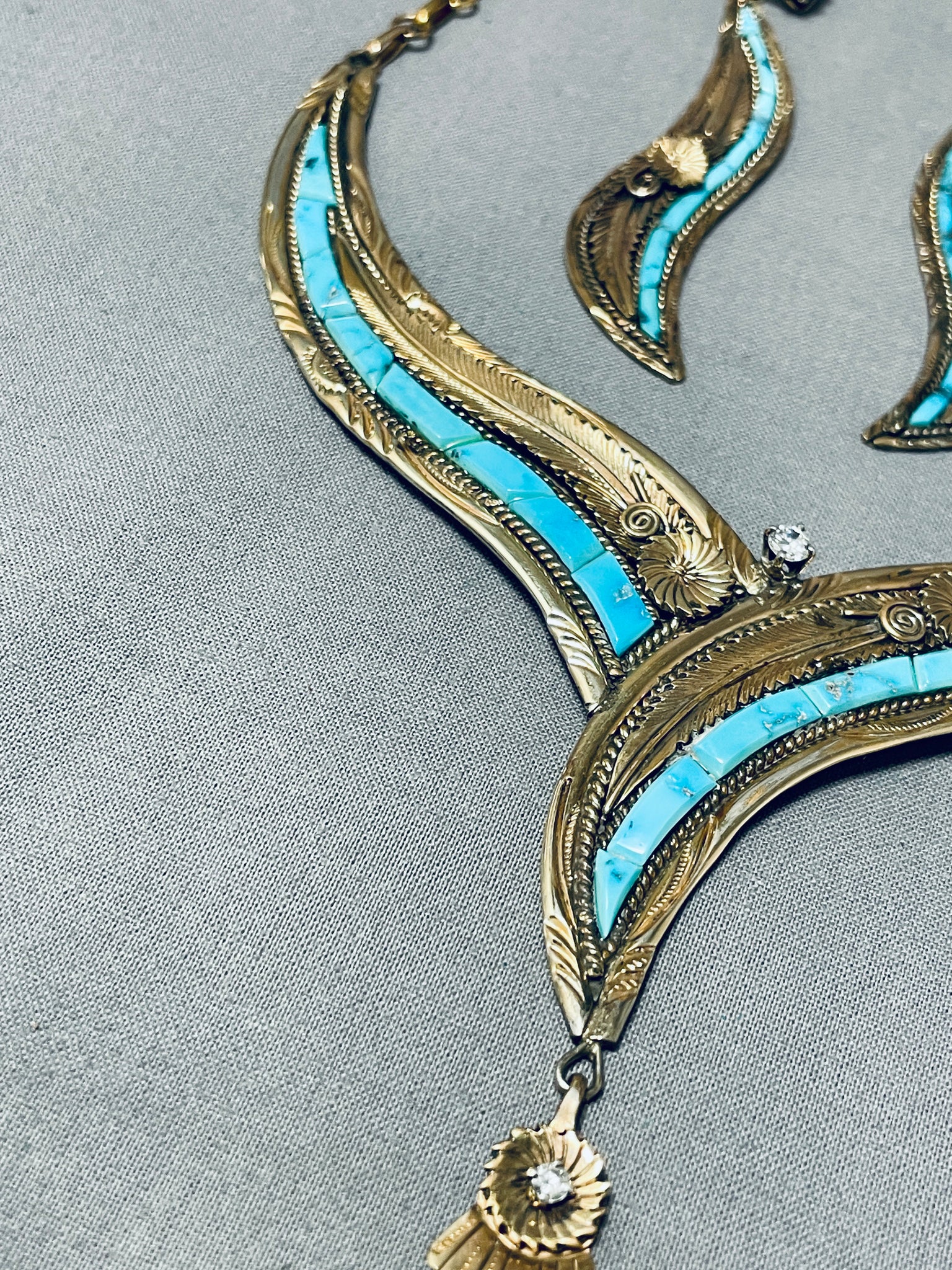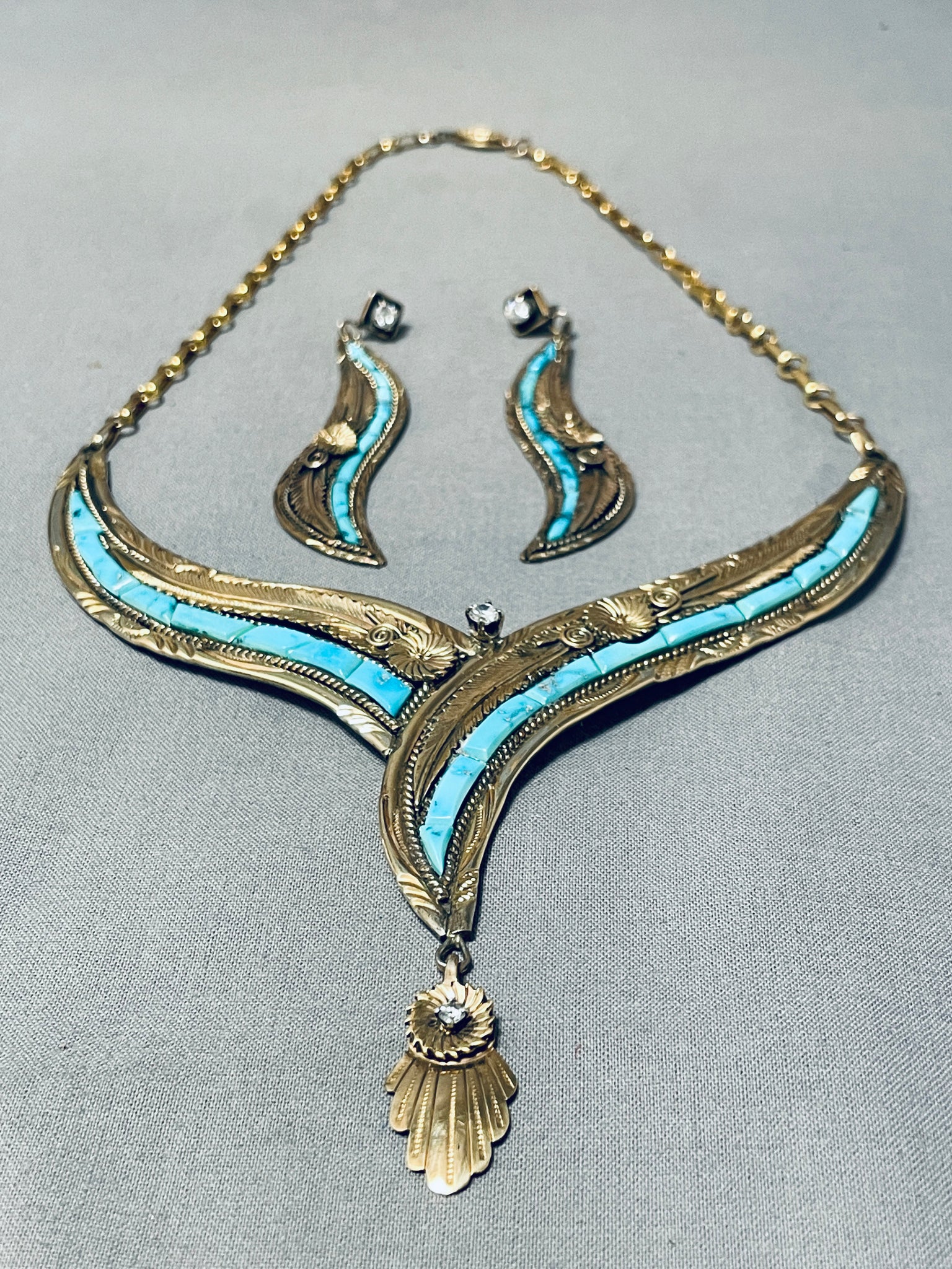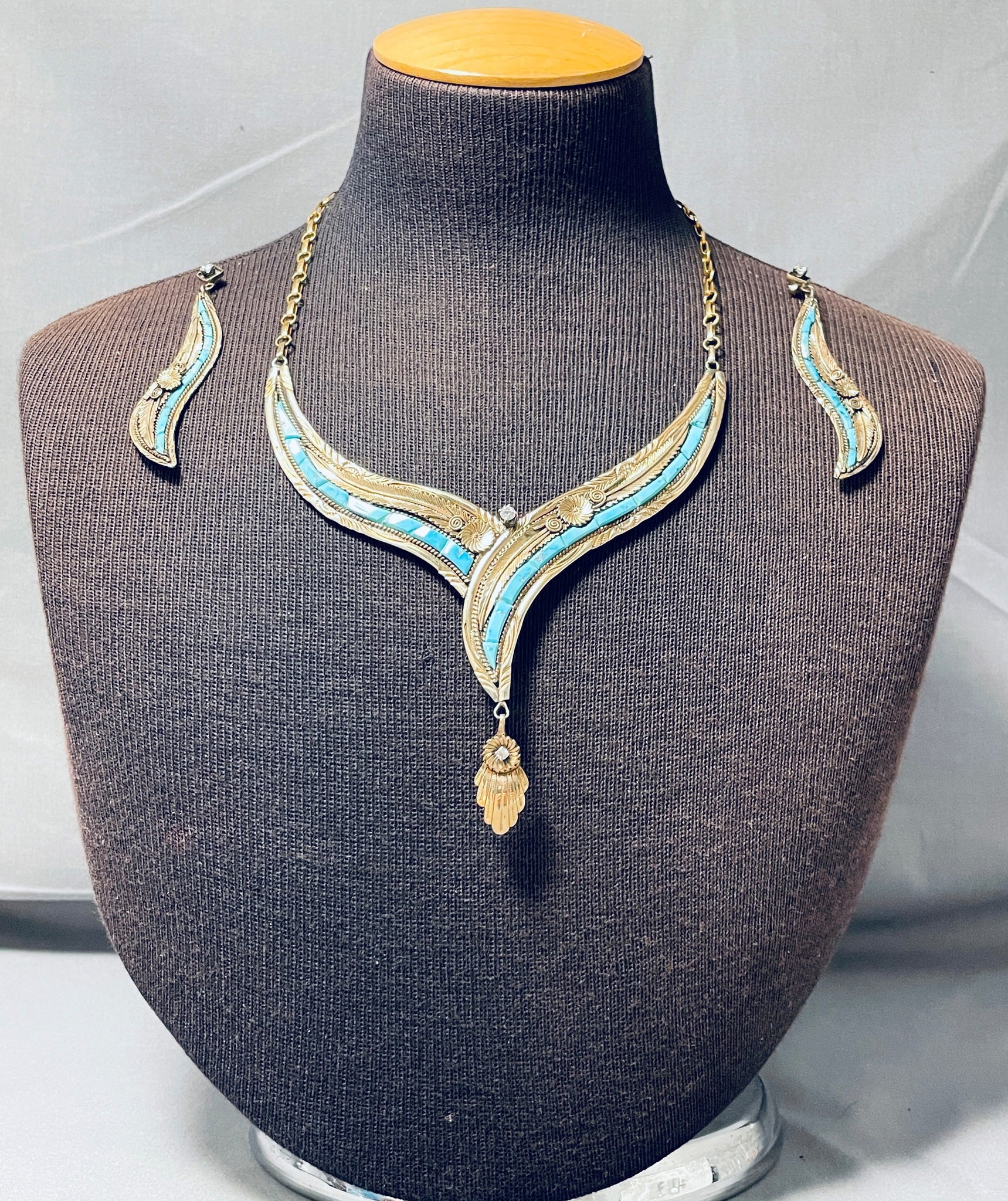 Marvelous Native American Navajo Turquoise Gold Filled Necklace And Earring Set