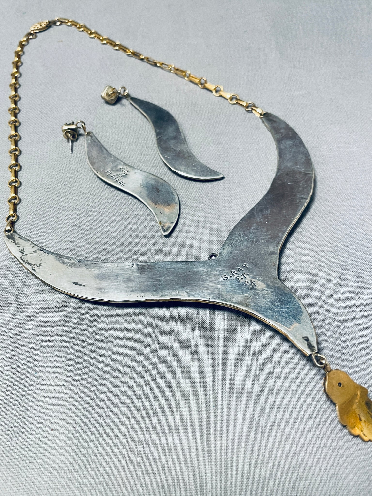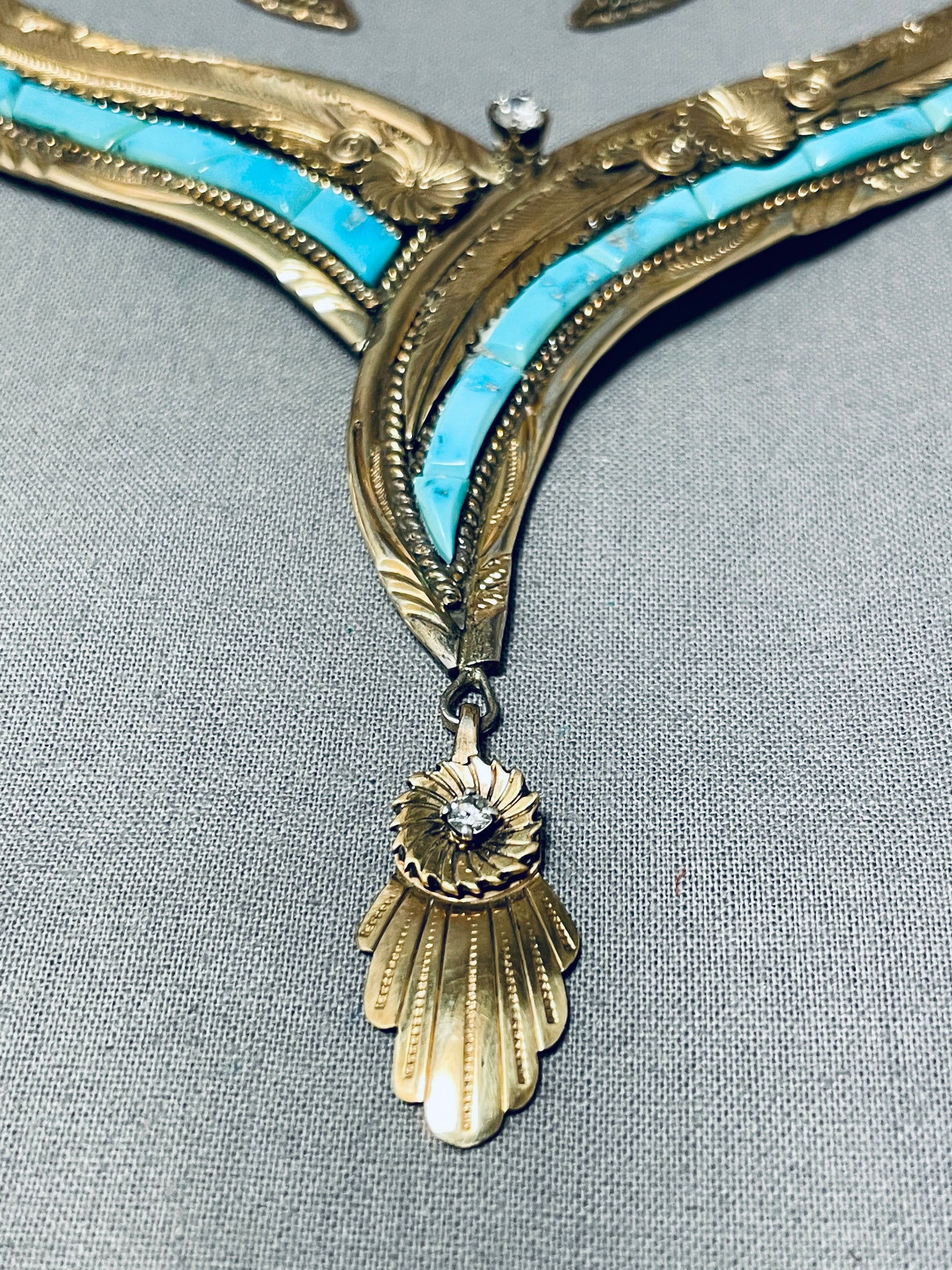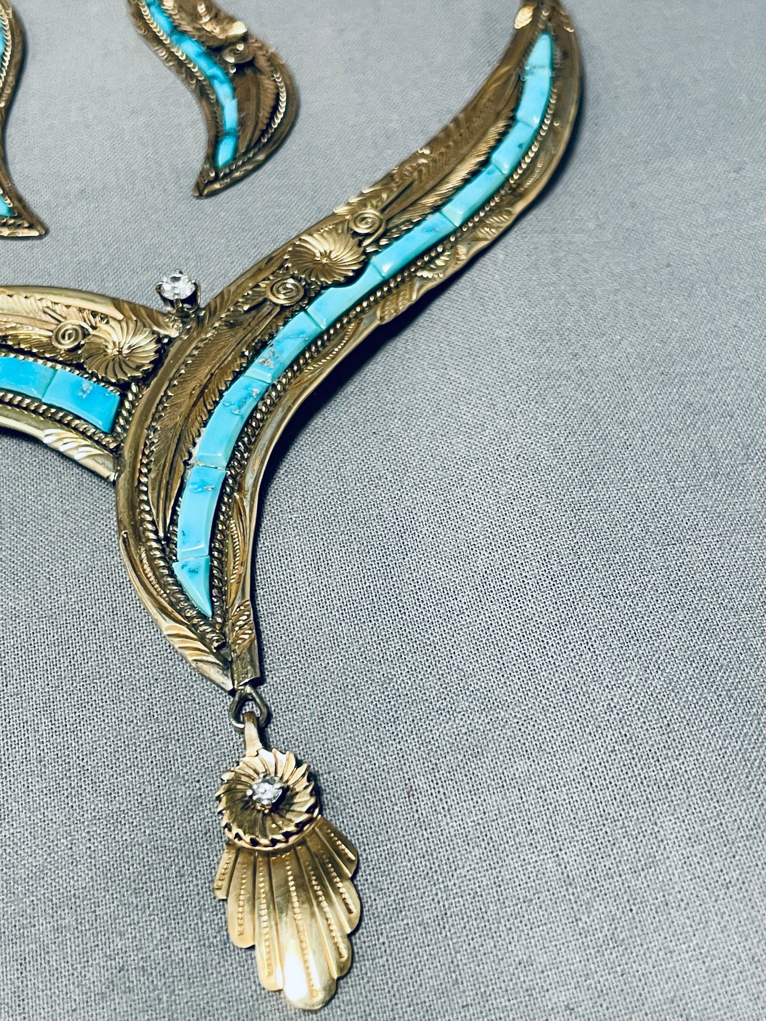 Marvelous Native American Navajo Turquoise Gold Filled Necklace And Earring Set