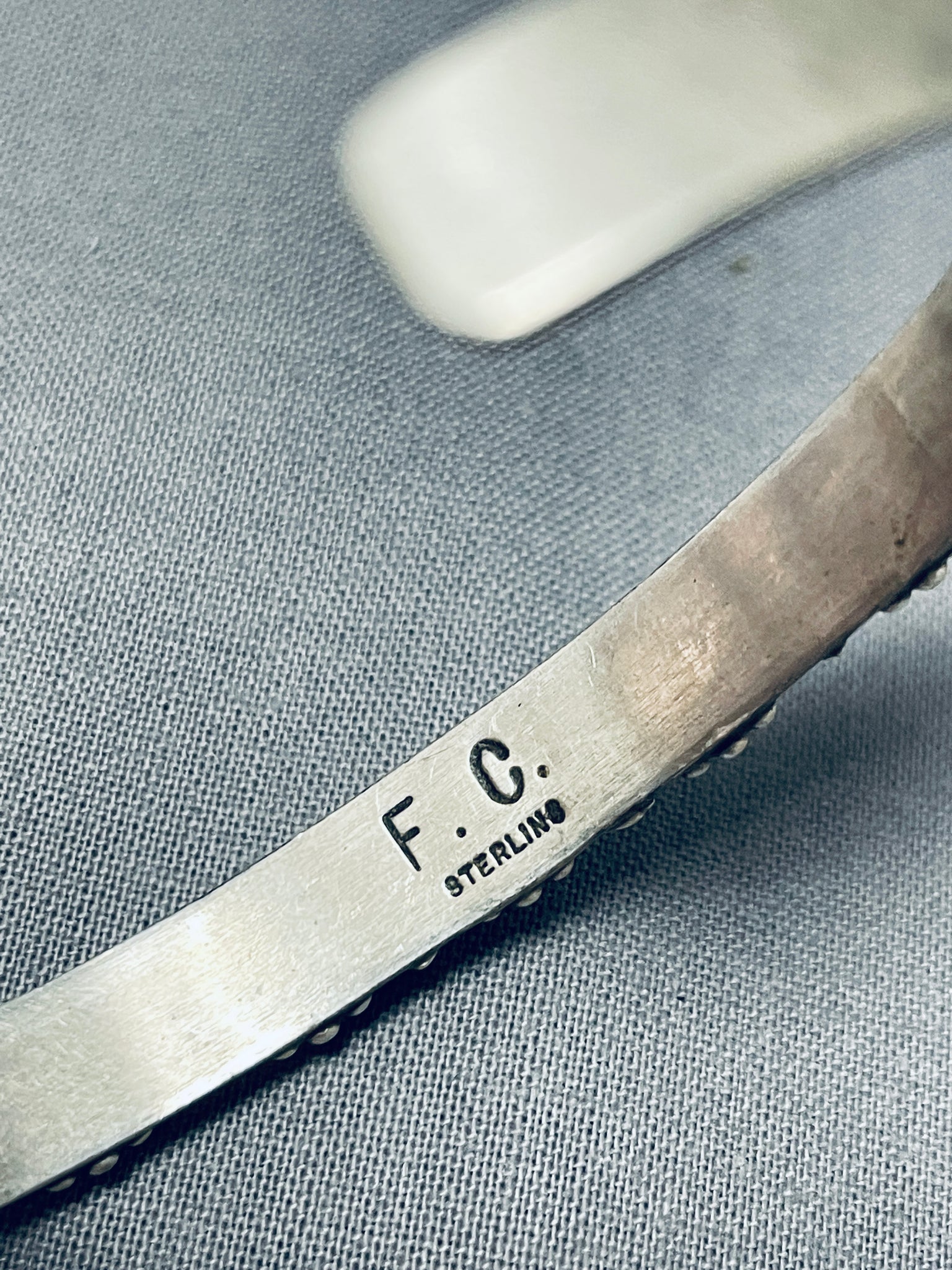 A superior vintage Laguna silver bracelet. Each of these 5 beautiful Blue Gem turquoise stones are surrounded with silver rope as they line up horizontally across the face of the bracelet! The stones measure around 1/4" x 1/8". The width of the bracelet measures around 1/4". Laguna artist Frank Carillo. Sterling silver, marked. The inside end to end measures around 5-7/8" with an additional 1" gap. Sturdy 24 grams.