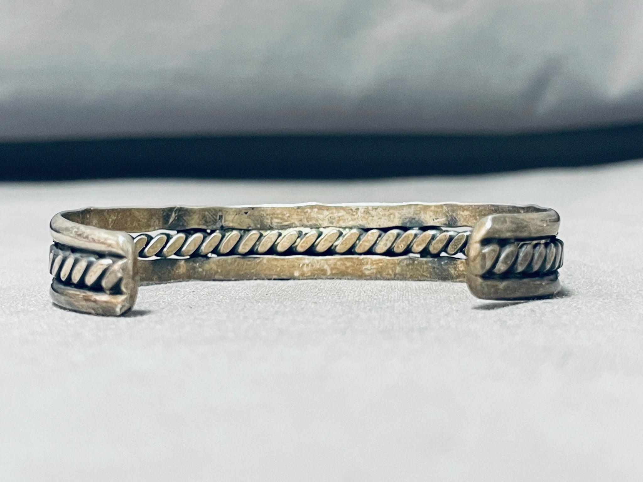 An amazing vintage Navajo silver bracelet. The special triple rails of this bracelet - of thick center twist and marvelous handstamped above and below - all serve as the perfect backdrop to host the three incredible Bisbee turquoise stones that line up across the face of the piece! Bisbee turquoise is known for its striking deep blue color, often with reddish-brown or chocolate-brown matrix patterns, which give it a unique and desirable appearance. The Bisbee mine produced a limited amount of turquoise, making it rare and highly sought after. The largest stone measures around 1/4" x 3/16". The width of the bracelet measures around 7/16". Sterling silver. The inside end to end measures around 5" with an additional 1-3/8" gap. Sturdy 22 grams. Cir Mid Century +