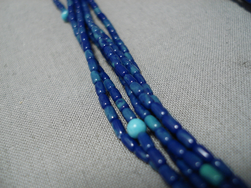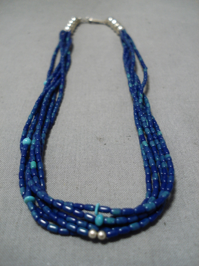 Up for sale is this marvelous vintage Navajo silver necklace. What a wonderful 6-strand choker style necklace we have here! Mega amounts of rich, deep lapis and turquoise beads are strung side by side until the strands join together with the ¼” silver beads to meet the silver clasp. Sterling silver. The length of the necklace measures around 15". Sturdy 10 grams.