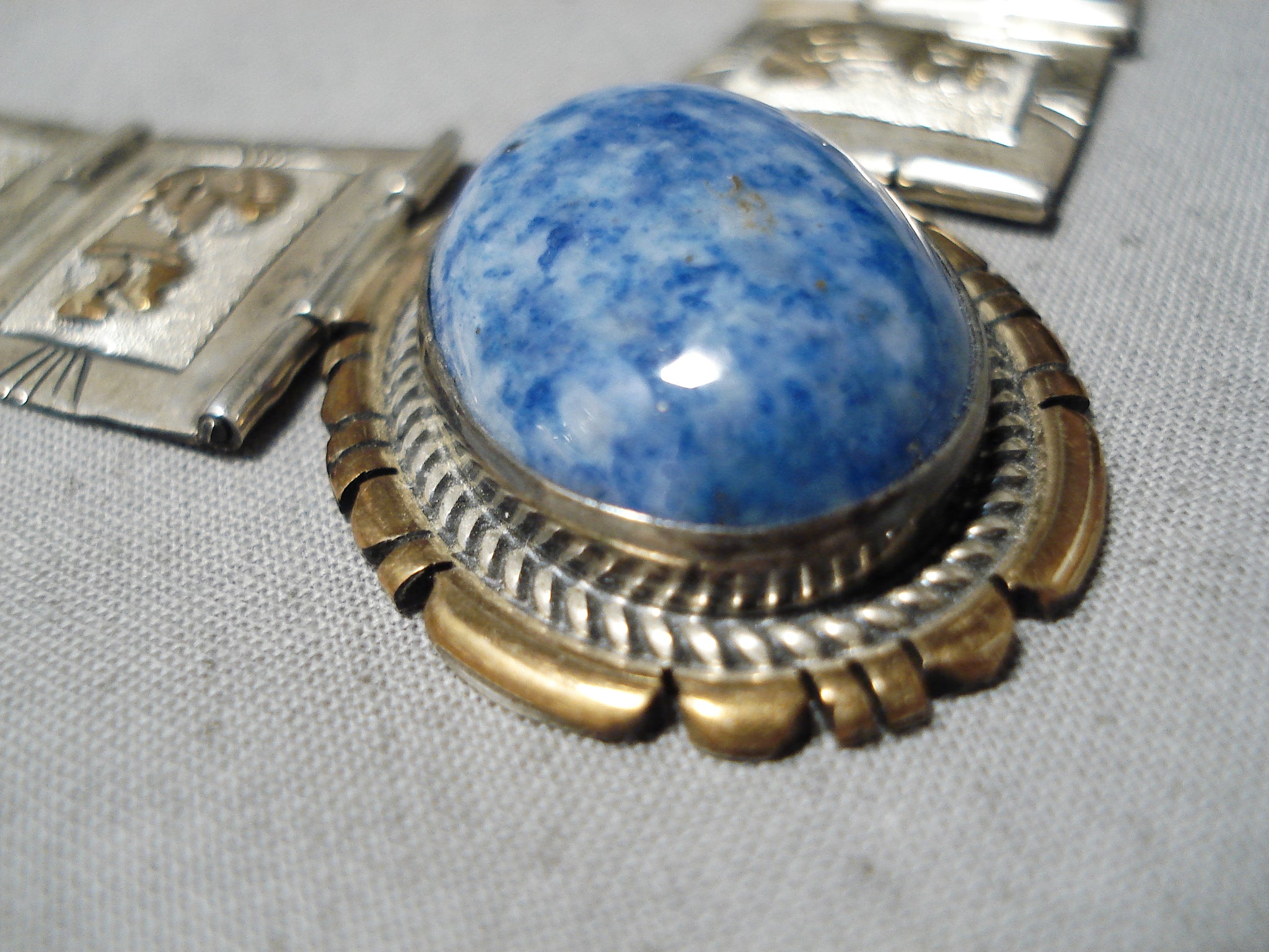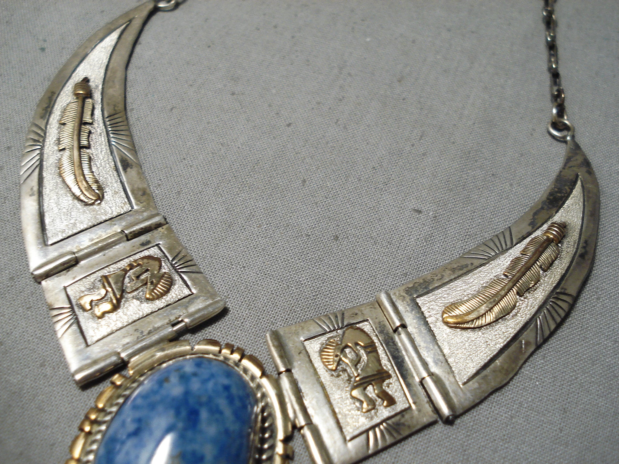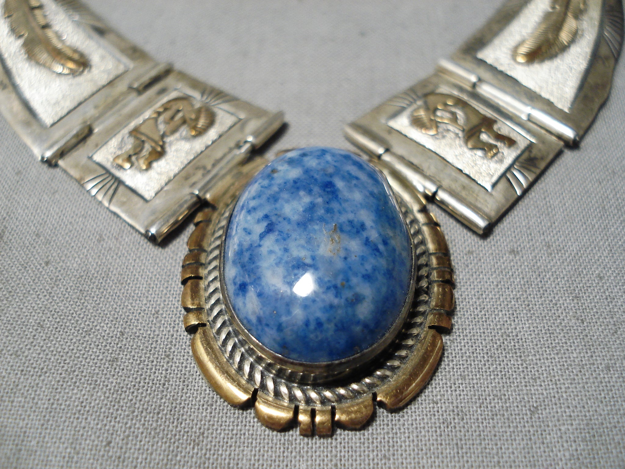 We are proud to offer this striking vintage Navajo necklace having a large denim lapis oval dome pendant surrounded with handcarved silver rope and a handcarved 12K gold border! The necklace has 4 handcarved silver hinged collar pendants with 12K gold designs, silver chain links and a handmade silver lobster clasp! Absolutely Amazing! 12K Gold and Sterling Silver, marked. Signed by Navajo artist, J. Russell. The length of the necklace measures around 16". Sturdy 40 grams.