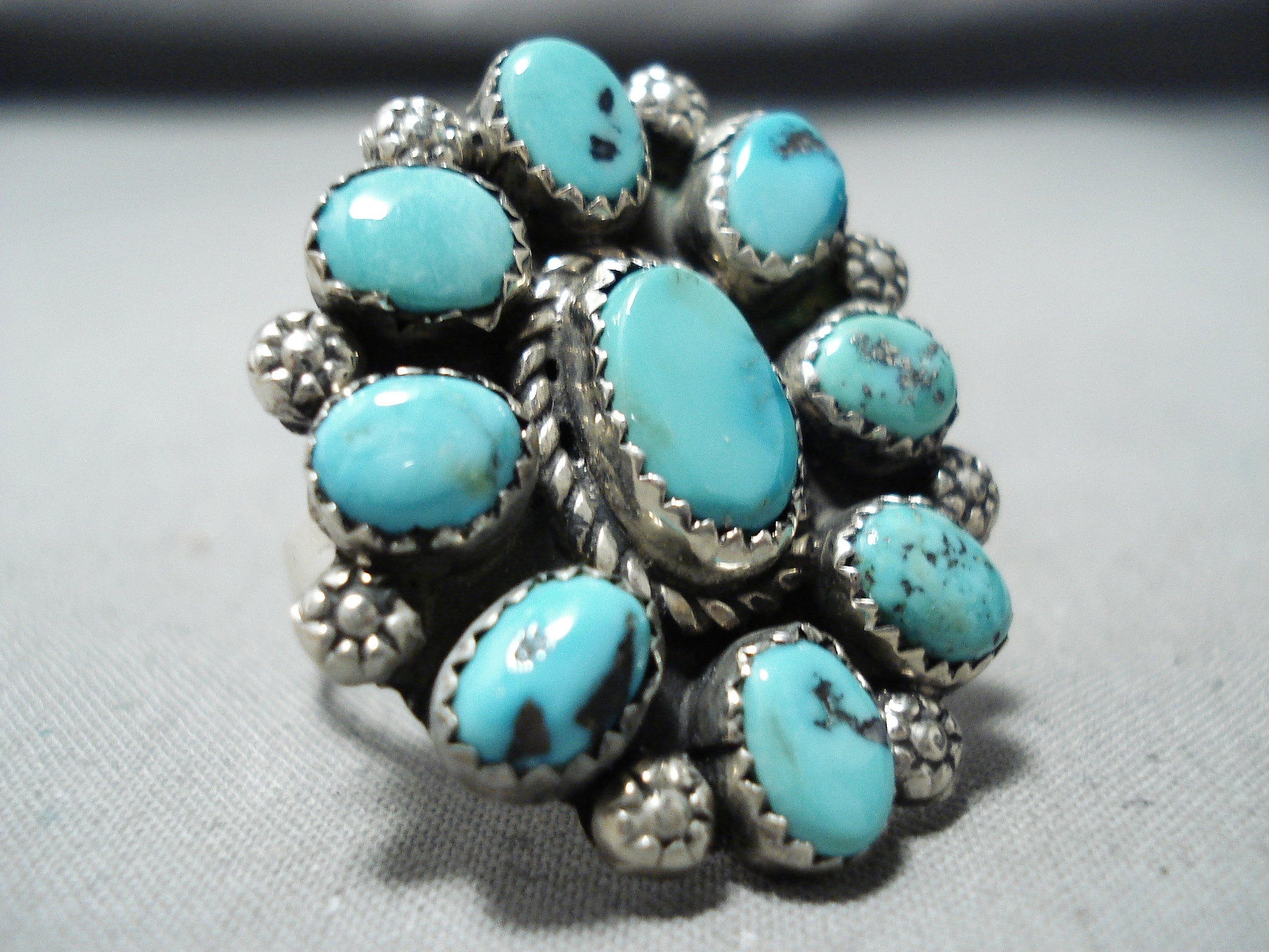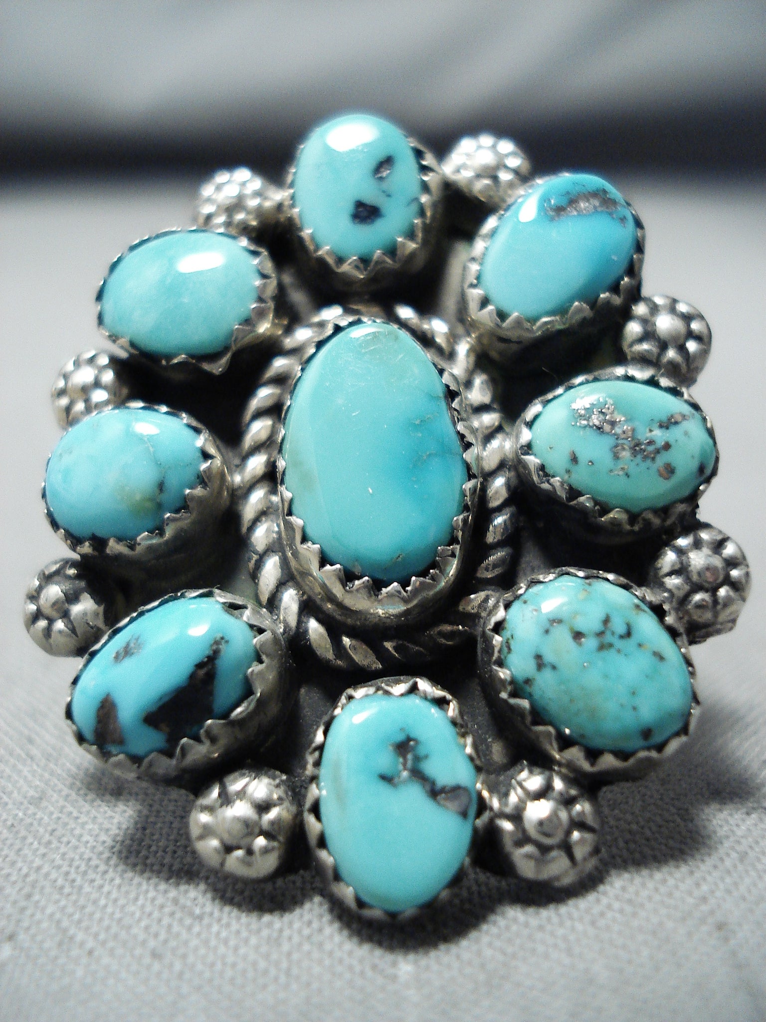 Marvelous Vintage Native American Navajo Old Kingman Turquoise Cluster Sterling Silver Ring