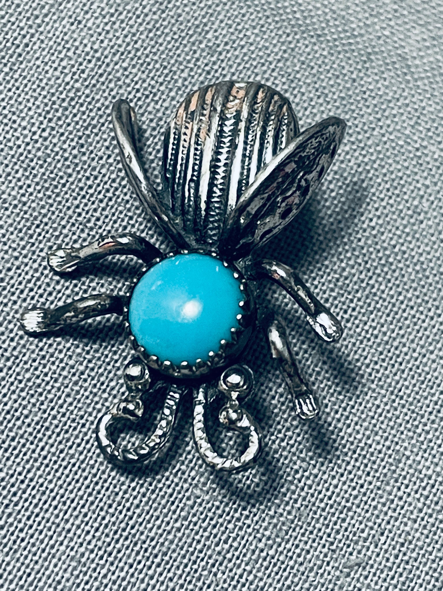 An amazing vintage Navajo silver pin. Well, isn't this the cutest little dimensional creepy-crawly beetle you've ever seen?! He has a head of the most beautiful turquoise round! The center stone measures around 1/4" x 1/4". Sterling silver, marked. The pin measures around 7/8" x 3/4". Sturdy 4 grams. Cir Mid Century.