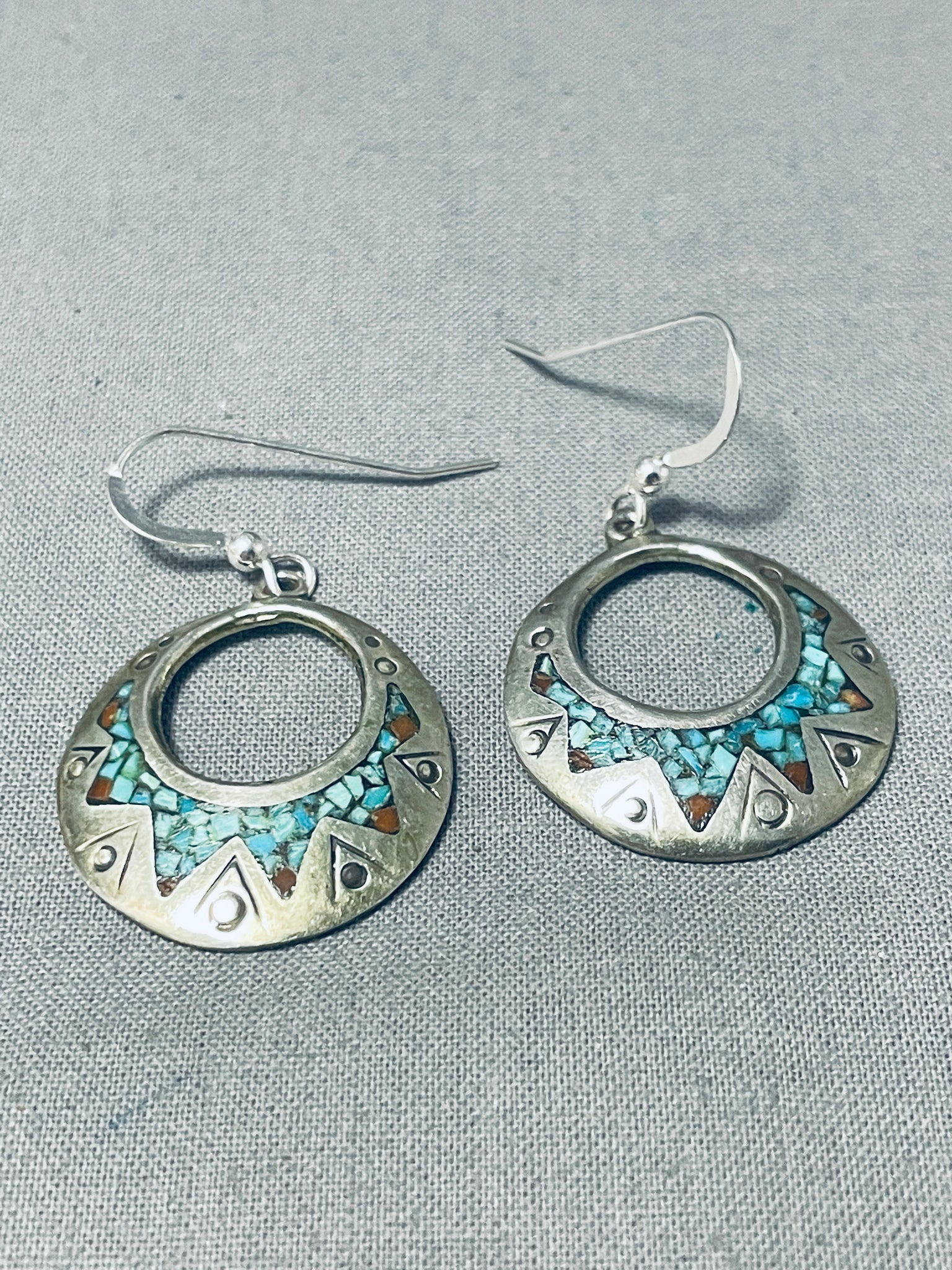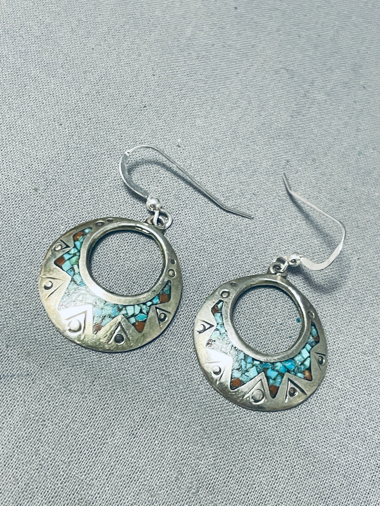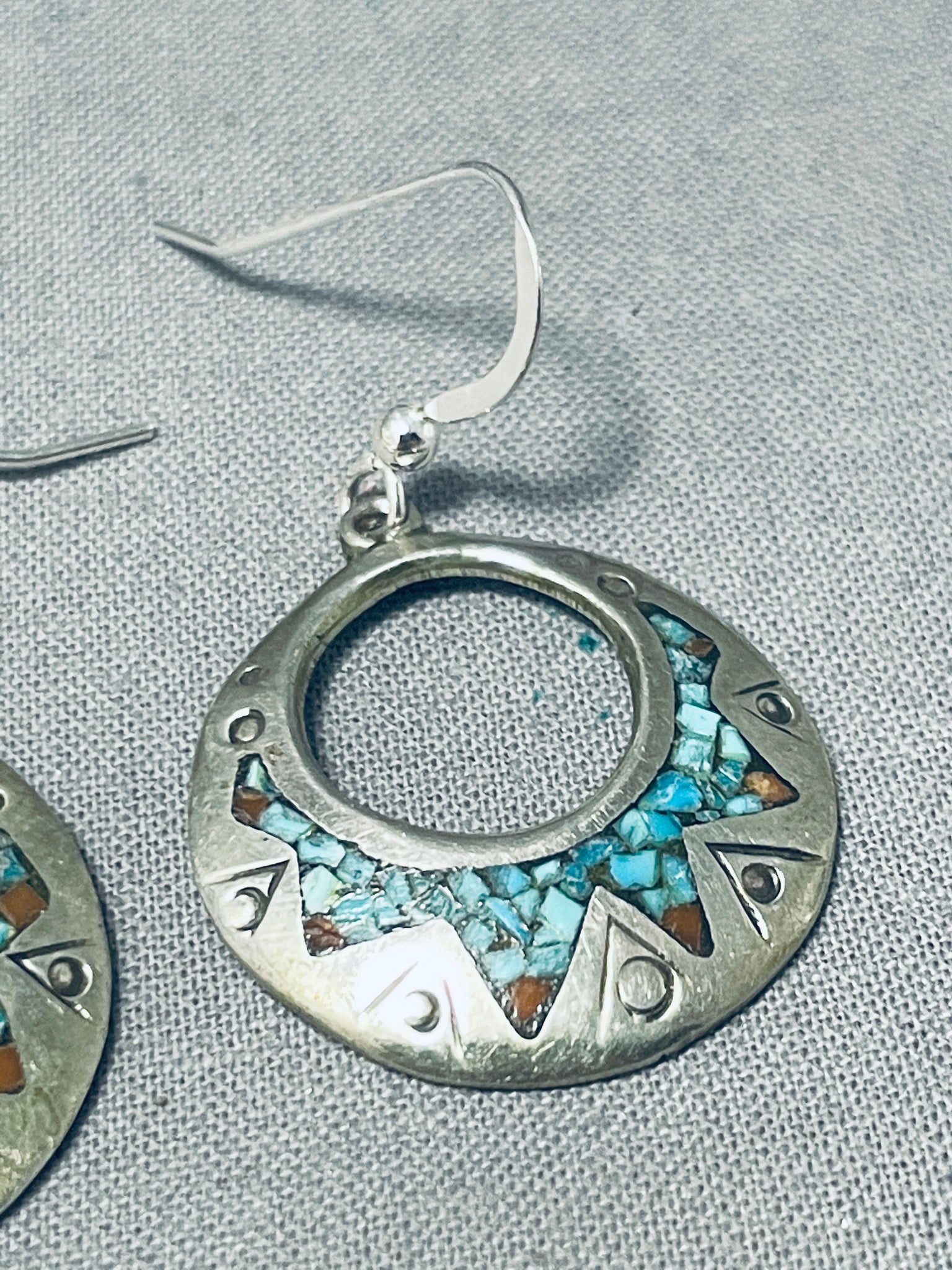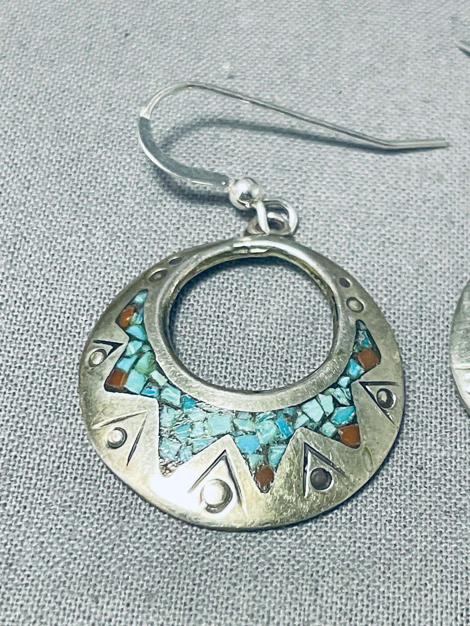 This is a fabulous vintage Navajo silver pair of earrings. Arrowhead designs of chip inlay turquoise and coral decorate the bases of these round pierced wire dangle earrings with the incredible open cut design! Sterling silver. Each earring measures 1-1/2" long and 7/8" wide. Cir. 1970's+. The earrings weigh around 4 grams.