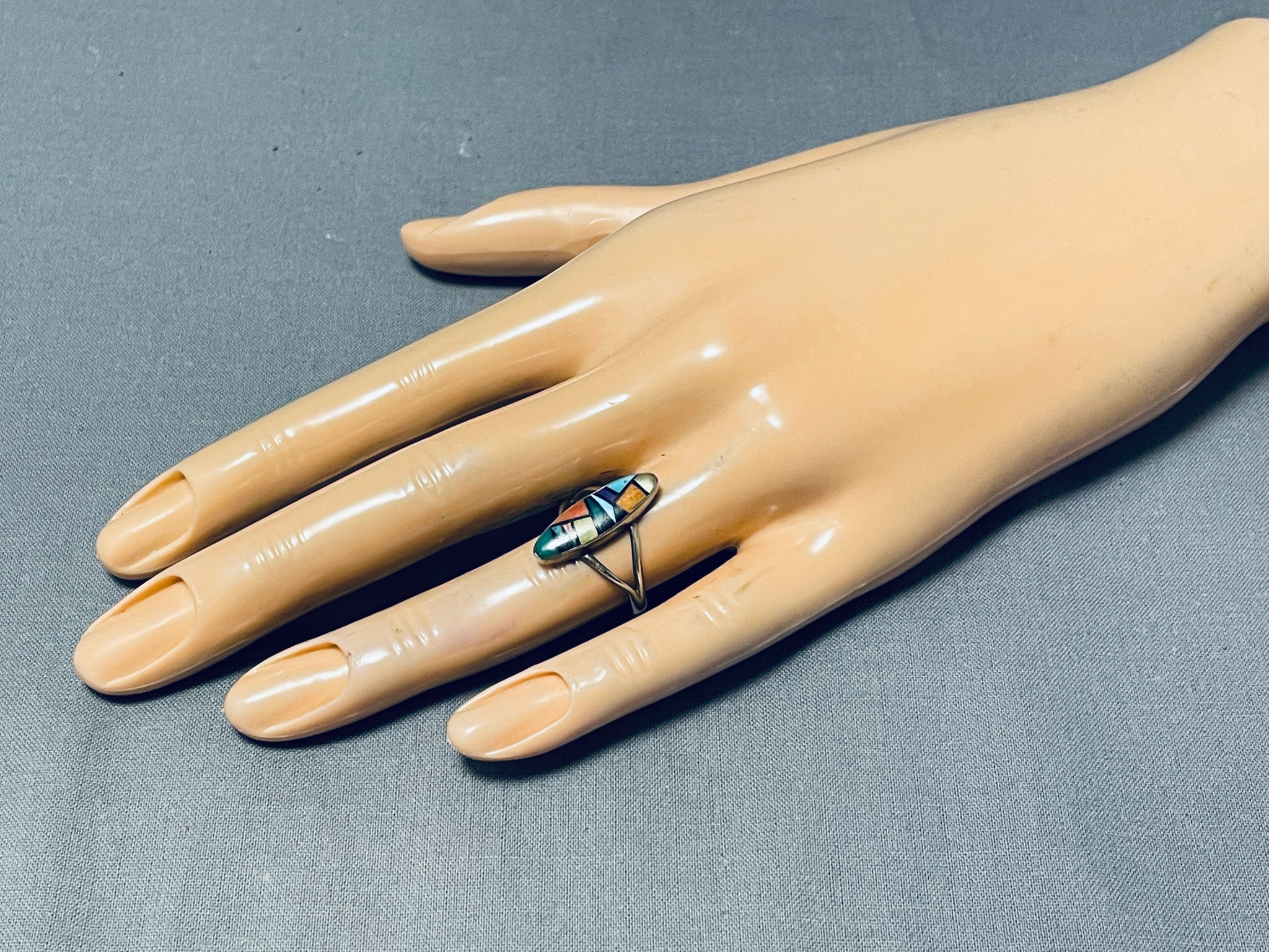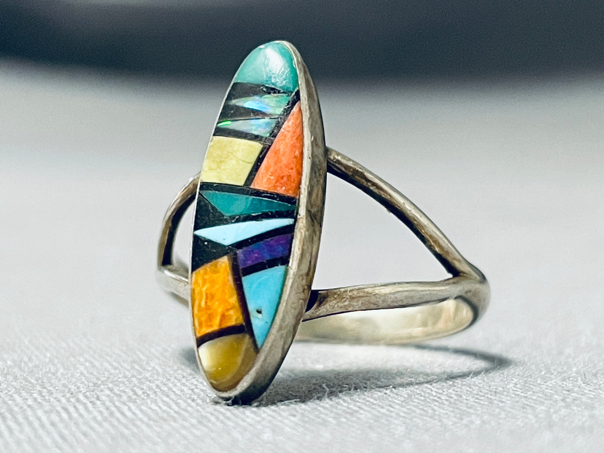 This is a wonderful vintage Navajo silver ring. The torpedo shape of this dual rail ring is a spell-binding inlay arrangement of many colorful stones that include turquoise, lapis and spiny oyster! The ring face measures around 3/4" x 3/4". The ring size is around 7. Sterling silver, marked. Sturdy 2 grams. Cir Mid Century