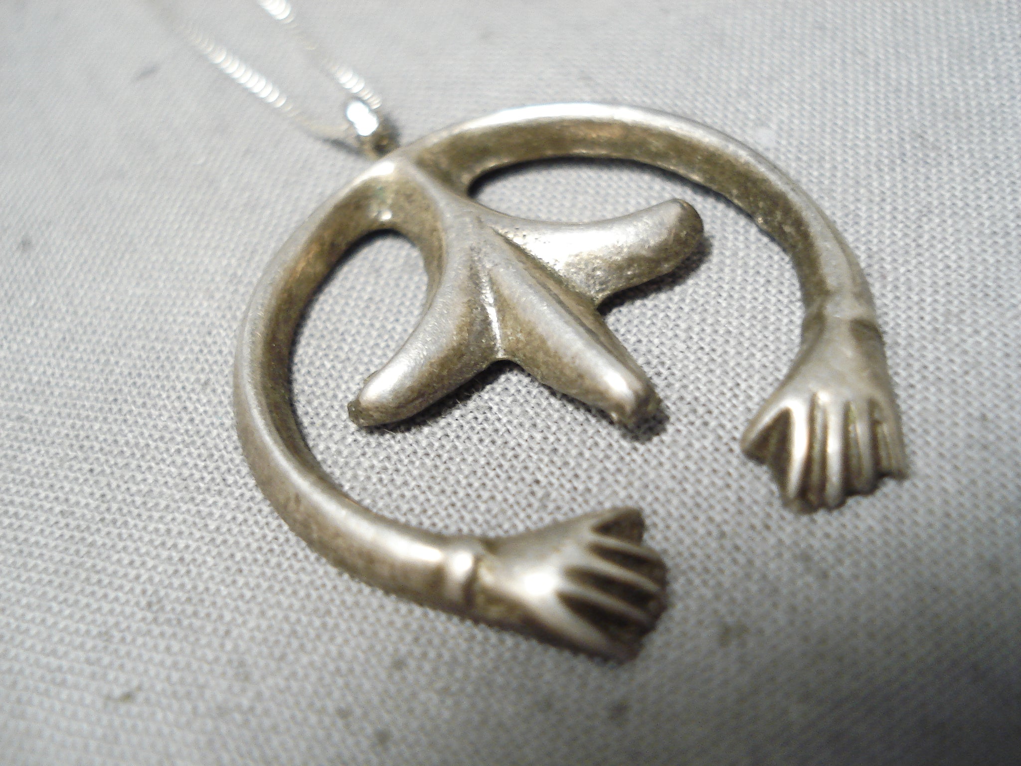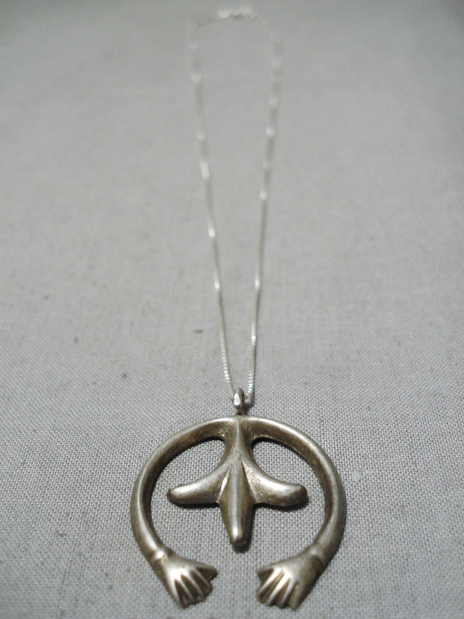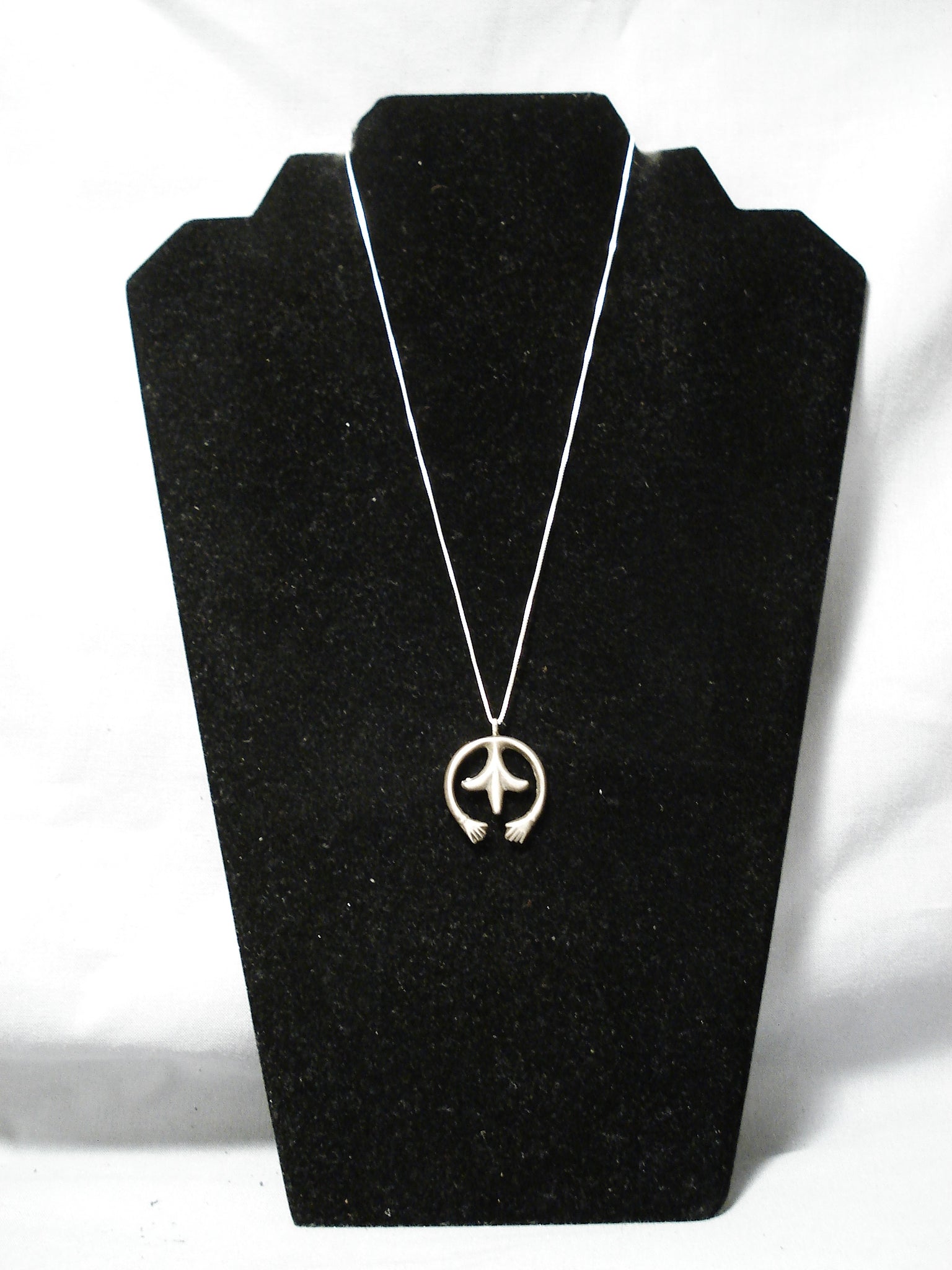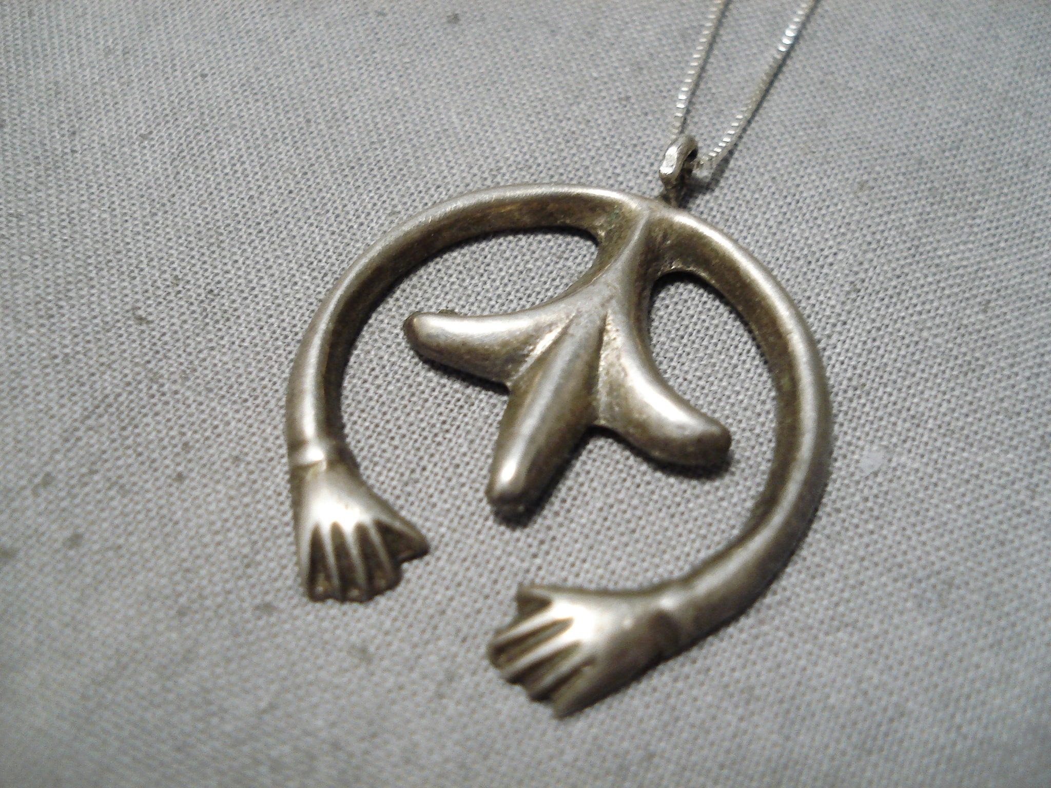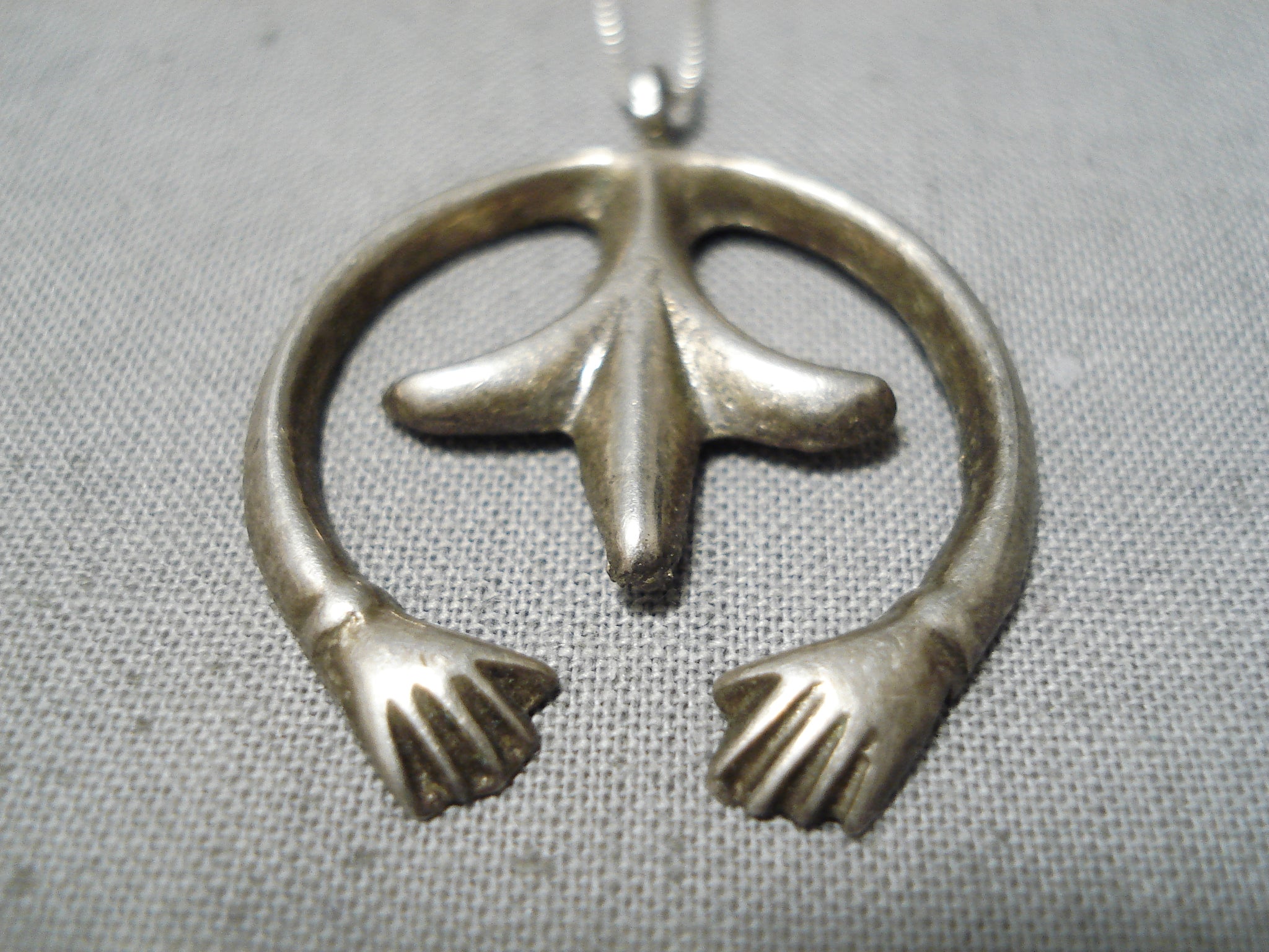 Here we have an incredible vintage Navajo silver necklace having a handcarved naja pendant with a thin silver chain and a handmade silver lobster clasp! Very Unique! Naja measures about 1" x 1". Sterling silver. The length of the necklace measures around 17". Sturdy 6 grams. Cir. EARLY TO Mid Century.