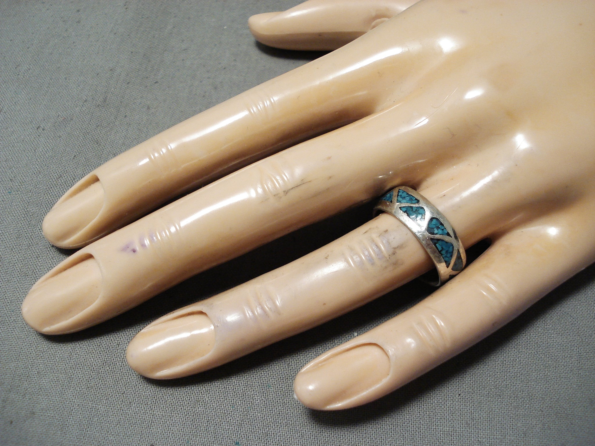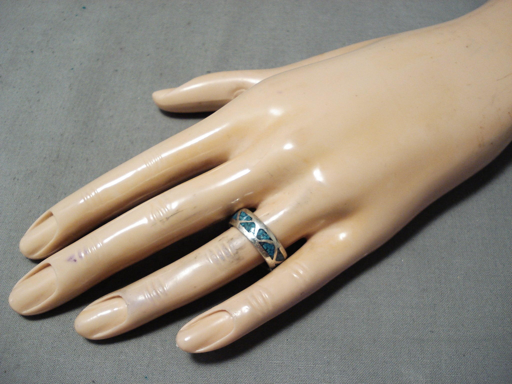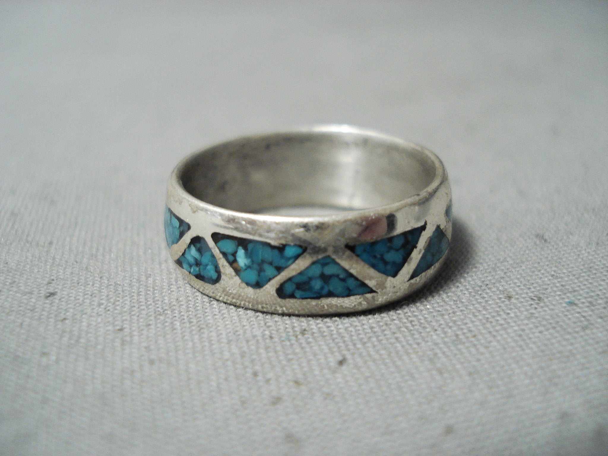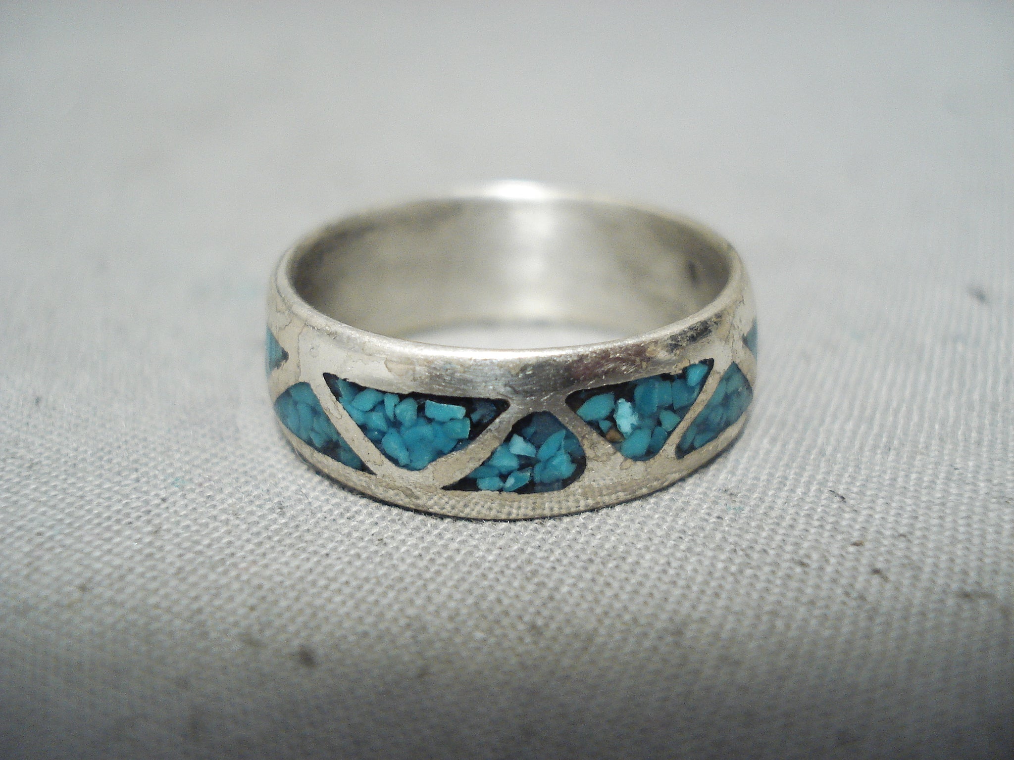 Here we have an amazing Navajo silver ring. Triangular shape chip inlay turquoise follow all around this attractive eternity style band ring! The ring face measures around 1/4" x 3/4". The ring size is around 8. Cir Mid Century. Sterling silver. Sturdy 4 grams.