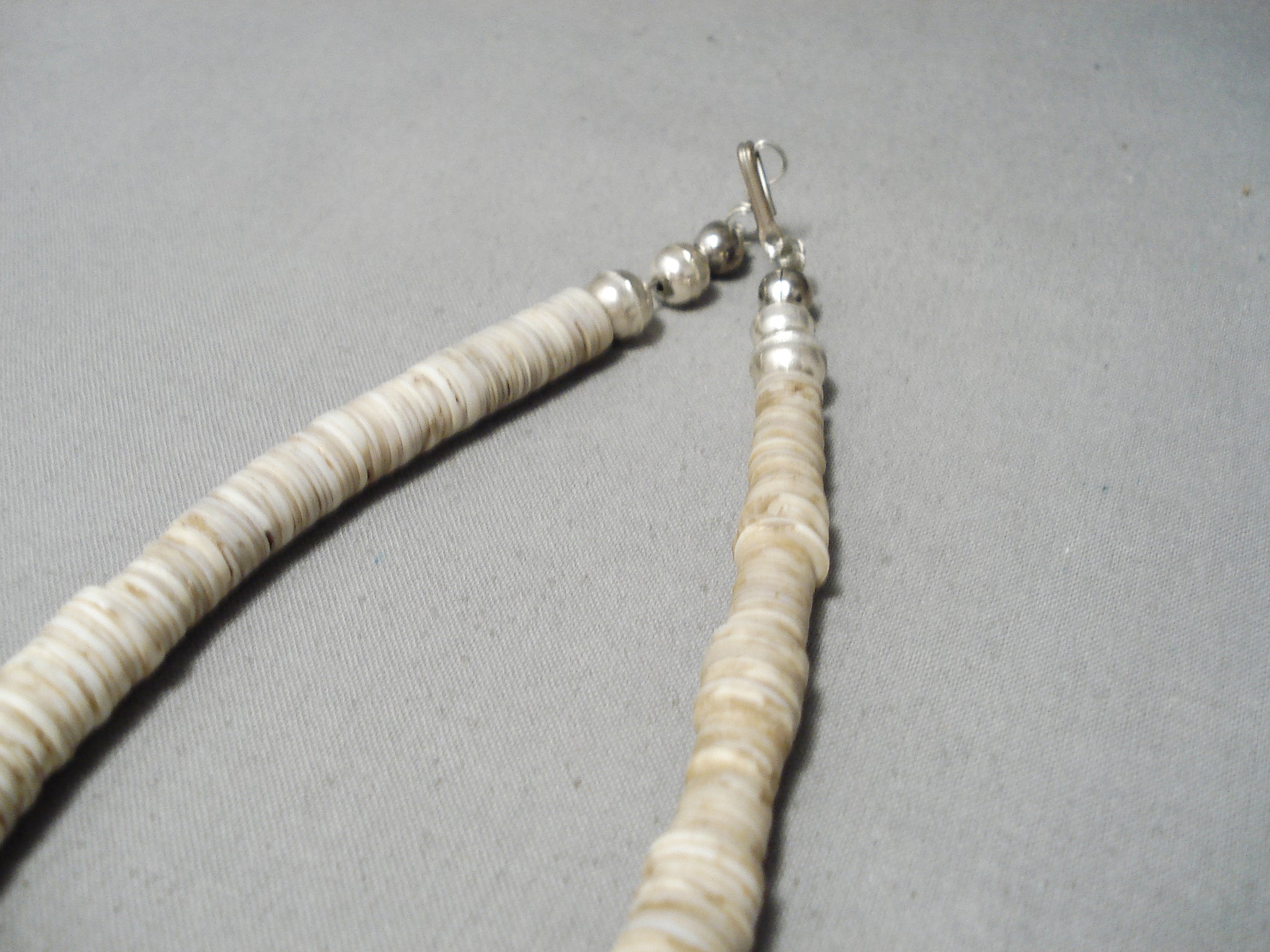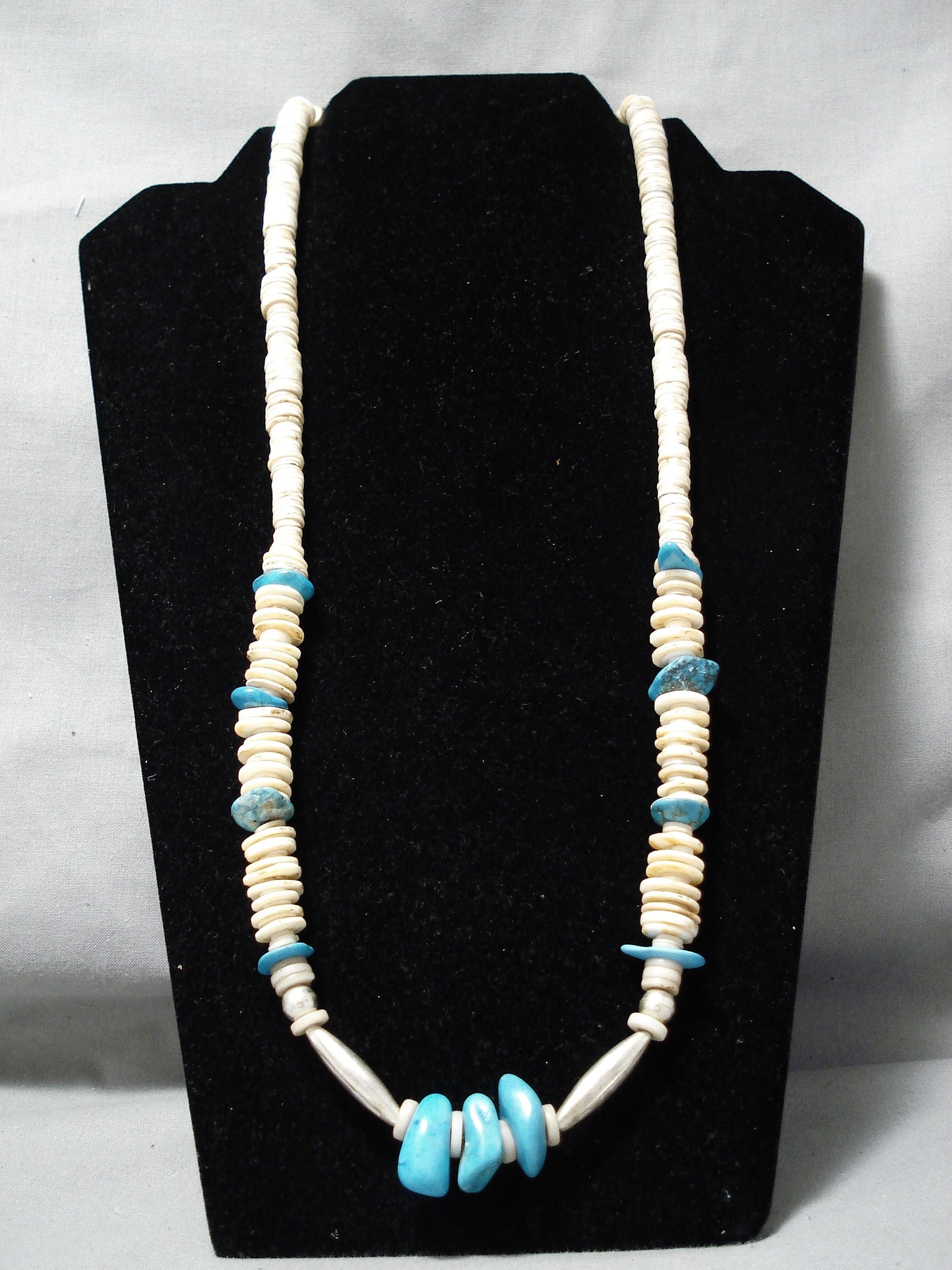 A marvelous vintage Santo Domingo necklace. This is a wonderful lengthy necklace of tan shell discs – with beautiful turquoise stones placed intermittently at just the right places! The largest of stones is about ¾” x 5/8”. The length of the necklace measures around 31". Sturdy 98 grams.