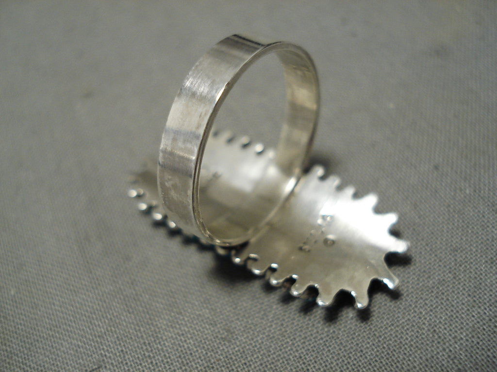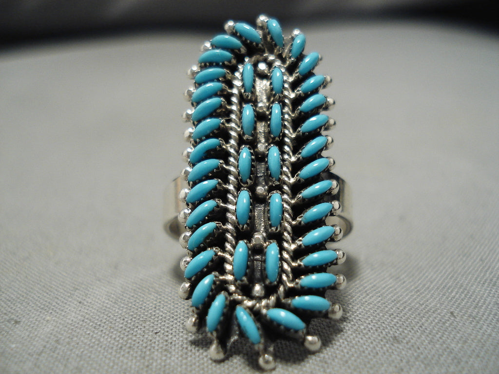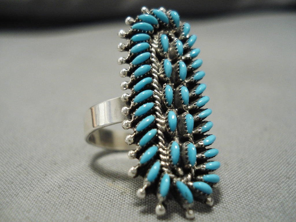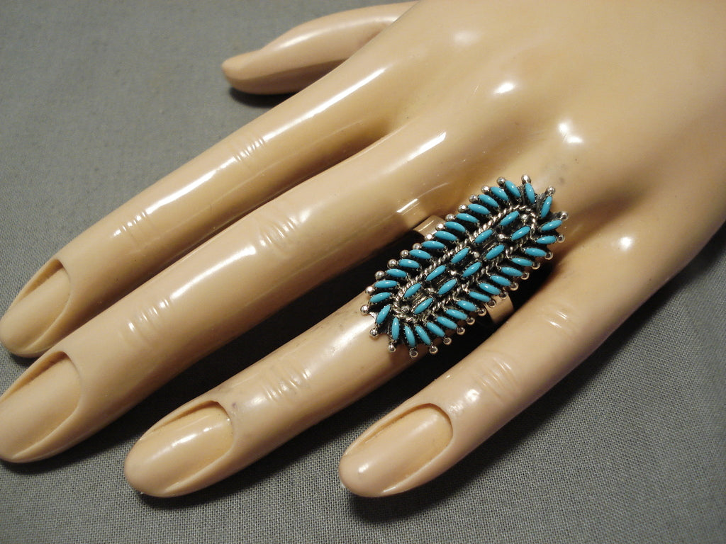 Up for sale is this marvelous vintage Zuni silver ring having diagonal turquoise petit point accented with a silver bead border and a handcarved silver rope around the center turquoise petit point stones! Simply Stunning Piece! The ring face measures around 1-5/8" x 5/8". Signed by Zuni artist, Octavius Seowtewa. The ring size is around 9. Sterling silver, marked. Sturdy 6 grams.