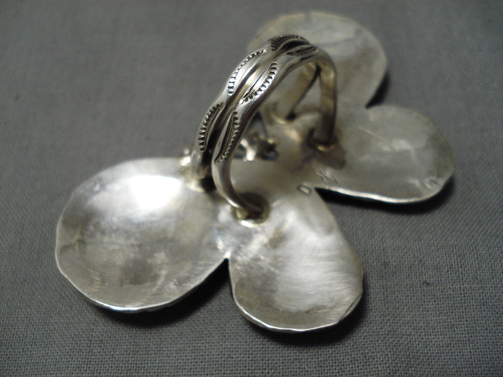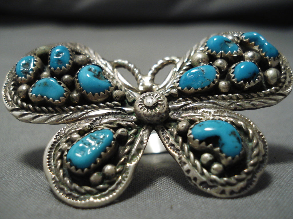 Up for sale is this marvelous Zuni handcarved silver butterfly ring having deepset turquoise stones, handcarved silver beads, handcarved silver rope borders and antennae! The ring has a handcarved double silver band with silver handstampings! Truly Unique Piece! The largest stone measures around 3/8" x 1/4". The ring face measures around 2-1/2" x 1-5/8". Signed by Navajo artist, D.. The ring size is around 9. Sterling silver, marked. Sturdy 21 grams.