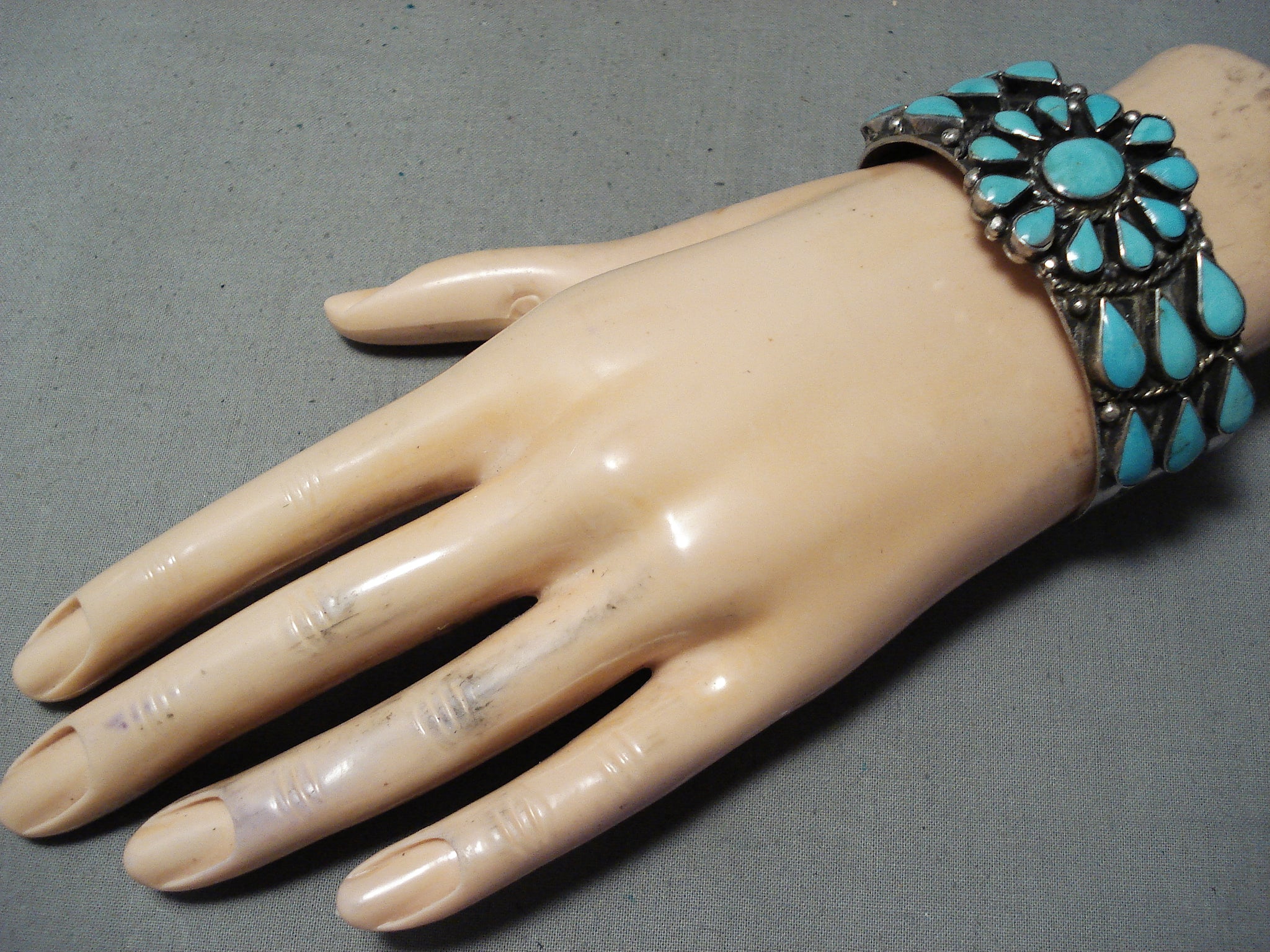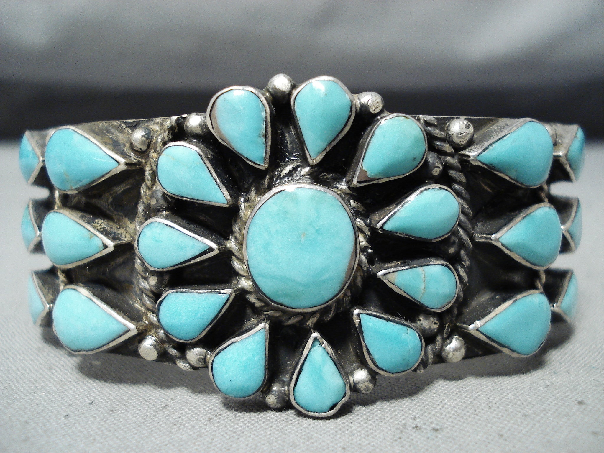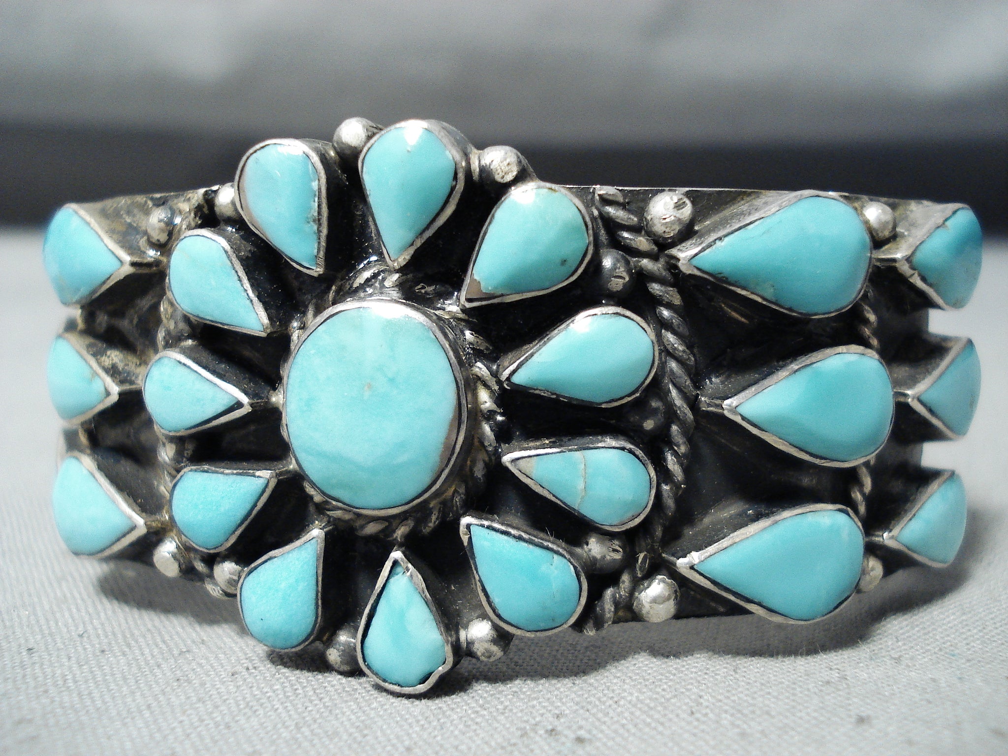 We are proud to offer this superlative vintage Navajo silver bracelet. Striking turquoise teardrops are dramatically arranged around the round turquoise stone in the very center to create this fascinating bracelet! The center stone measures around 3/8" x 3/8". The width of the bracelet measures around 1-1/4". Signed by Navajo artist, M. Cayaditto. Sterling silver, marked. The inside end to end measures around 5-5/8" with an additional 1-3/8" gap. Sturdy 64 grams.