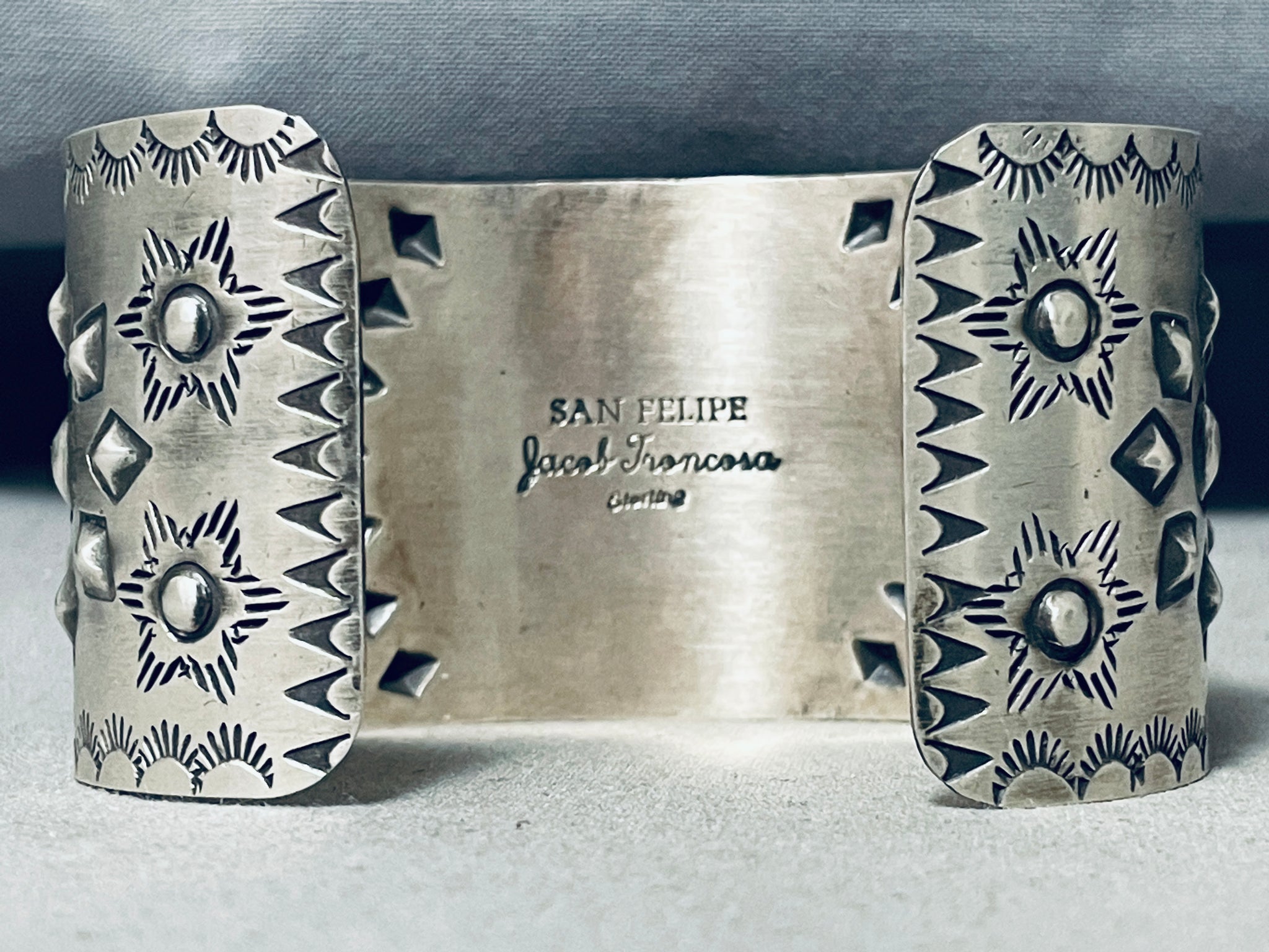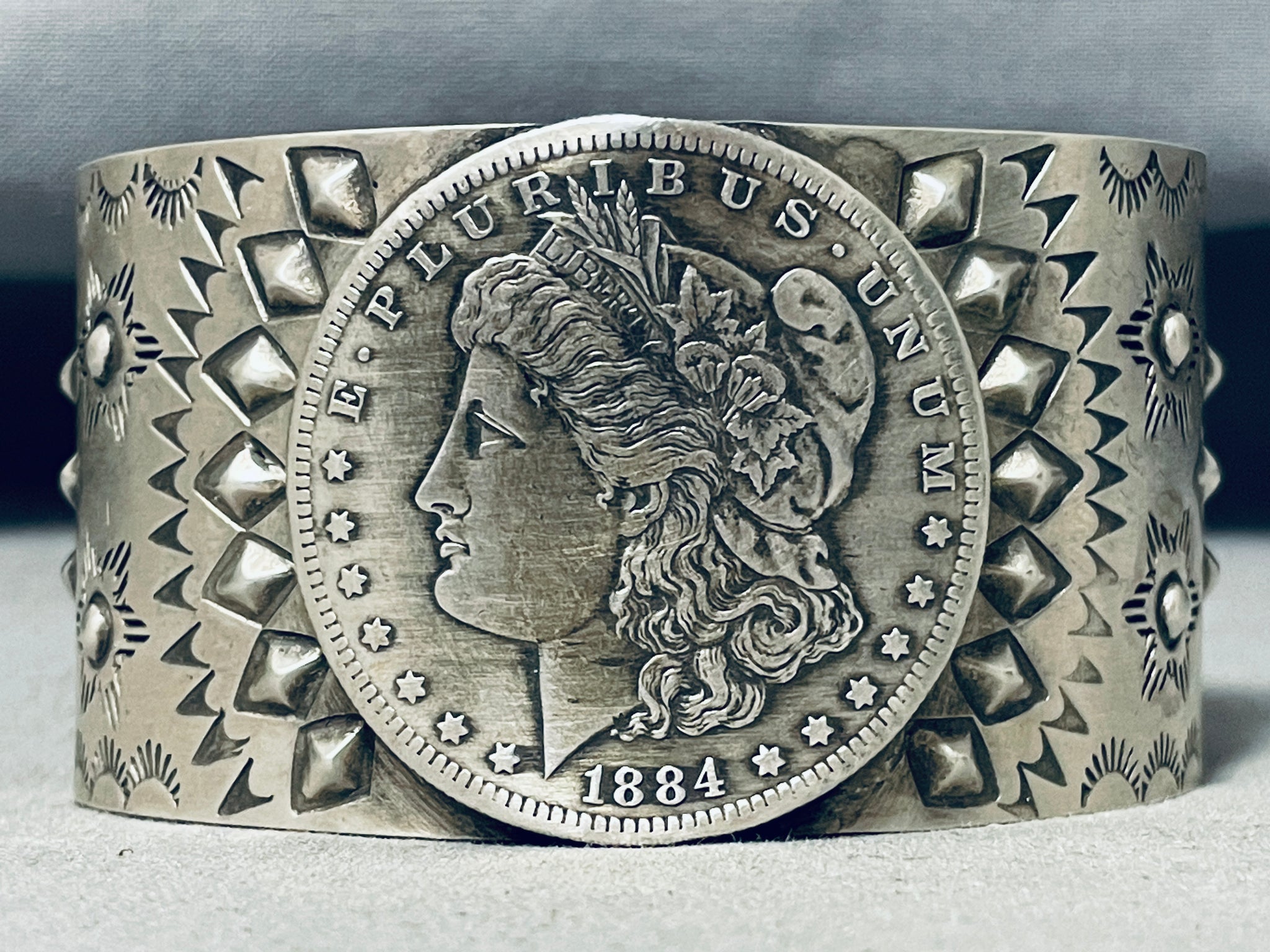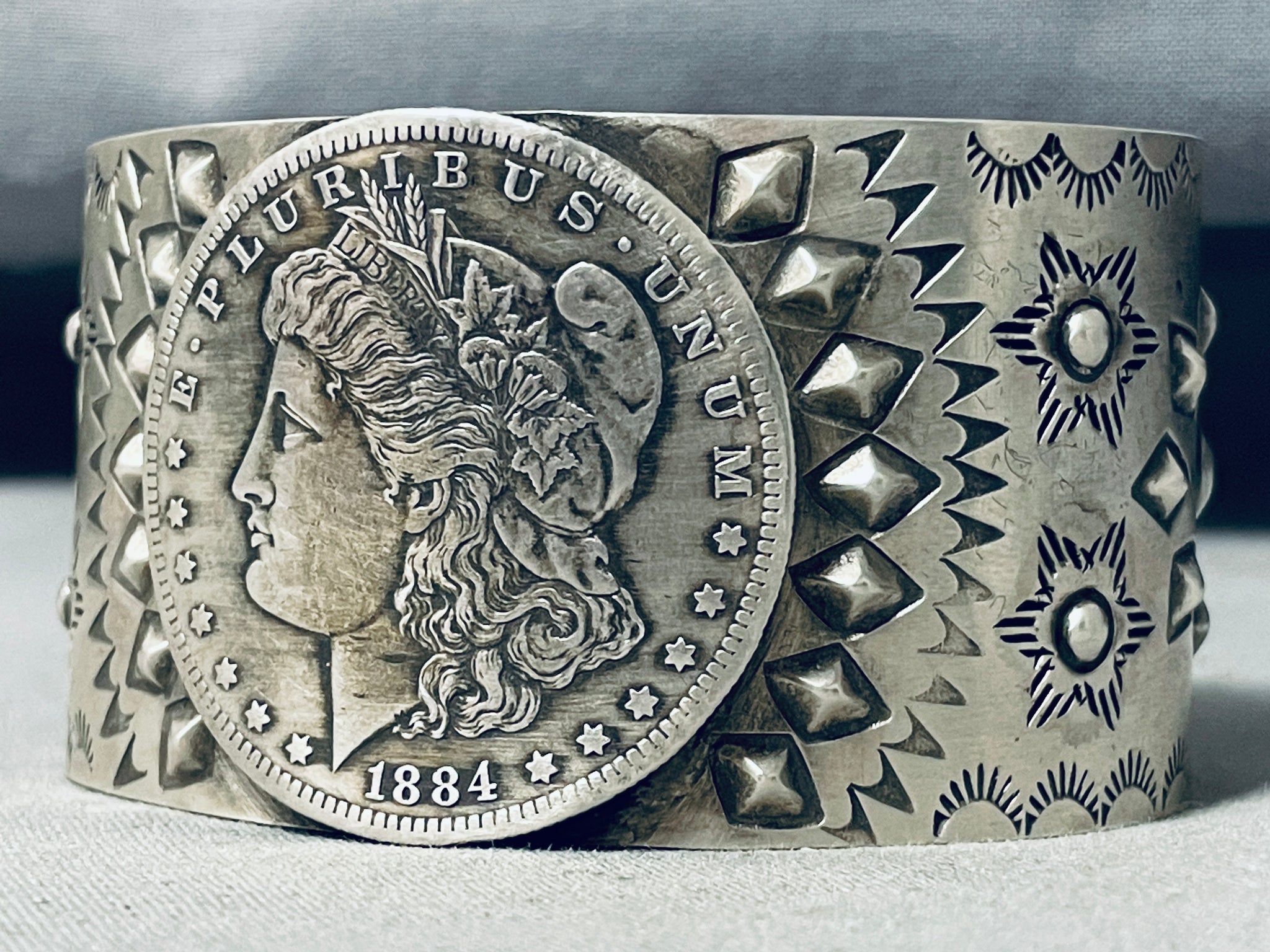This is an astounding San Felipe bracelet featuring a 1884 silver dollar, handcarved and handstamped silver flowers and silver diamonds, all on a solid silver cuff! So Spectacular! The width of the bracelet measures around 1-1/2". Signed by San Felipe artist, Jake Francosa. Sterling silver, marked. The inside end to end measures around 6" with an additional 1-1/8" gap. Sturdy 75 grams.