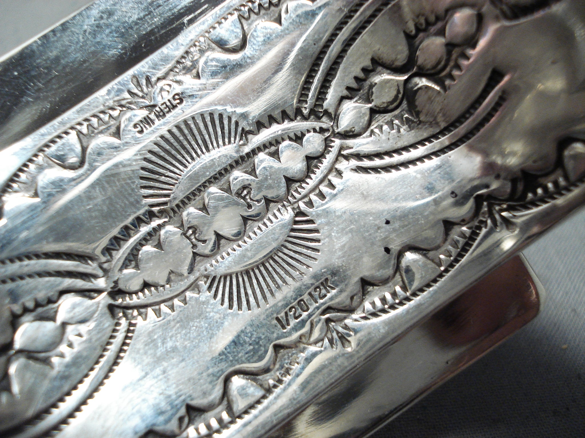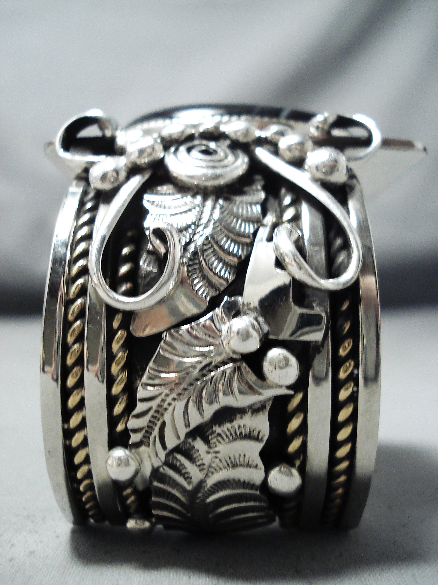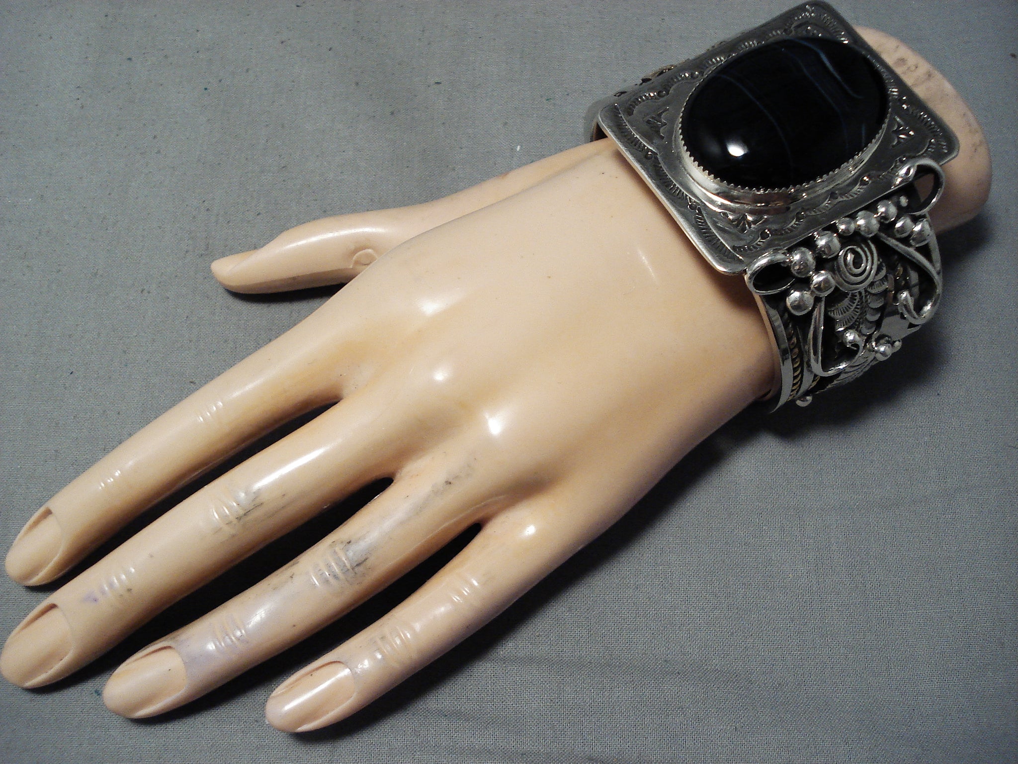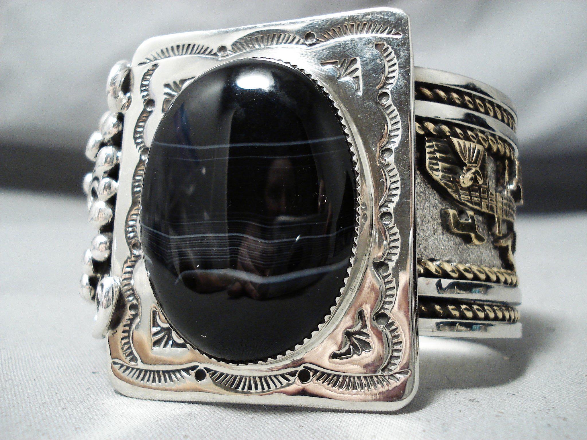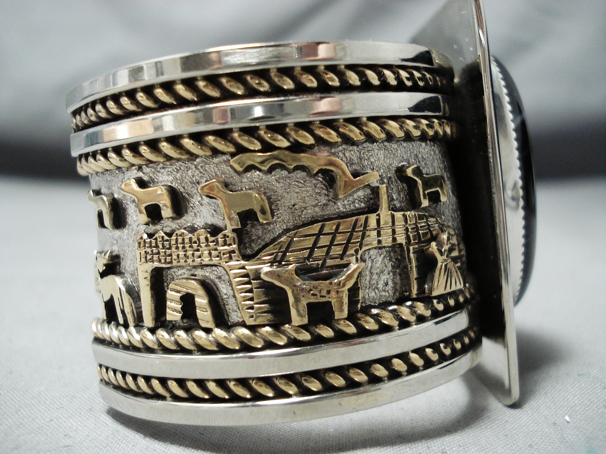 Massive Signed Native American Navajo Native Black Agate Sterling Silver 12k Gold Bracelet