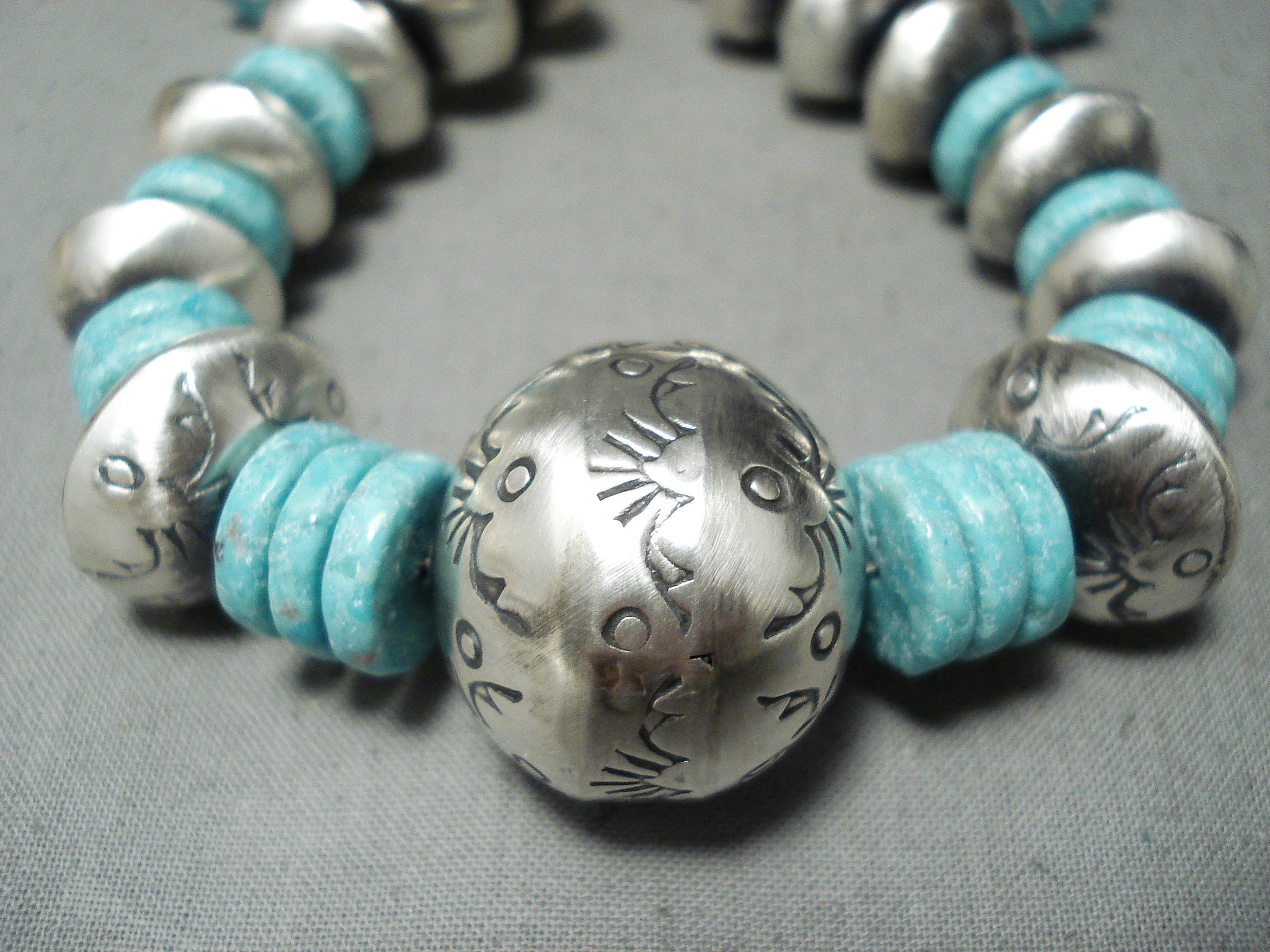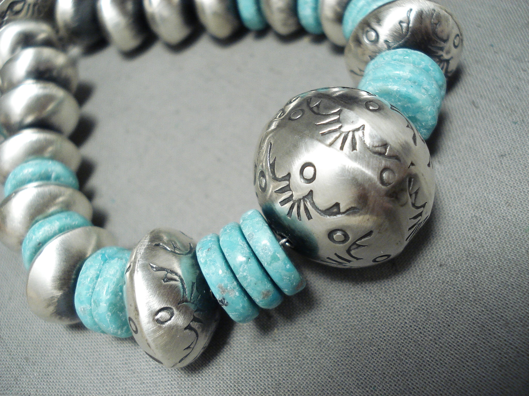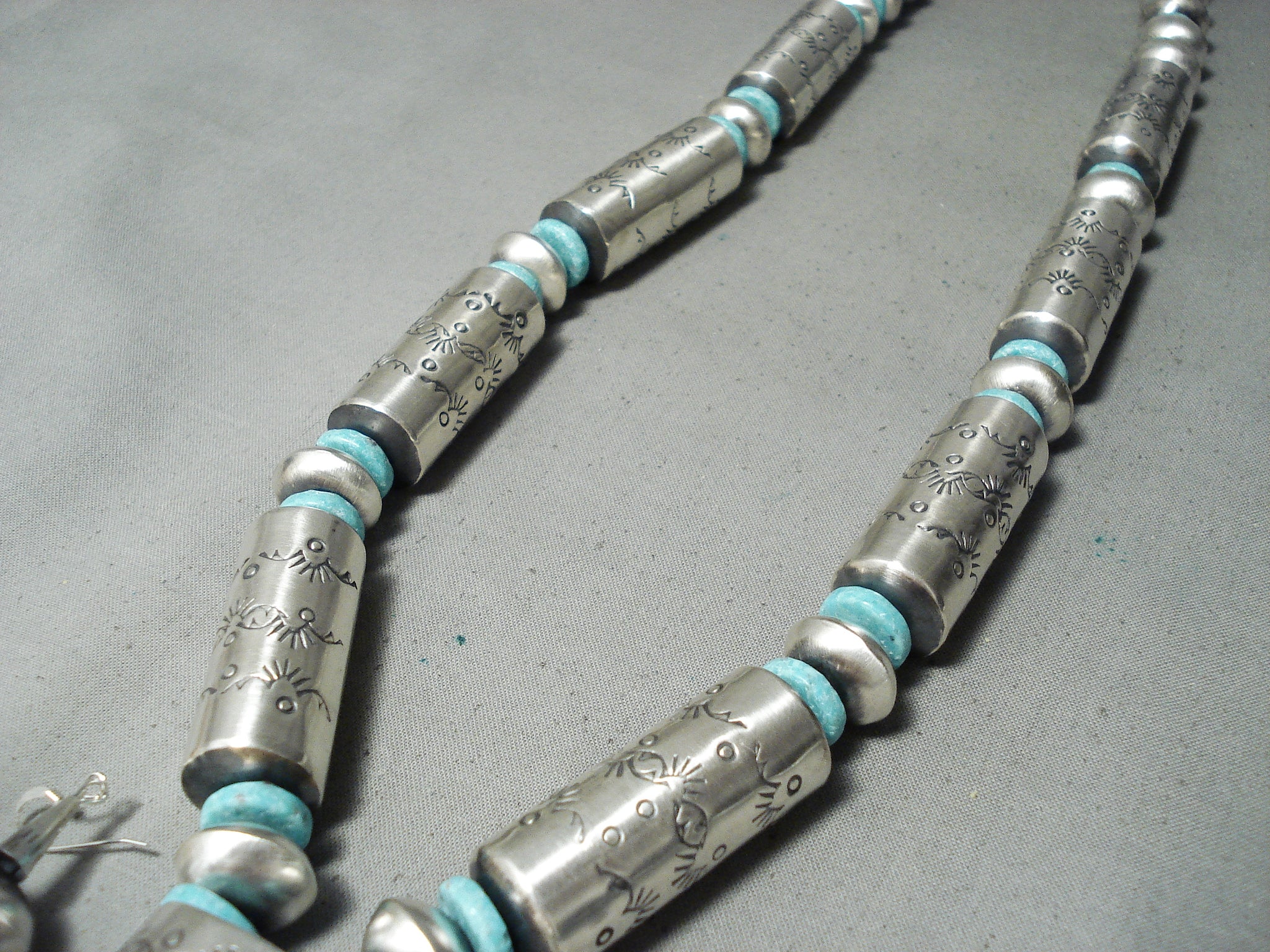 This is an astonishing vintage Navajo very large tubule silver bead and turquoise necklace and earring set. This remarkable necklace is one of the largest silver tubule bead necklaces we have collected all year. The necklace contains 8 outstanding large 1-1/2" X 3/4" silver tubule beads that are each beautifully hand stamped with sun, wave and dotted patterns. Located throughout the tubule silver beads are wonderful large disc shaped Easter Blue turquoise stones with accenting round silver beads that are large. Each of the turquoise stones measures around 1/2" in diameter. The bottom stamped round silver bead which is located on the impressive jacla measures around 1" in diameter. What I love about this necklace is that it comes with a lovely pair of matching earrings that each measures around 1-1/2" X 5/8". Sterling silver. Cir. 1970's+. Signed by Navajo artist, Sophia Becenti . The length of the necklace measures around 38". Sturdy 186 grams.